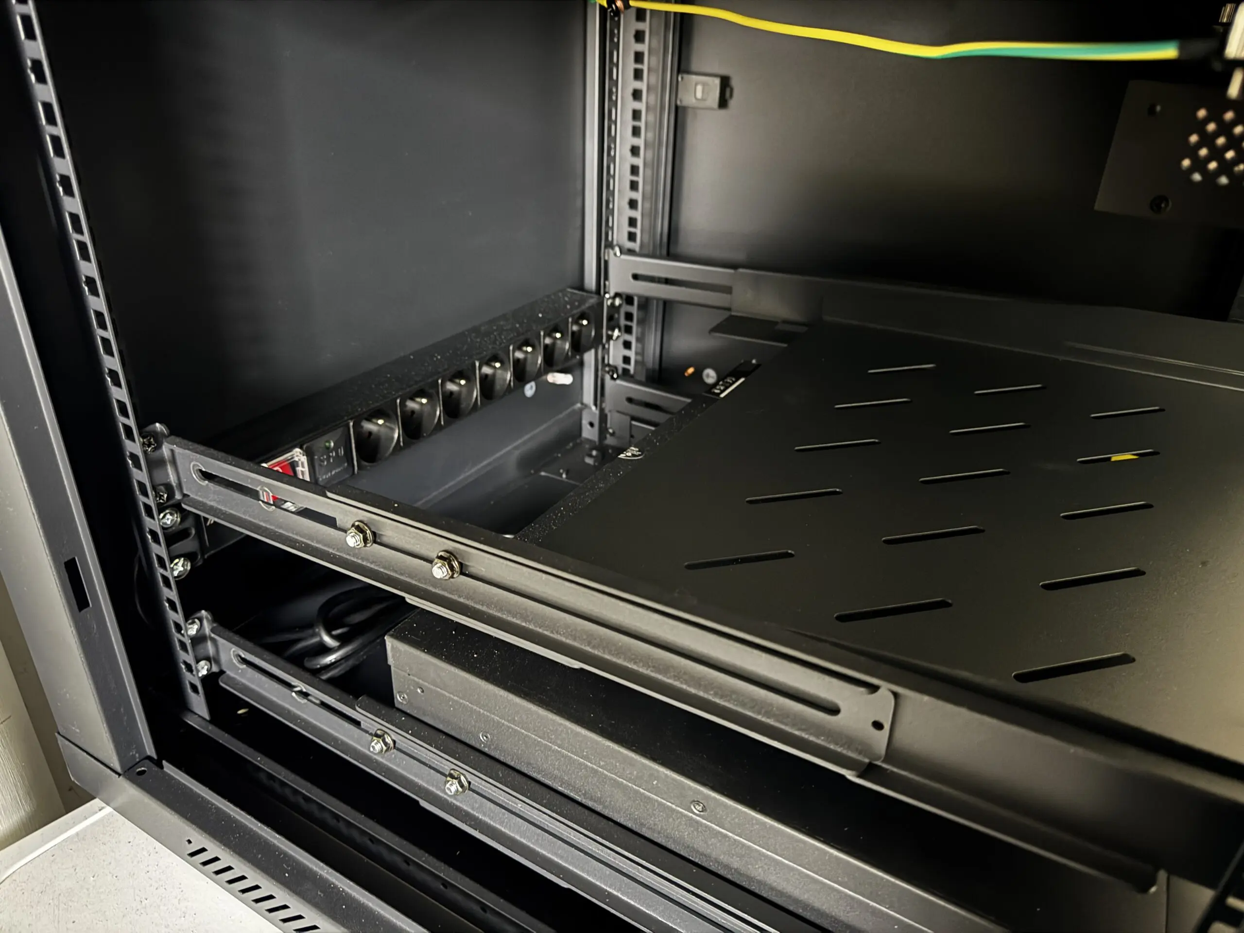 Patch panel, switch i UPS montują się bezpośrednio w szynach szafy. Ale jest jeden element, który montażu w szynach nie przewiduje – router. Do niego, oraz do ewentualnych urządzeń przyszłości, trafia metalowa półka 1U o udźwigu do 25 kg, montowana na czterech punktach.