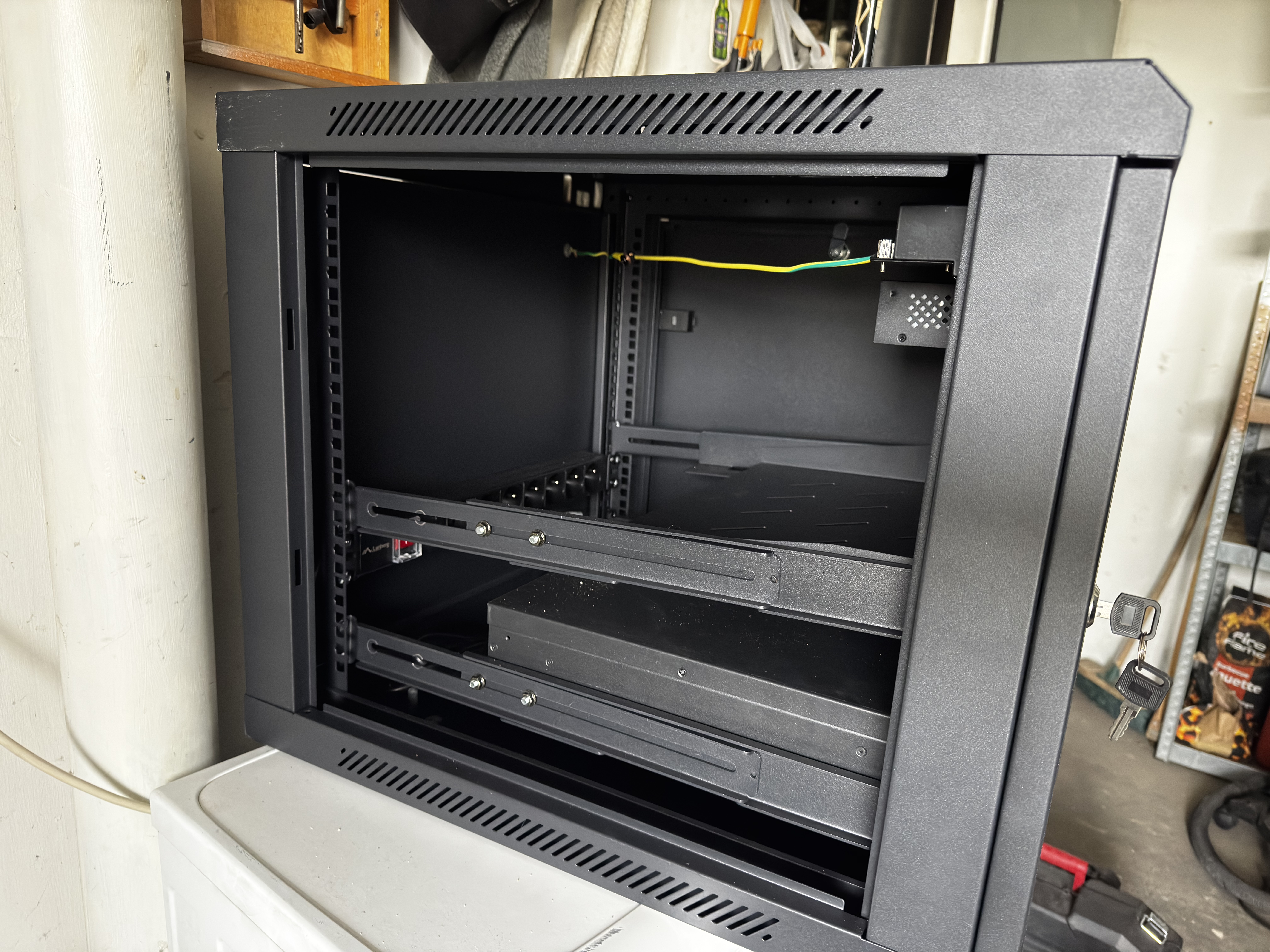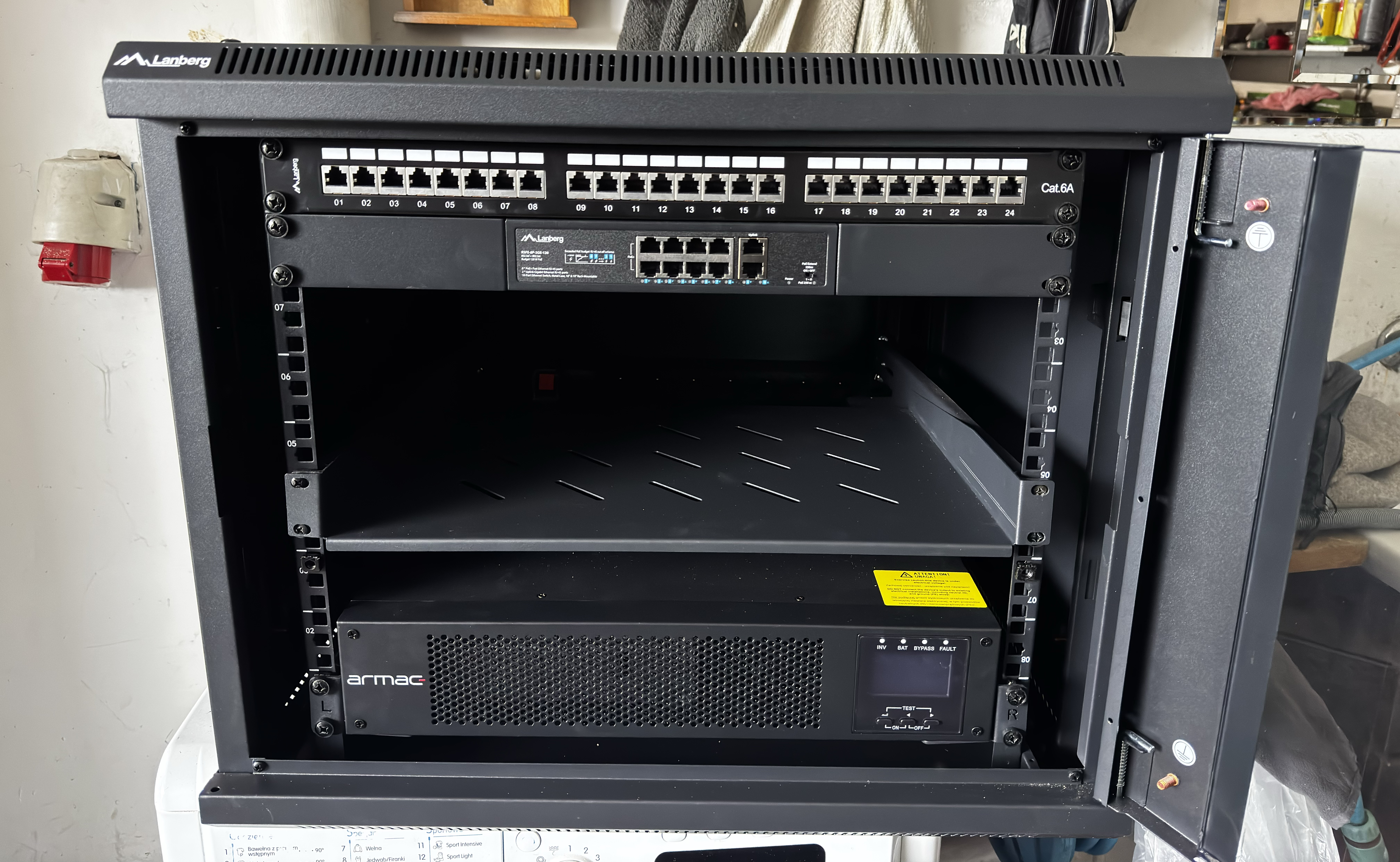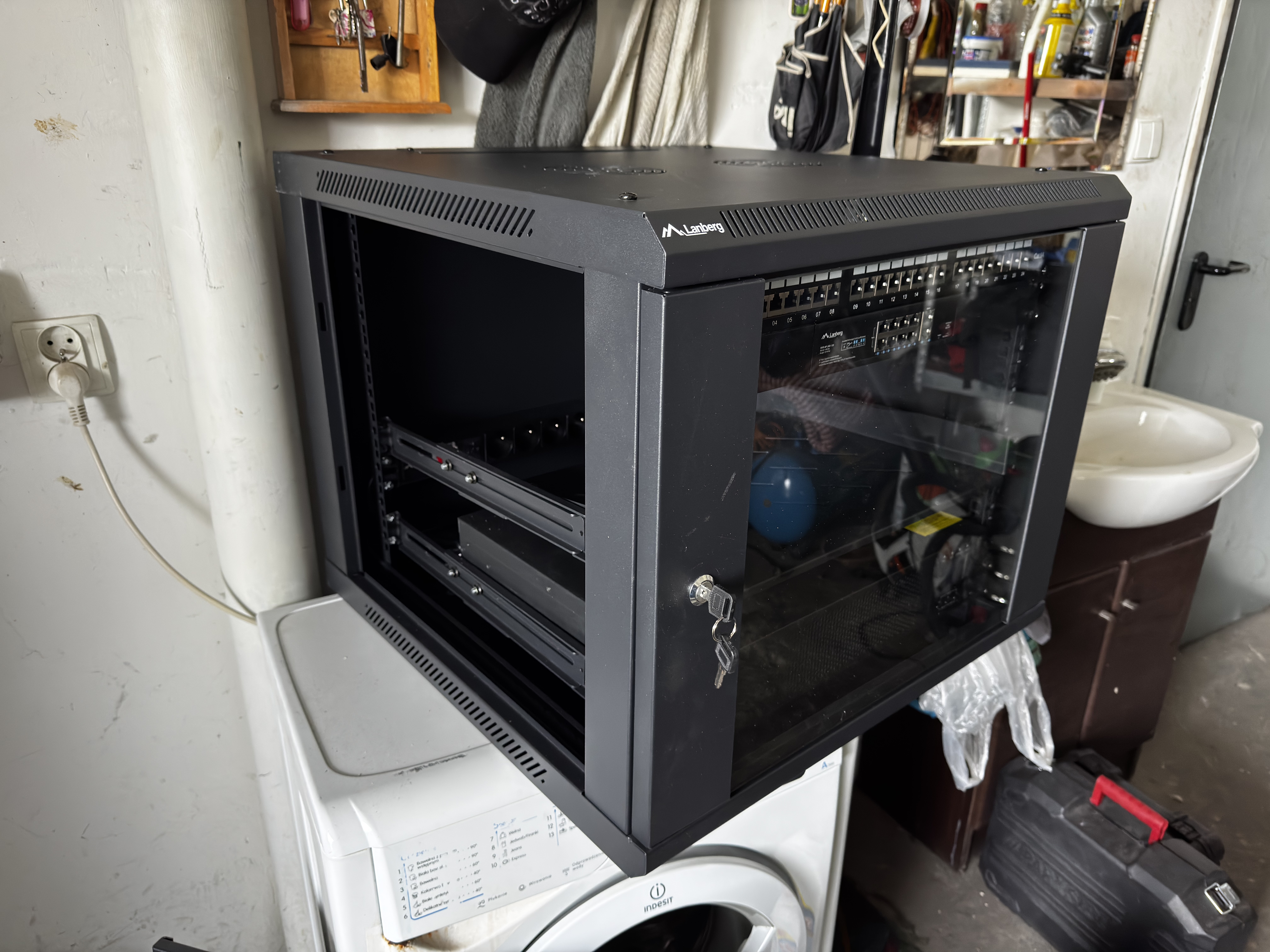 Na tym etapie szafa jest skręcona, stoi na regale w garażu, urządzenia czekają na wpięcie. To najspokojniejszy moment całego projektu.