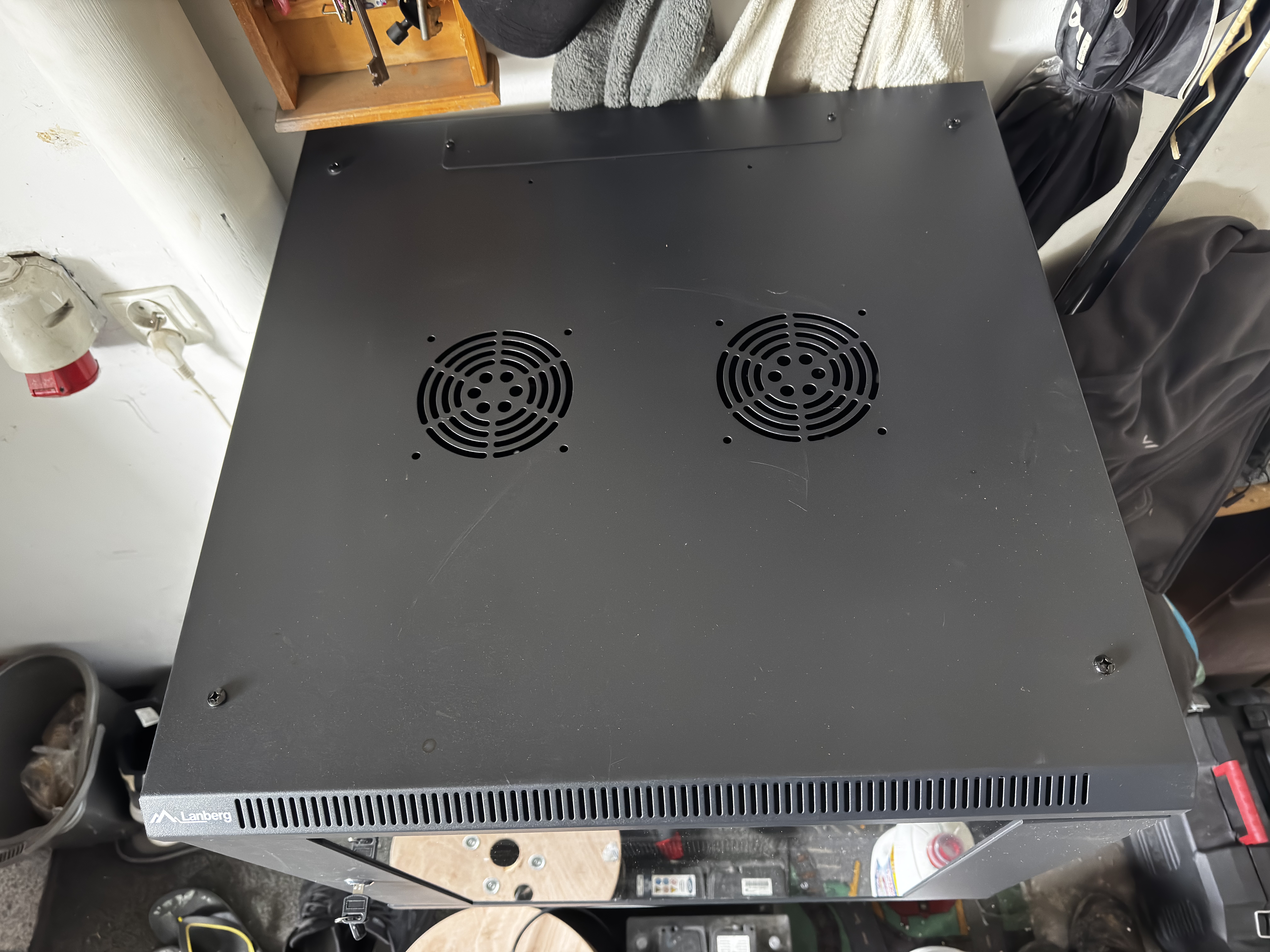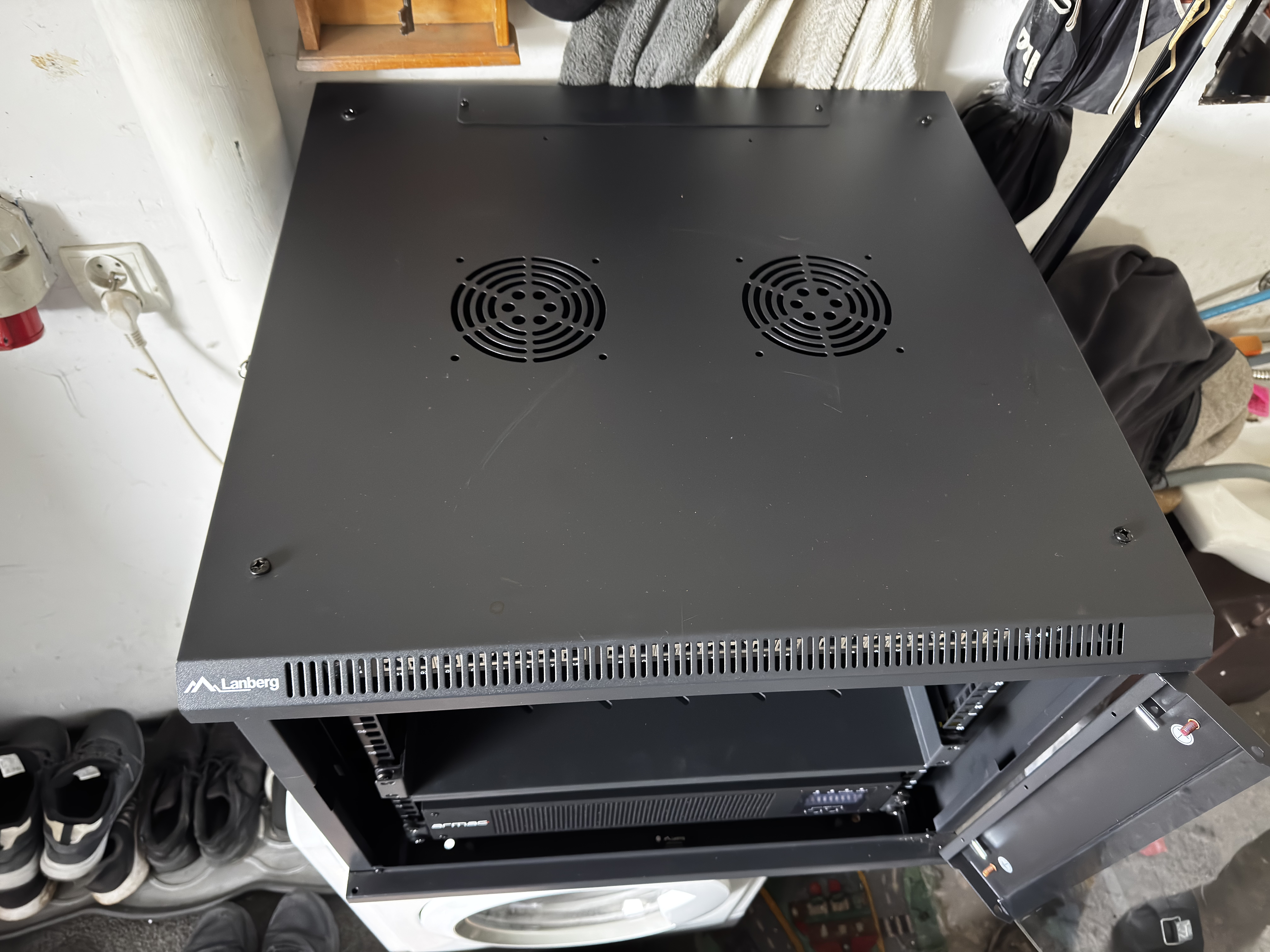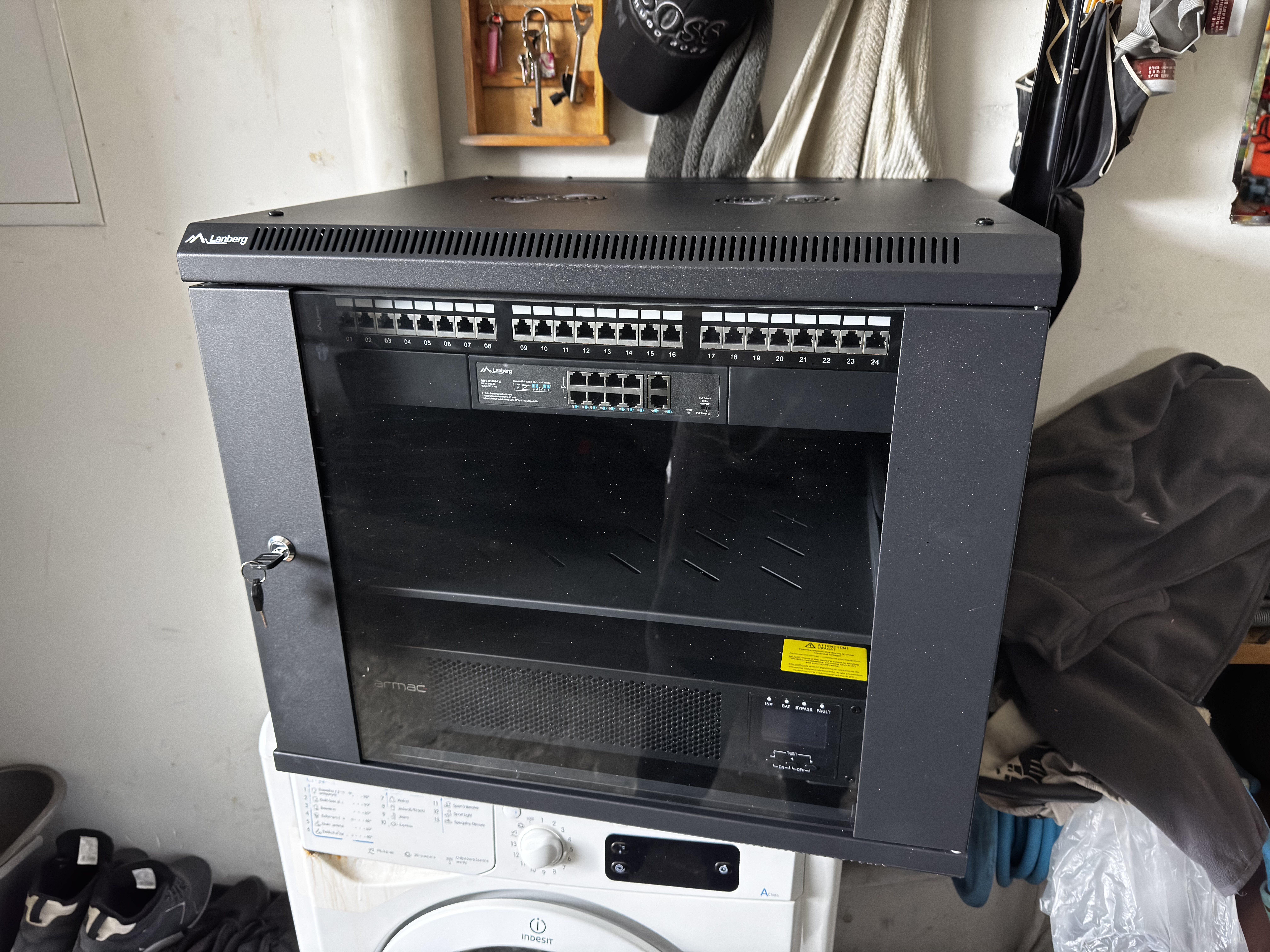 Na tym etapie szafa jest skręcona, stoi na regale w garażu, urządzenia czekają na wpięcie. To najspokojniejszy moment całego projektu.