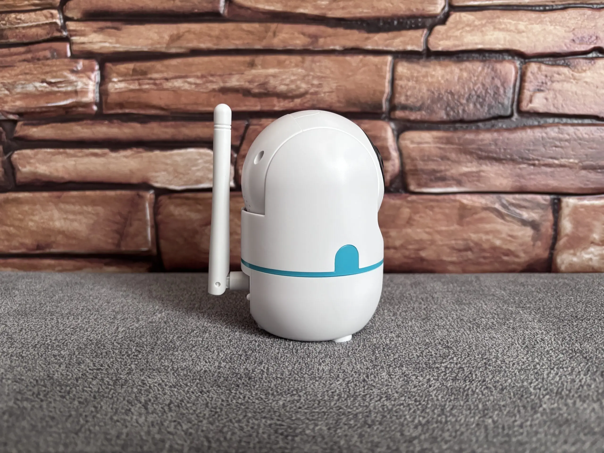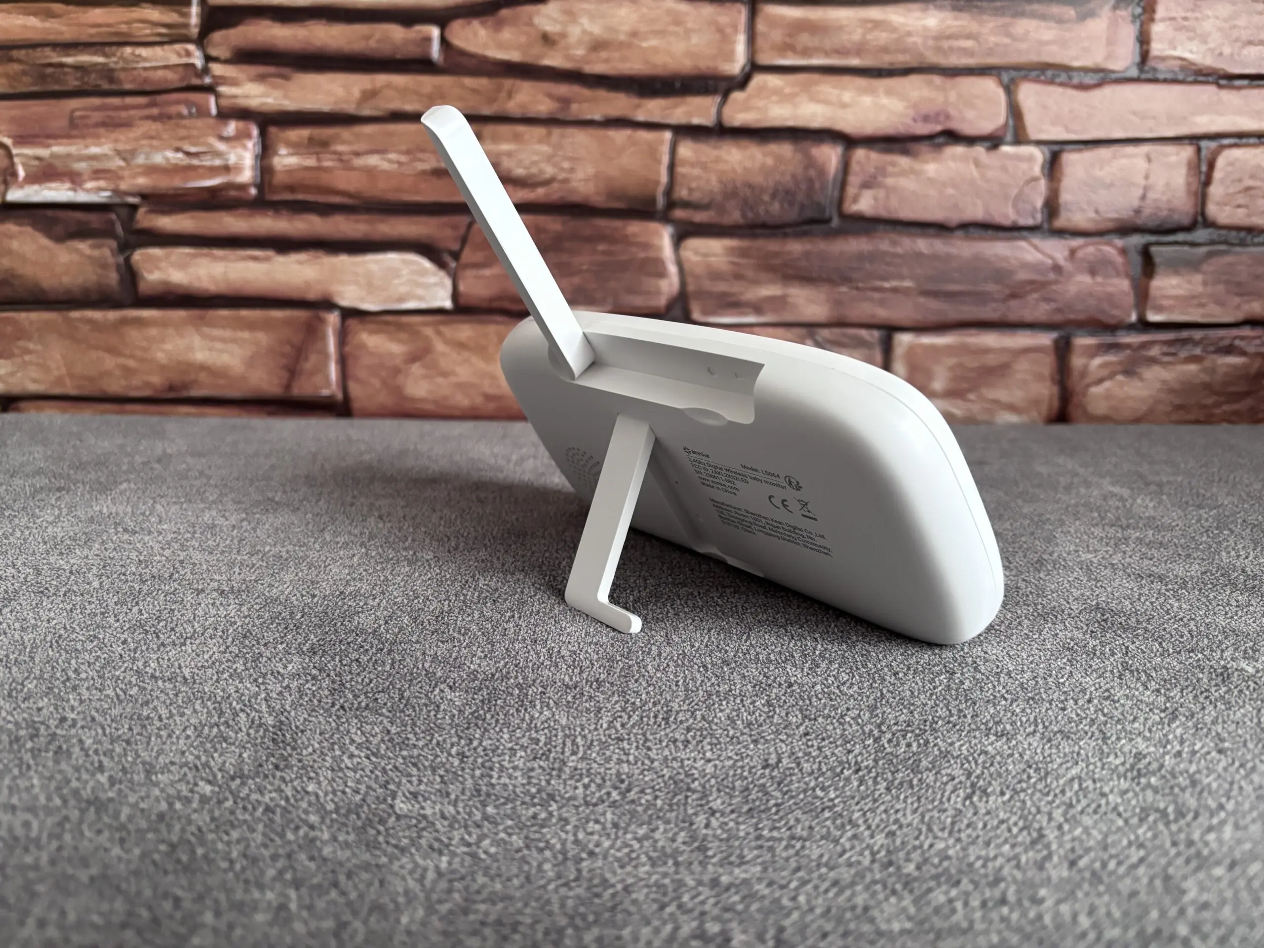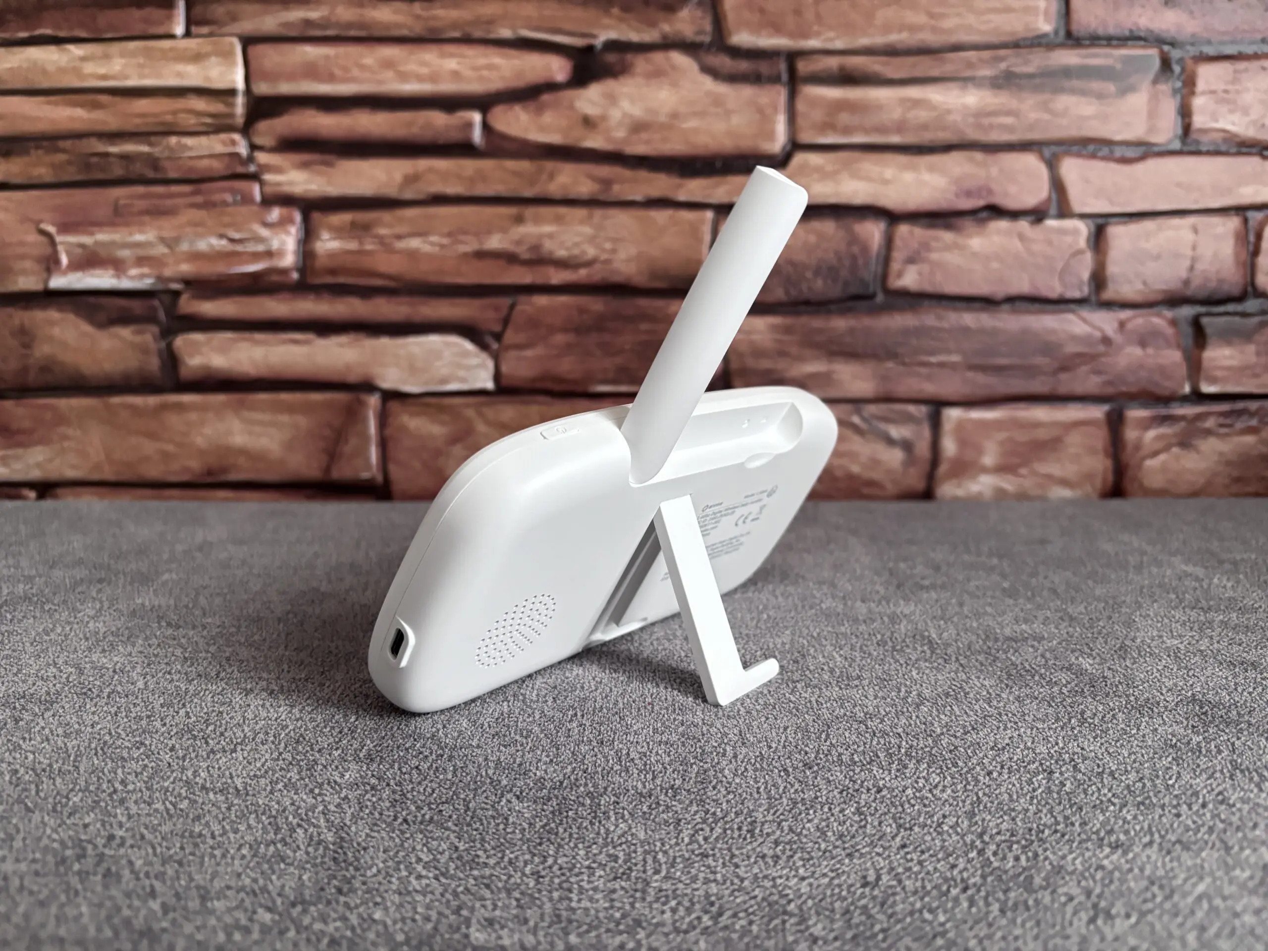 Konstrukcja opiera się na stabilnej podstawie, która umożliwia ustawienie kamery na półce lub komodzie. Dzięki możliwości montażu ściennego kamera może zostać umieszczona również wyżej, zapewniając optymalny kąt widzenia na całe łóżeczko.