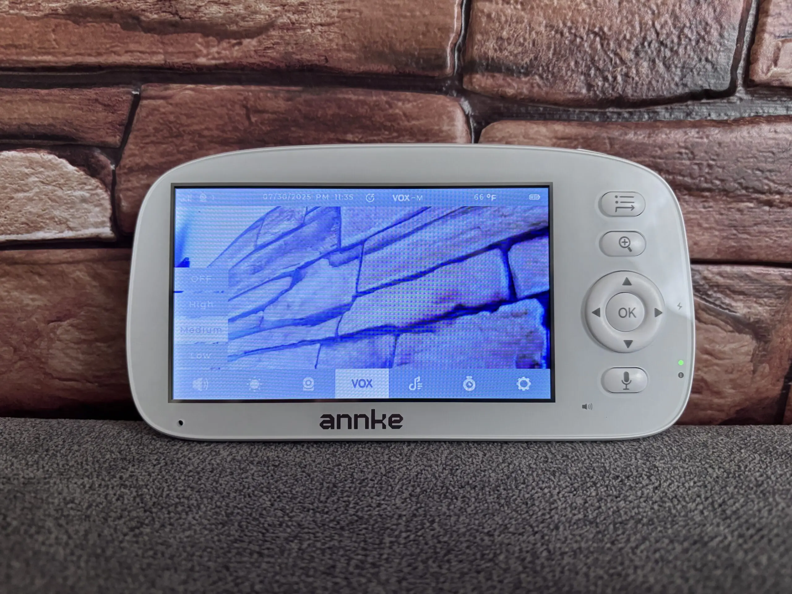 Jedną z najważniejszych funkcji monitora jest tryb VOX, który automatycznie wygasza ekran, gdy w pokoju dziecka panuje cisza. W momencie wykrycia dźwięku (trzy poziomy czułości dźwięku: 65dB, 70dB i 75dB), np. płaczu, ekran natychmiast się aktywuje, a rodzic otrzymuje sygnał dźwiękowy. Dodatkowo użytkownik może ustawić alarmy czasowe, np. przypomnienie o karmieniu lub kontroli dziecka.