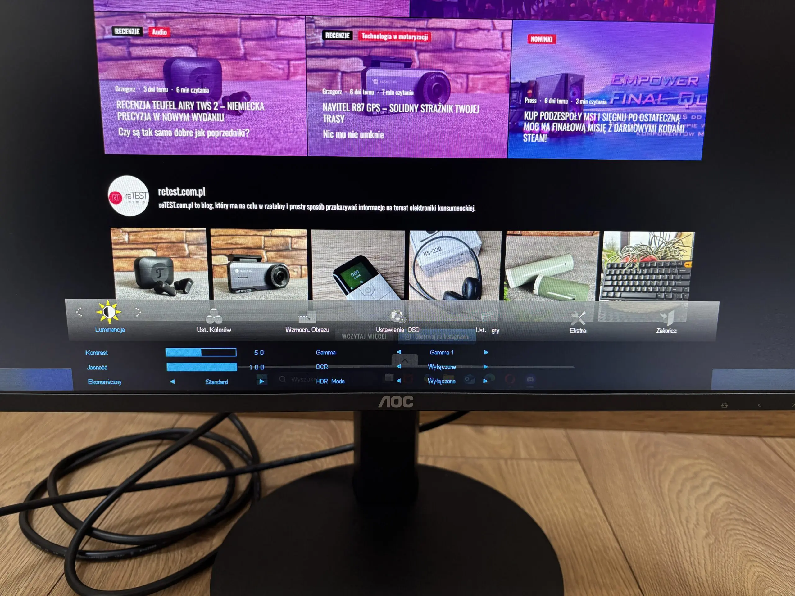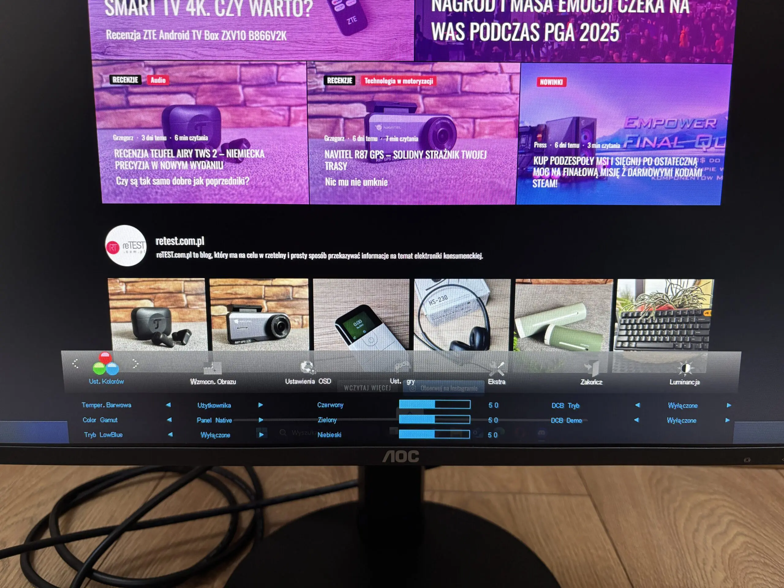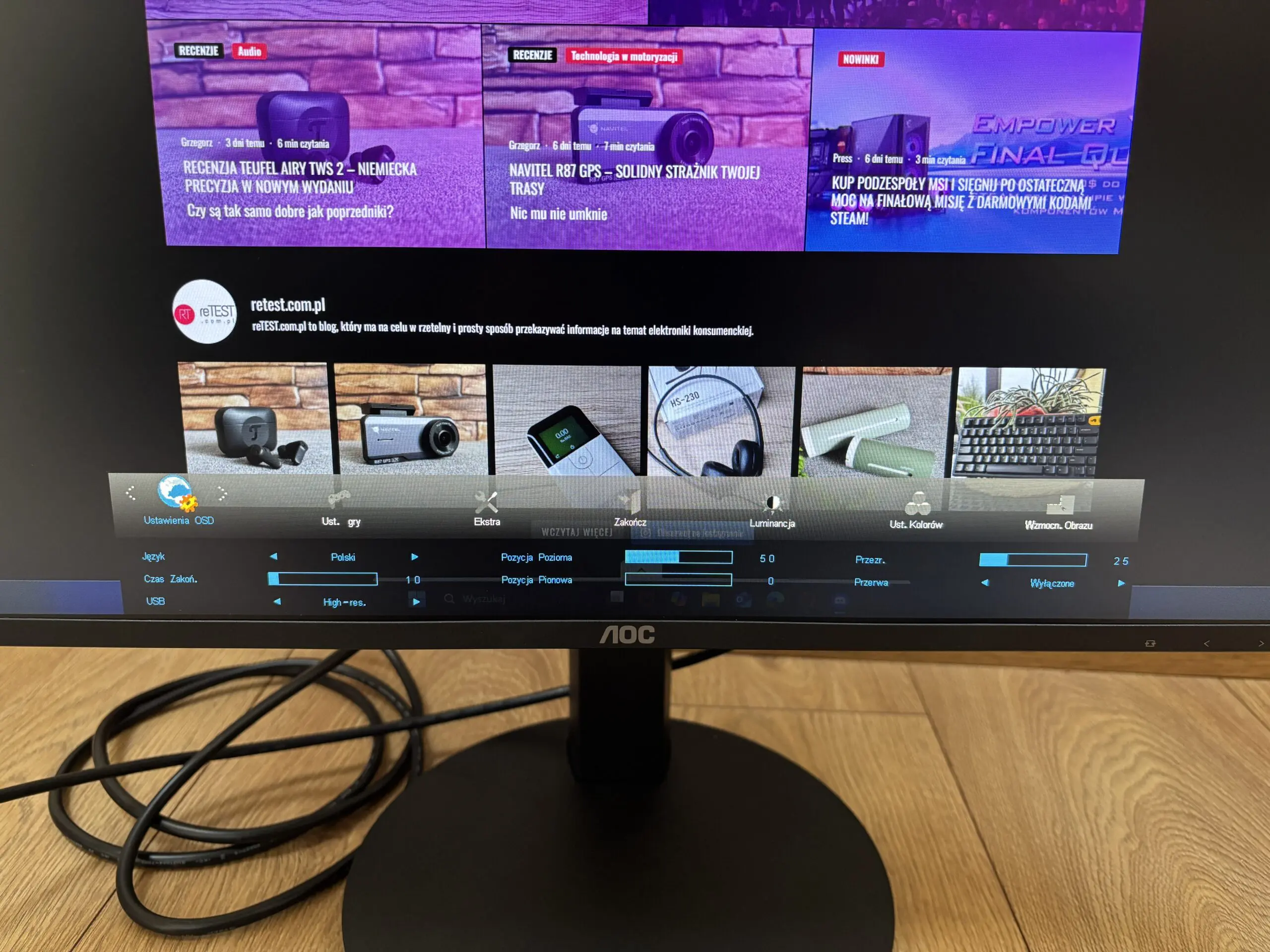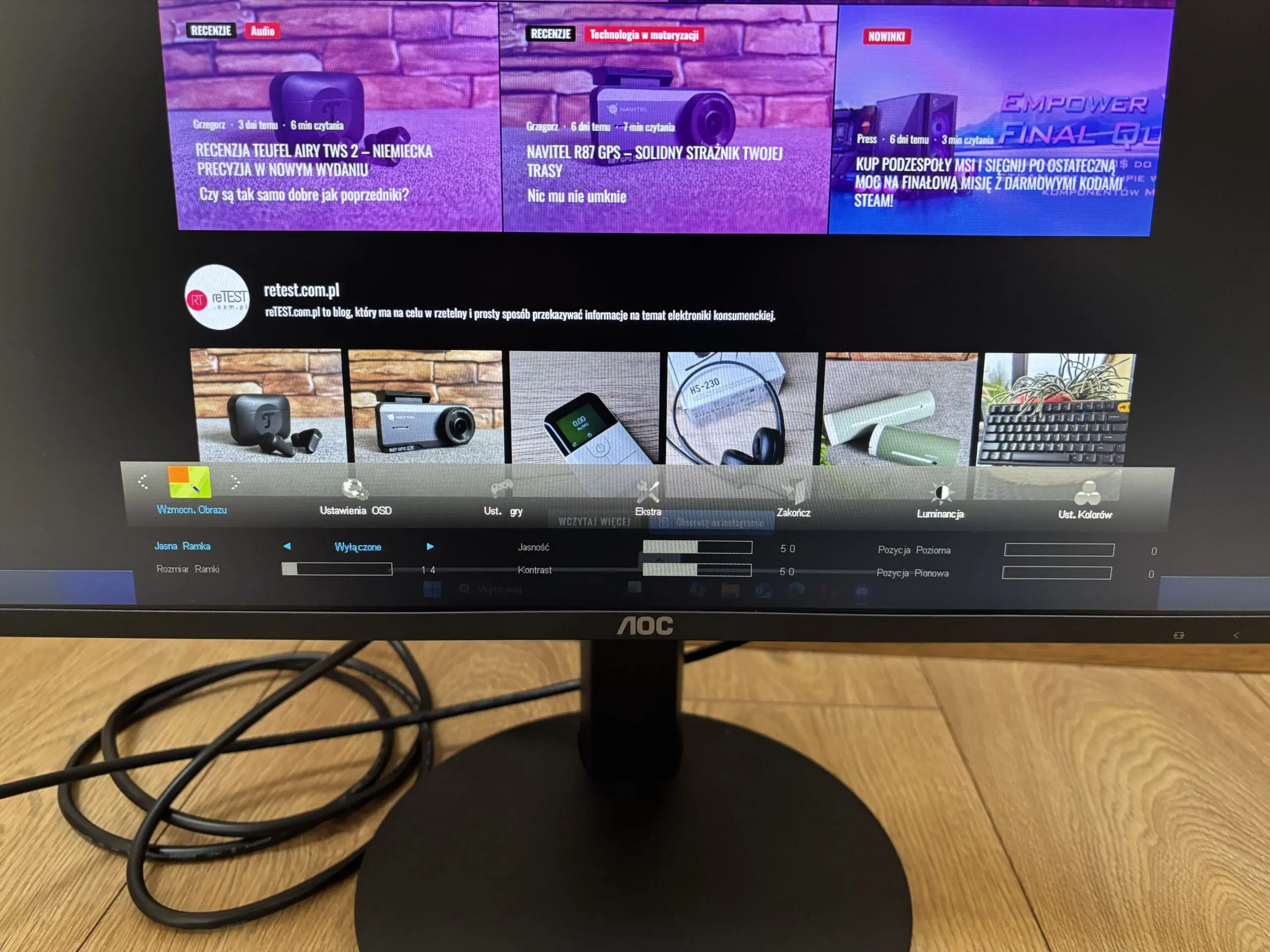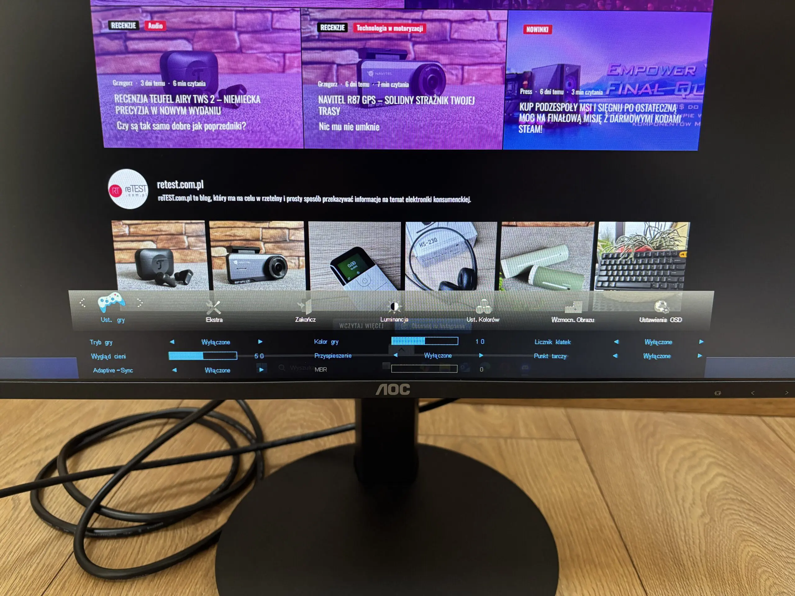 Samo menu działa poprawnie, choć jego obsługa nie jest najbardziej intuicyjna. Brakuje tu joysticka znanego z droższych modeli AOC – zamiast tego mamy klasyczne przyciski. Na początku wymaga to chwili przyzwyczajenia, bo czasem łatwo kliknąć nie ten przycisk, który chcieliśmy.