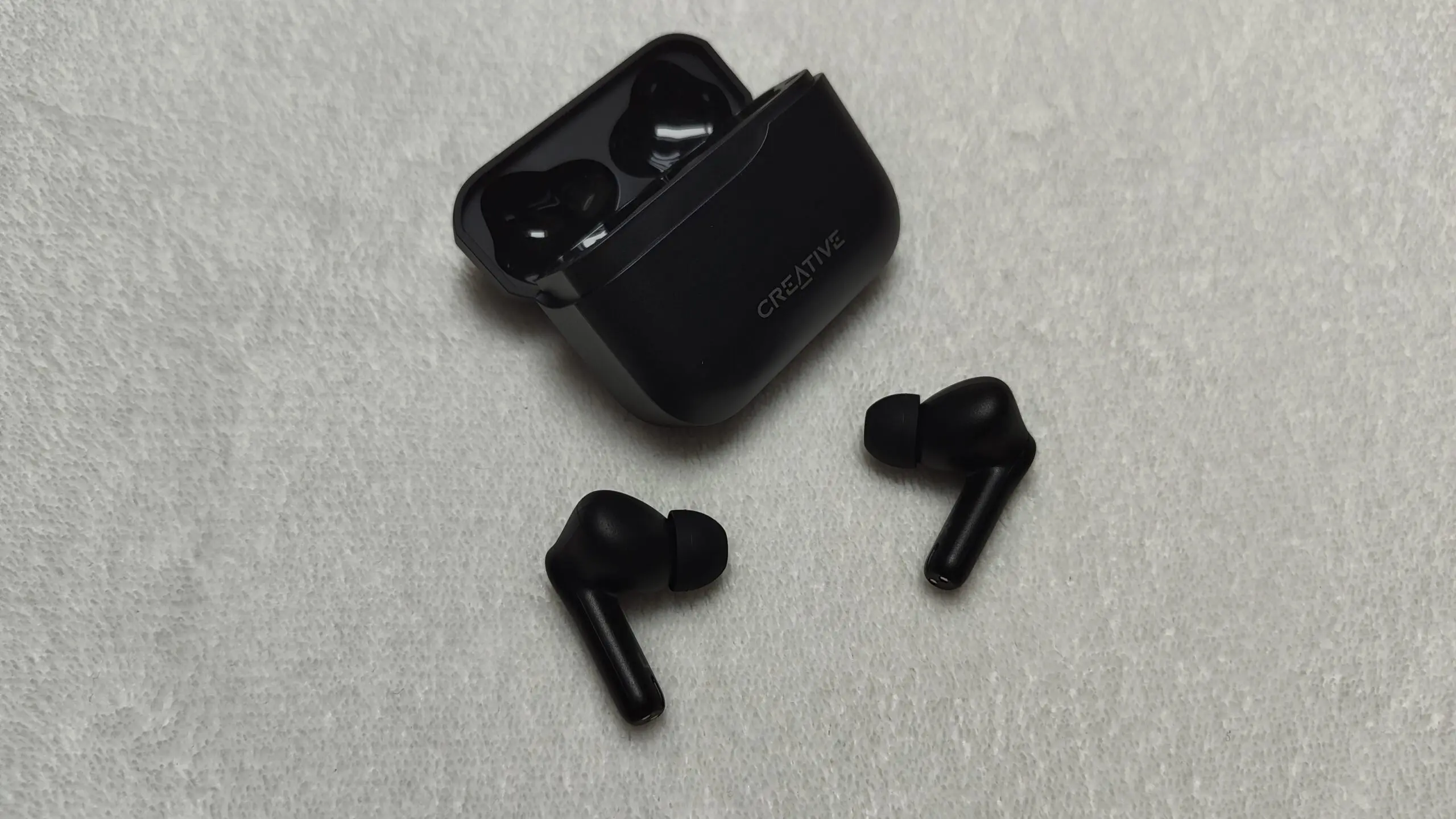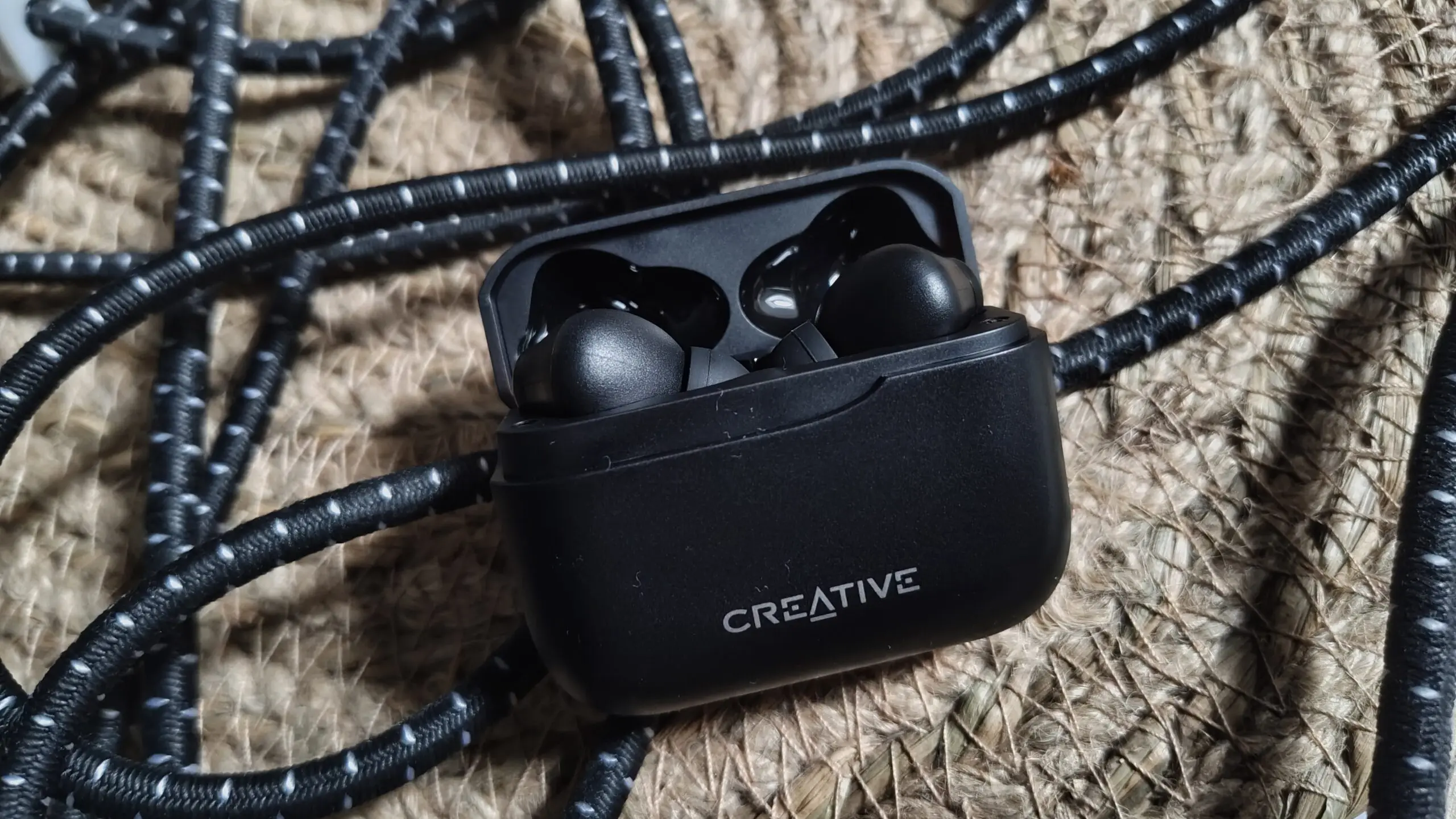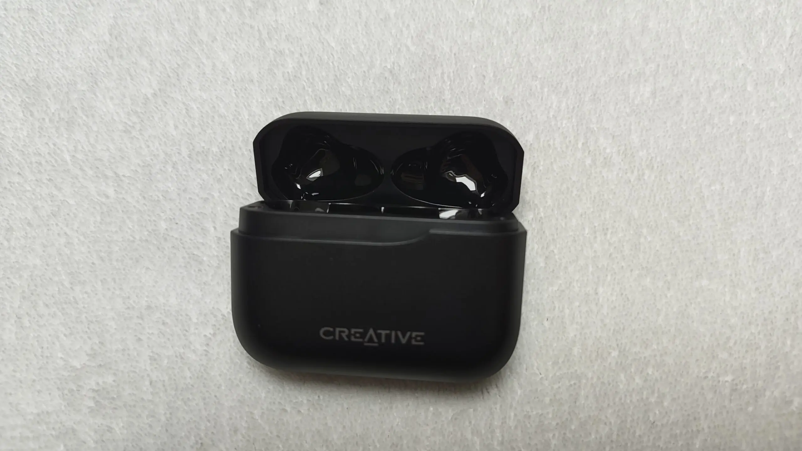 Creative postawił na prostotę i minimalizm. Czarny matowy plastik jest tylko gdzieniegdzie naznaczony szarymi napisami. Do tego etui ma delikatne wcięcie pod klapką (ale nie na niej samej), ot tak, żeby pudełko nie było zbyt nudne. Zaglądając do środka widzimy elementy z połyskującego plastiku oraz same słuchawki, które – co mnie zdziwiło – są dość długie i grube.