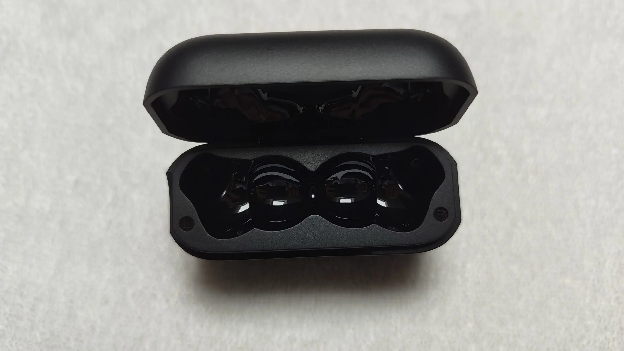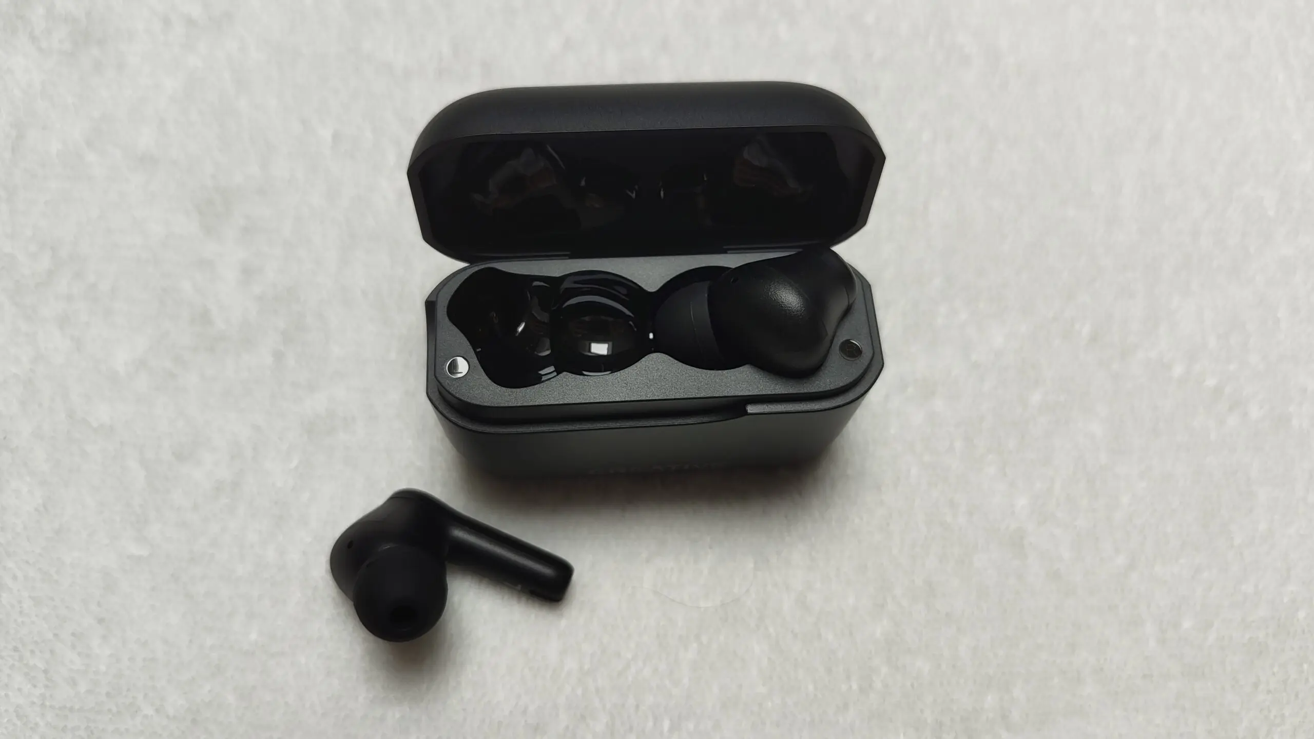 W kwestii trwałości i samych materiałów – jest dobrze, choć mogłoby być lepiej. Przede wszystkim zarówno słuchawki, jak i pudełko się nie palcują oraz nie widać specjalnie na urządzeniu rys od trzymania w kieszeni wraz z kluczami. Tutaj jest to zasługa w głównej mierze matowego czarnego plastiku, który jest dość wdzięczny, jeśli chodzi o utrzymywanie czystości i estetykę produktu. Niestety w środku pudełka, tam, gdzie przechowujemy słuchawki, jest już połyskujący plastik, na którym widać dosłownie wszystko, stąd też, jeśli chcecie je komuś pożyczyć, to lepiej dwa razy sprawdzić czystość wewnątrz etui.