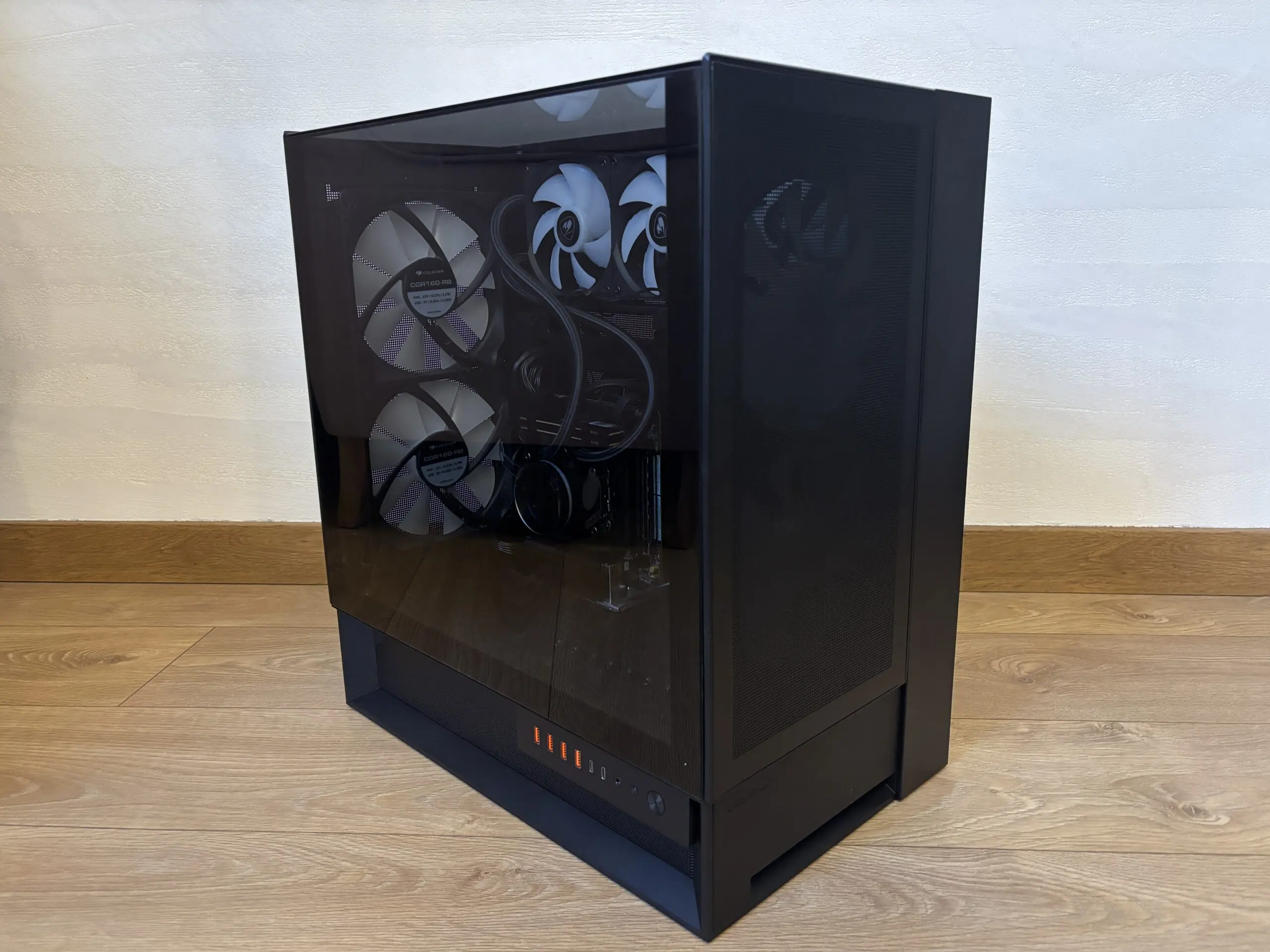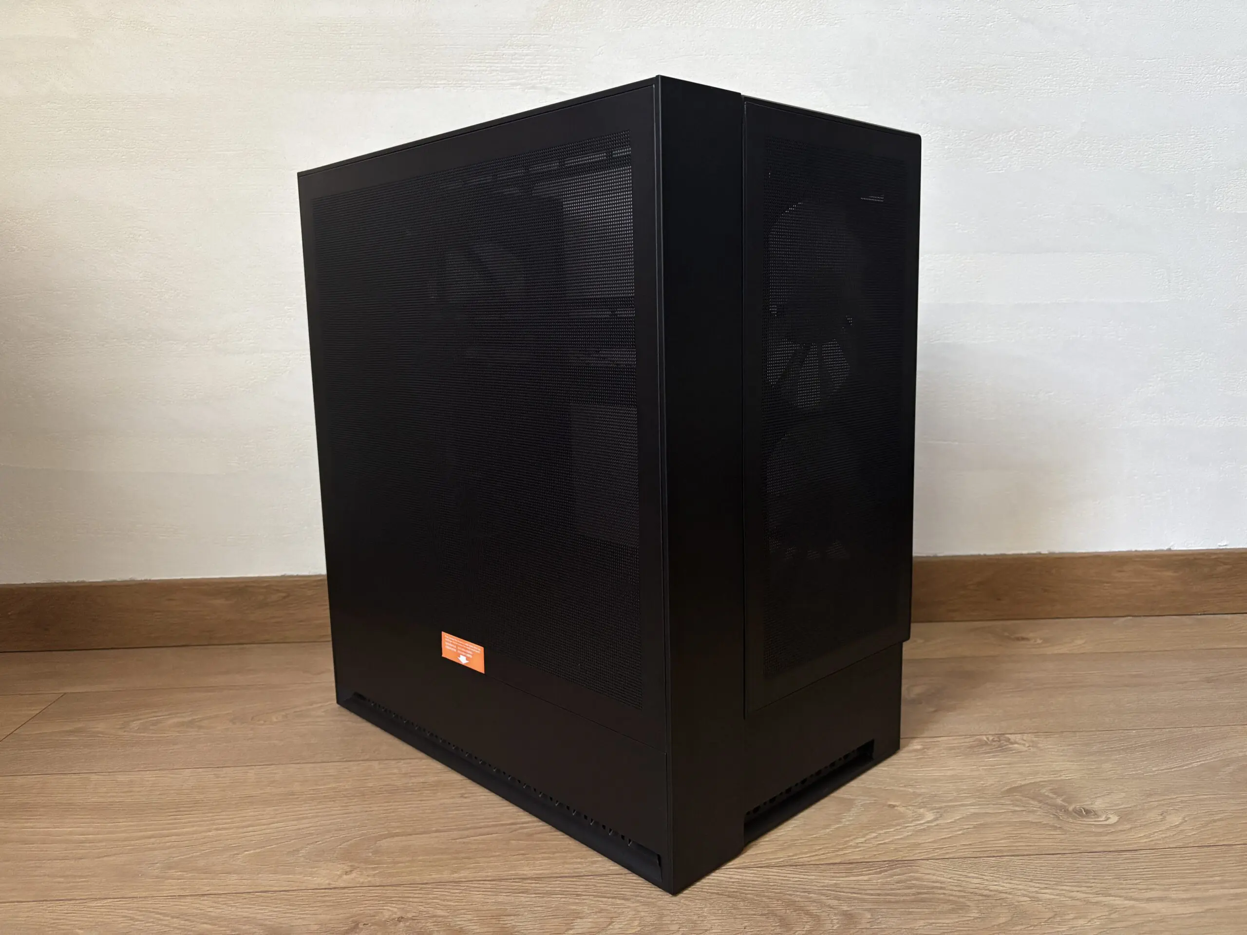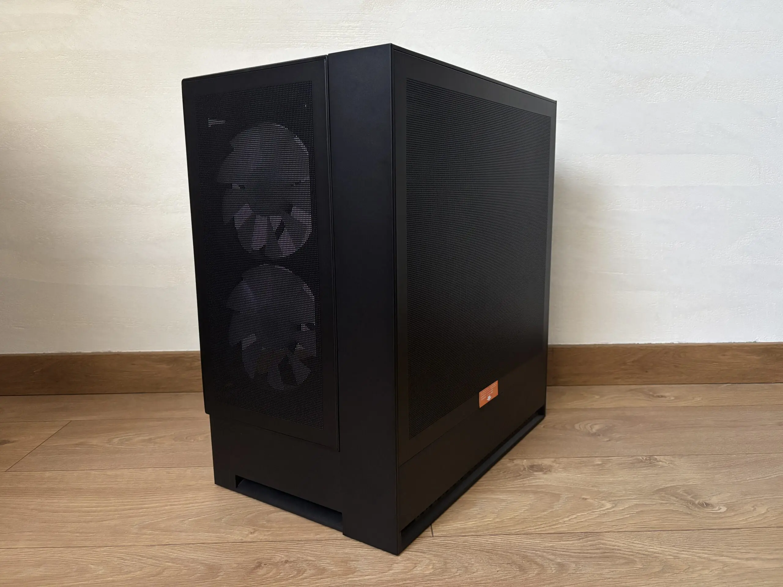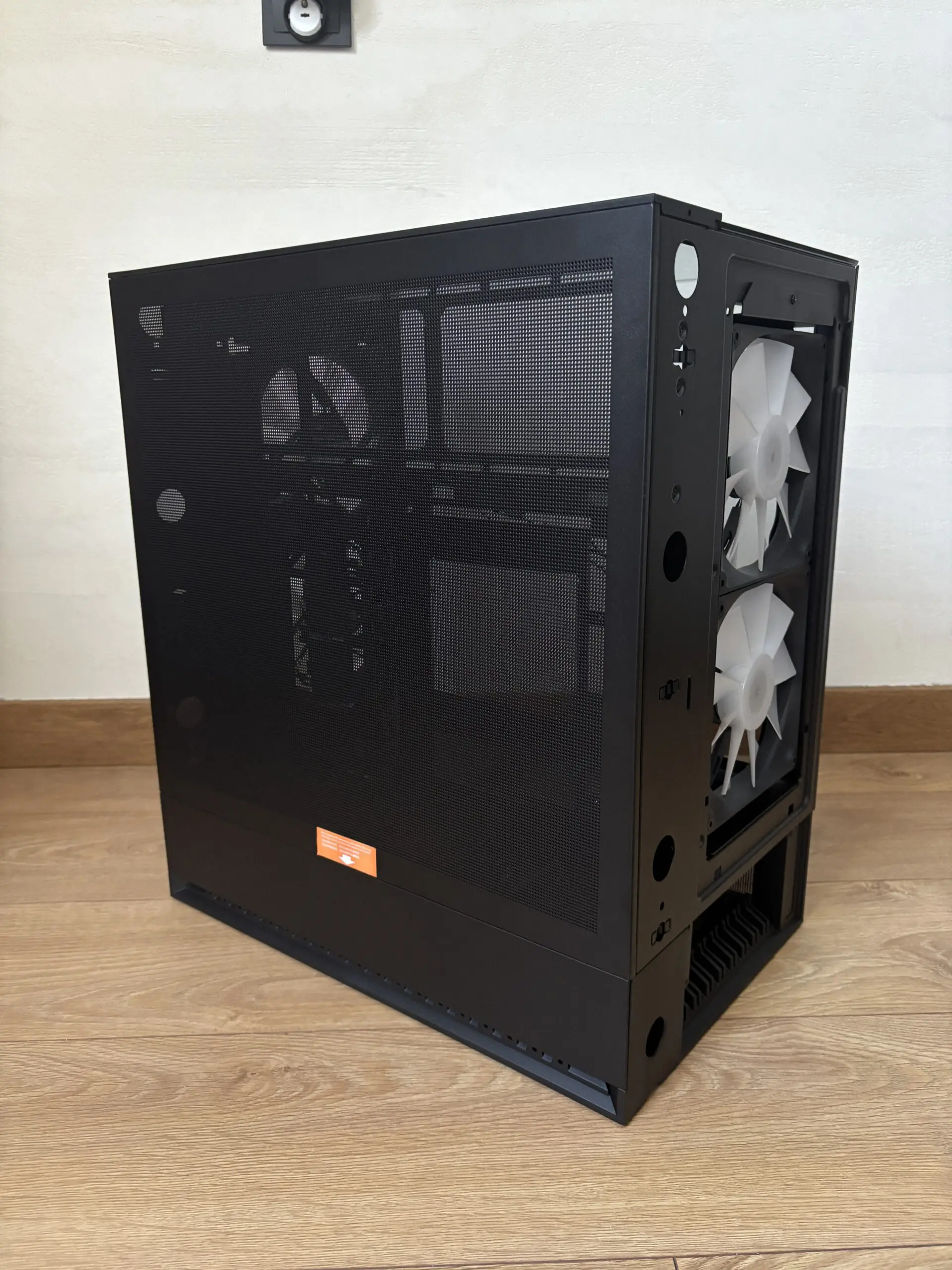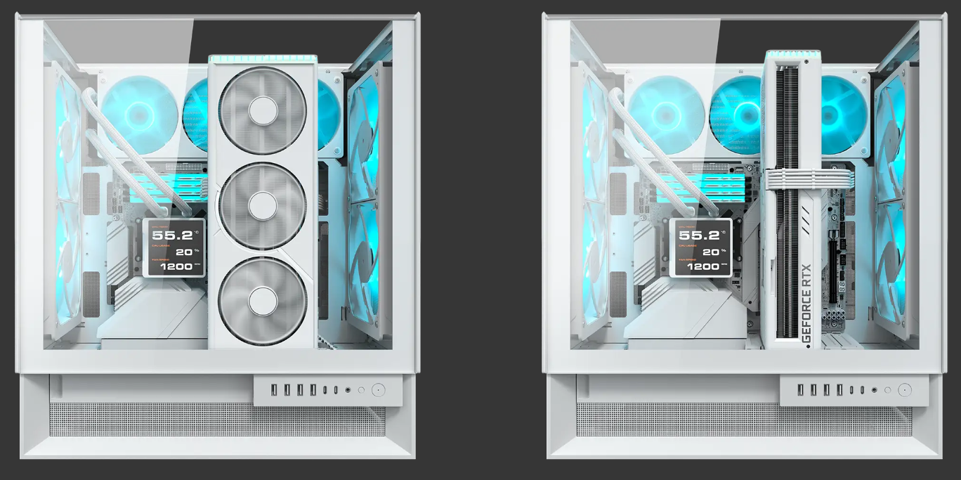 Początek recenzji i pierwsza zagwozdka jak to ubrać w słowa… OmnyX tak naprawdę nie posiada strony, którą jednoznacznie można nazwać frontem. Cechą charakterystyczną testowanego bohatera jest to, że można go umieścić zarówno po lewej i prawej stronie biurka. Jest to powiązane z autorską techniką Omnidirectional Dynamic Flow (ODF) czyli kluczową cechą OmnyX: obudowa została zaprojektowana tak, by zapewnić efektywny przepływ powietrza niezależnie od orientacji – stojąco, leżąco, czy inaczej. Symetria konstrukcji powoduje, że wentylatory są rozmieszczone równomiernie – obie strony (przód / tył) są lustrzanym odbiciem – co sprawia, że niezależnie od tego, którą stroną skierujesz obudowę, masz efektywny „napływ i wylot” powietrza. To daje dużą elastyczność przy aranżowaniu biurka – można ustawić obudowę praktycznie w dowolnej konfiguracji. Tak opis tej technologii przedstawia producenta. A jak to wygląda? Jak na zdjęciach poniżej: