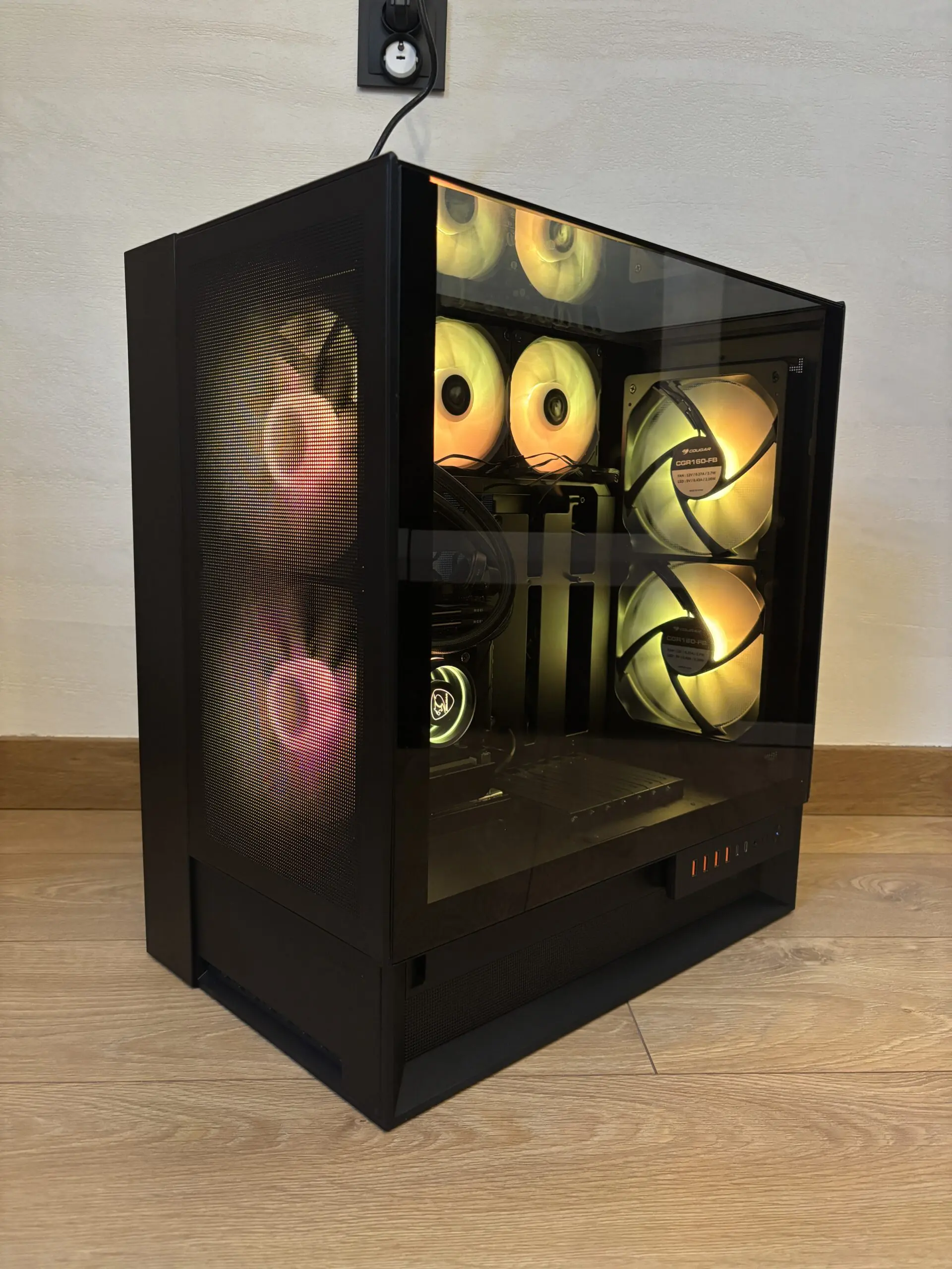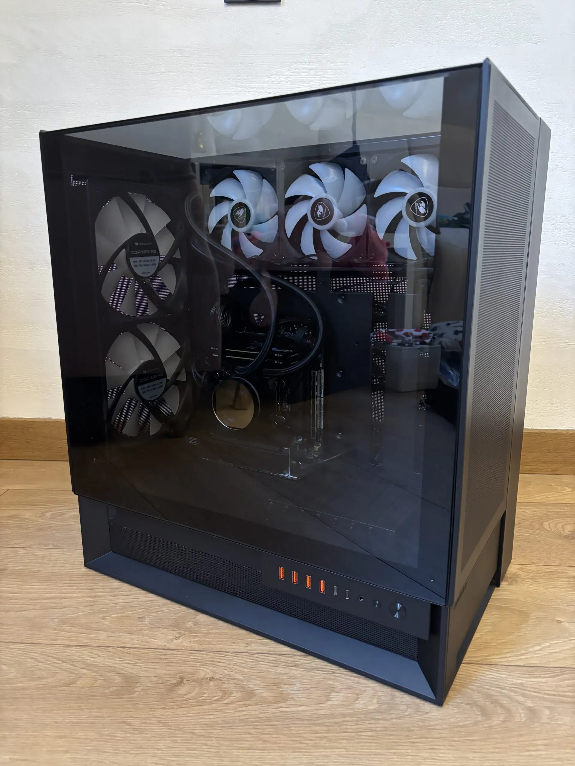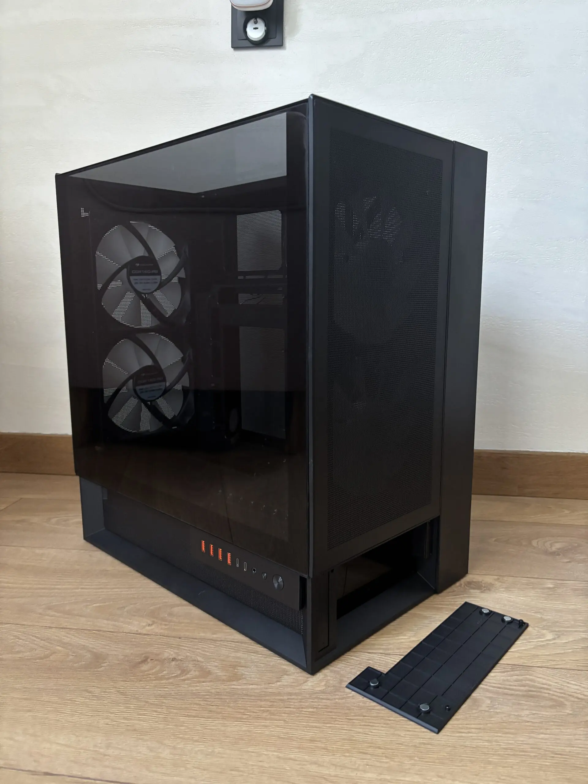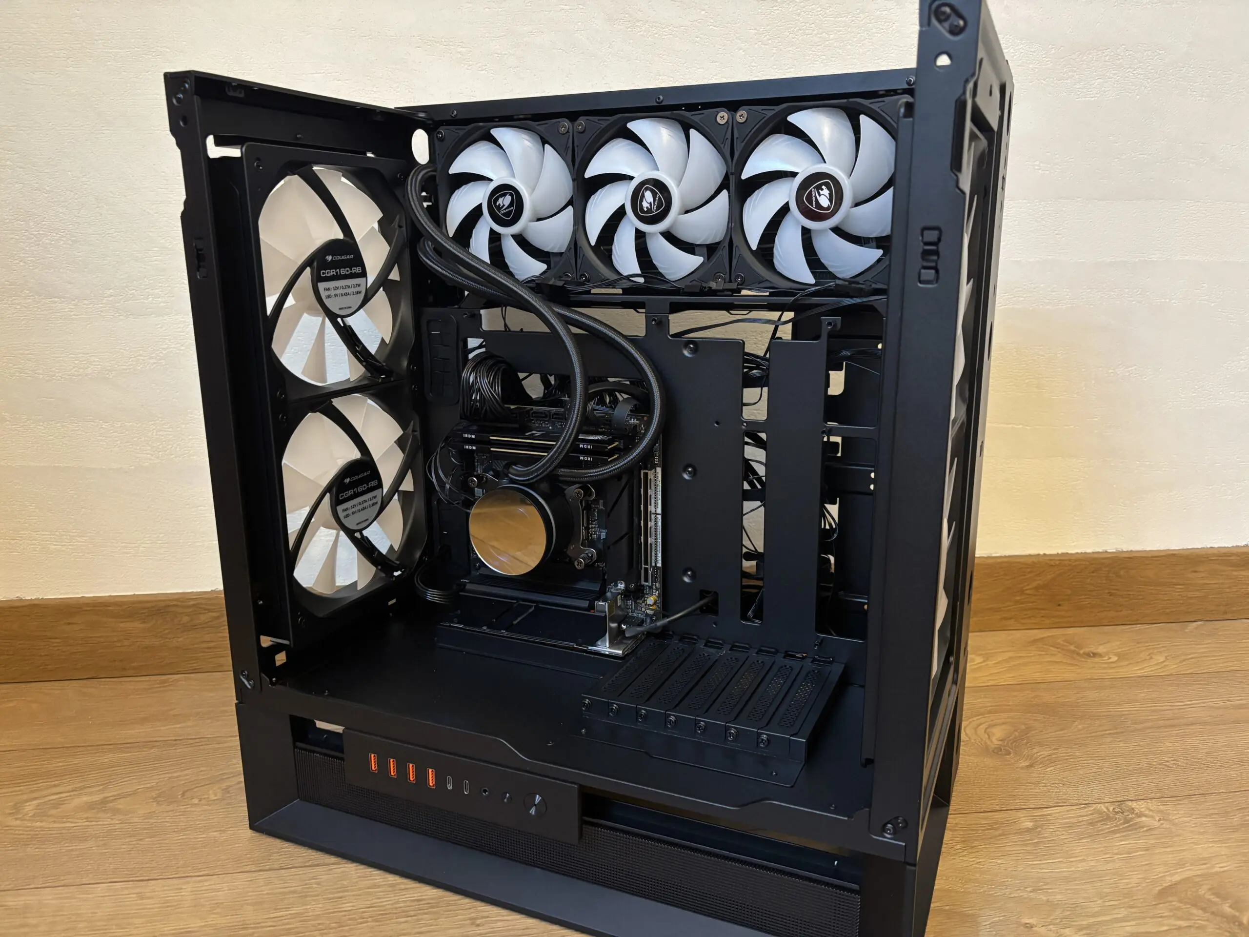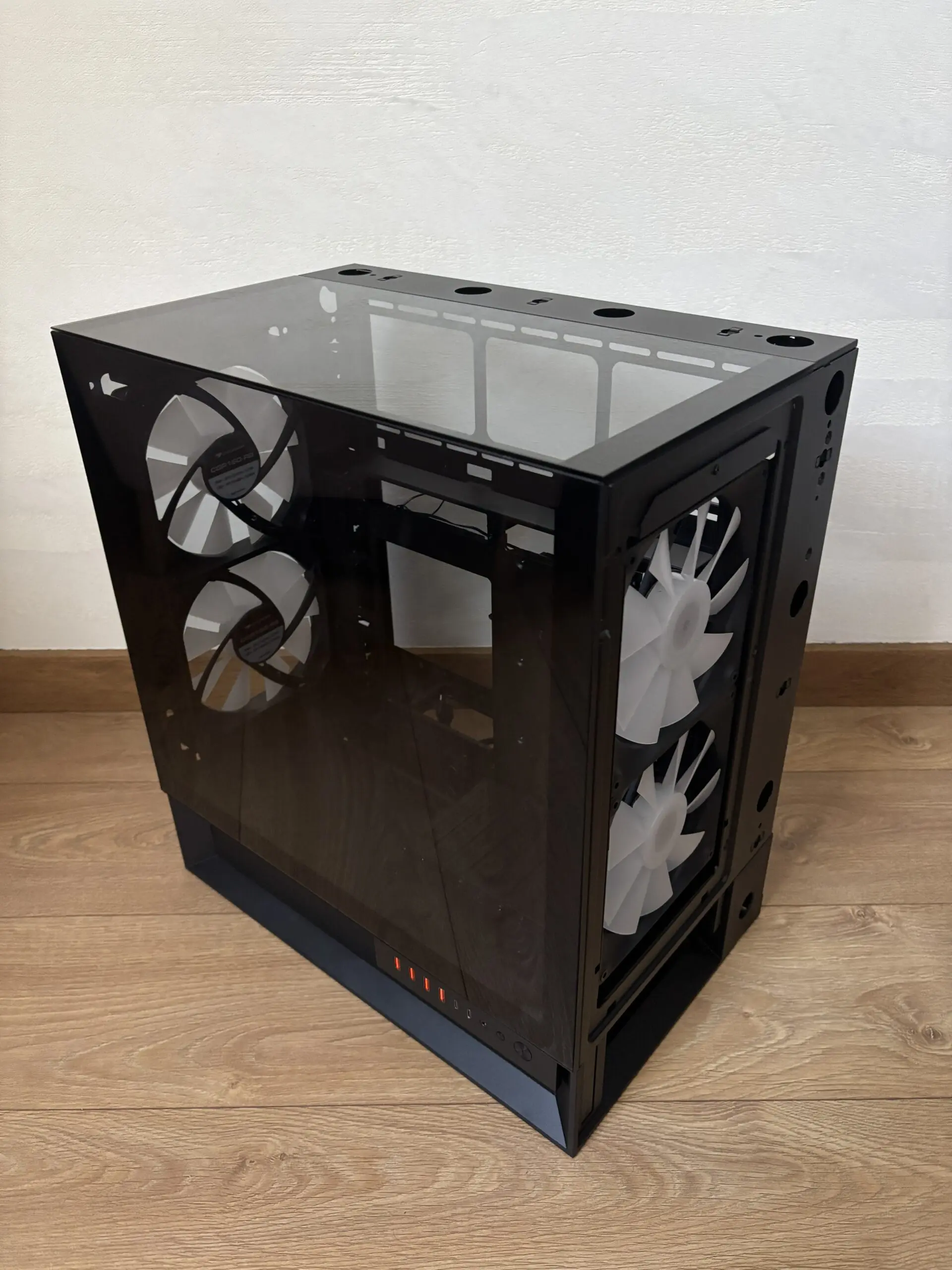 Początek recenzji i pierwsza zagwozdka jak to ubrać w słowa… OmnyX tak naprawdę nie posiada strony, którą jednoznacznie można nazwać frontem. Cechą charakterystyczną testowanego bohatera jest to, że można go umieścić zarówno po lewej i prawej stronie biurka. Jest to powiązane z autorską techniką Omnidirectional Dynamic Flow (ODF) czyli kluczową cechą OmnyX: obudowa została zaprojektowana tak, by zapewnić efektywny przepływ powietrza niezależnie od orientacji – stojąco, leżąco, czy inaczej. Symetria konstrukcji powoduje, że wentylatory są rozmieszczone równomiernie – obie strony (przód / tył) są lustrzanym odbiciem – co sprawia, że niezależnie od tego, którą stroną skierujesz obudowę, masz efektywny „napływ i wylot” powietrza. To daje dużą elastyczność przy aranżowaniu biurka – można ustawić obudowę praktycznie w dowolnej konfiguracji. Tak opis tej technologii przedstawia producenta. A jak to wygląda? Jak na zdjęciach poniżej: