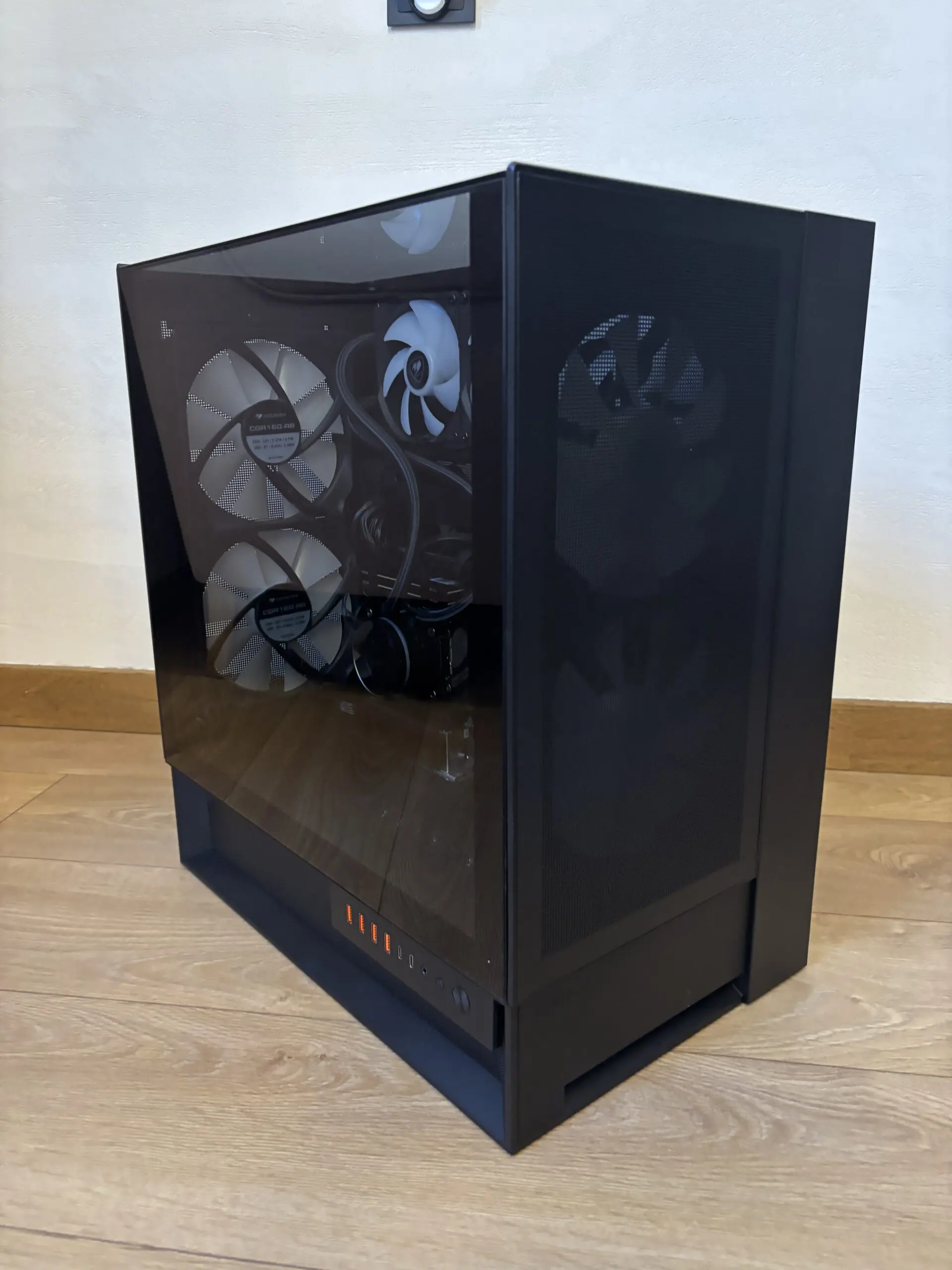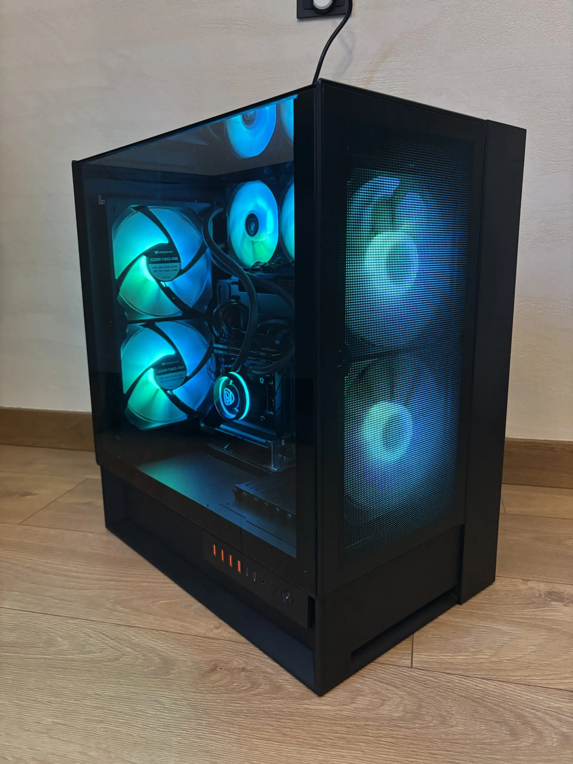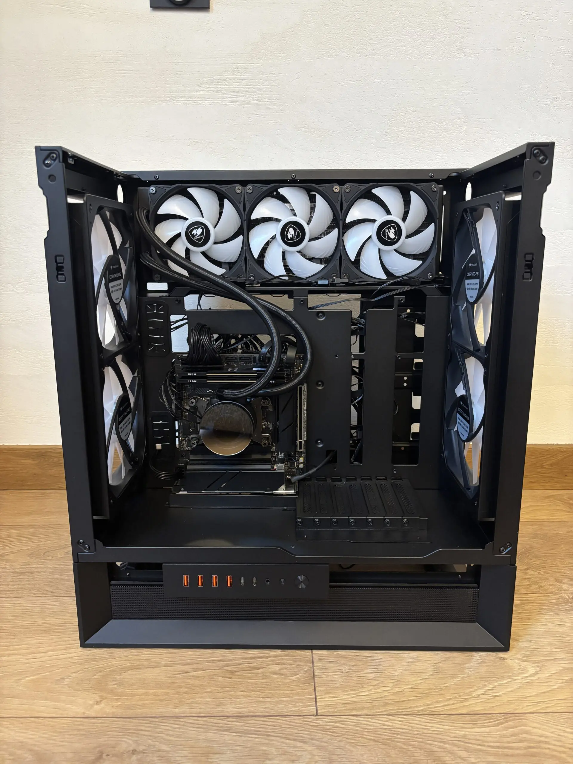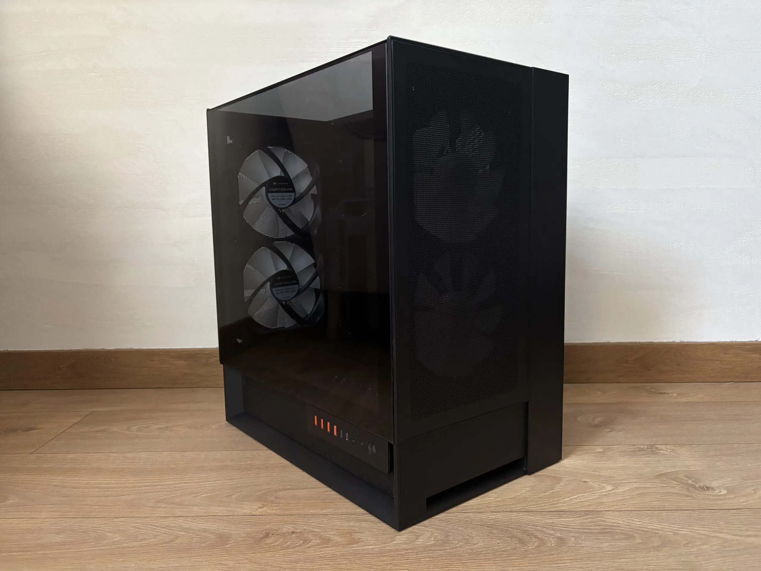 Początek recenzji i pierwsza zagwozdka jak to ubrać w słowa… OmnyX tak naprawdę nie posiada strony, którą jednoznacznie można nazwać frontem. Cechą charakterystyczną testowanego bohatera jest to, że można go umieścić zarówno po lewej i prawej stronie biurka. Jest to powiązane z autorską techniką Omnidirectional Dynamic Flow (ODF) czyli kluczową cechą OmnyX: obudowa została zaprojektowana tak, by zapewnić efektywny przepływ powietrza niezależnie od orientacji – stojąco, leżąco, czy inaczej. Symetria konstrukcji powoduje, że wentylatory są rozmieszczone równomiernie – obie strony (przód / tył) są lustrzanym odbiciem – co sprawia, że niezależnie od tego, którą stroną skierujesz obudowę, masz efektywny „napływ i wylot” powietrza. To daje dużą elastyczność przy aranżowaniu biurka – można ustawić obudowę praktycznie w dowolnej konfiguracji. Tak opis tej technologii przedstawia producenta. A jak to wygląda? Jak na zdjęciach poniżej: