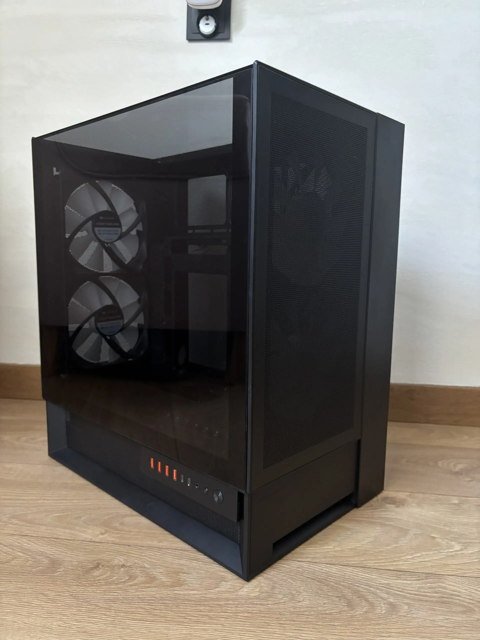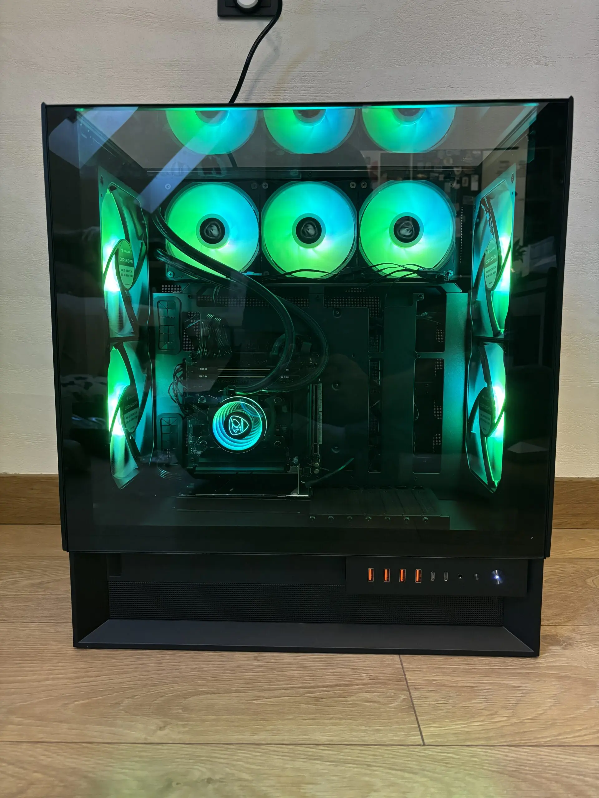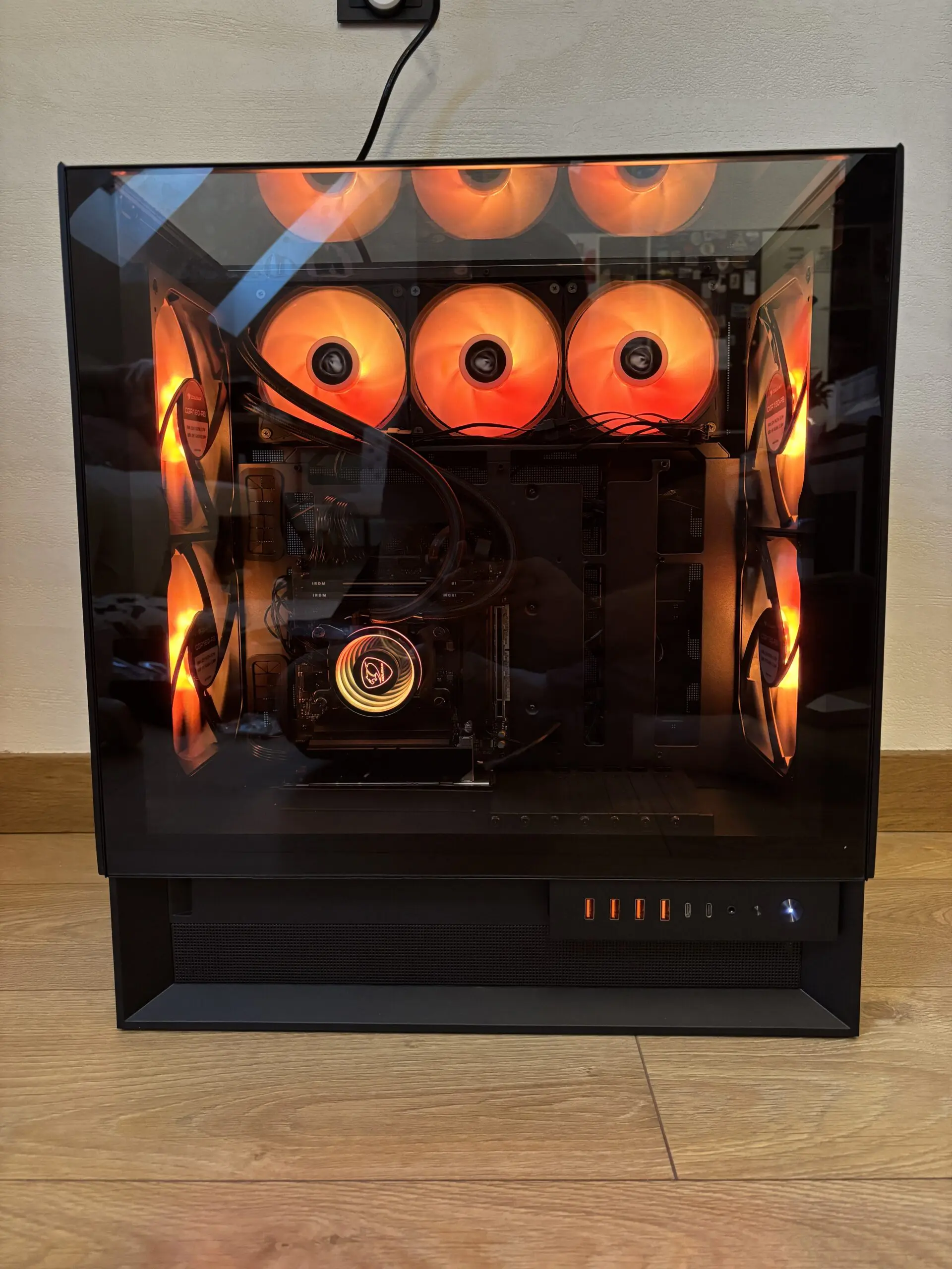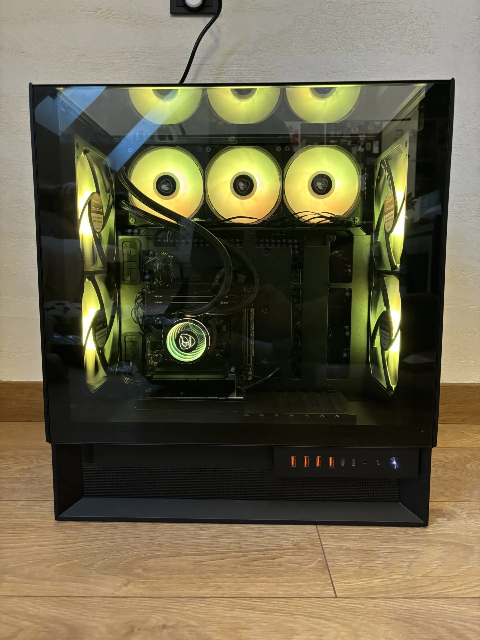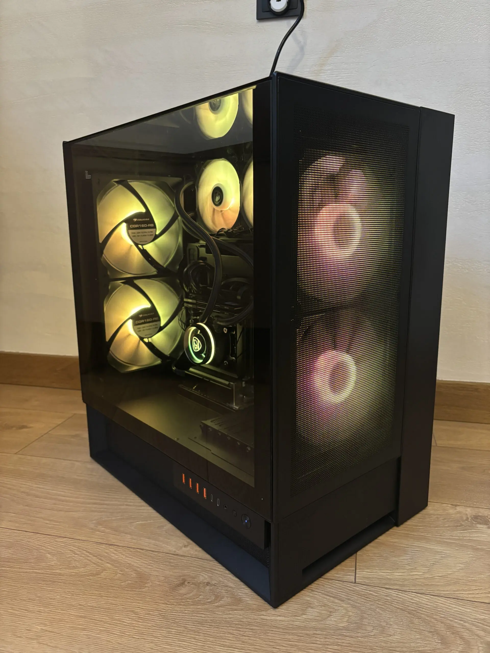 Początek recenzji i pierwsza zagwozdka jak to ubrać w słowa… OmnyX tak naprawdę nie posiada strony, którą jednoznacznie można nazwać frontem. Cechą charakterystyczną testowanego bohatera jest to, że można go umieścić zarówno po lewej i prawej stronie biurka. Jest to powiązane z autorską techniką Omnidirectional Dynamic Flow (ODF) czyli kluczową cechą OmnyX: obudowa została zaprojektowana tak, by zapewnić efektywny przepływ powietrza niezależnie od orientacji – stojąco, leżąco, czy inaczej. Symetria konstrukcji powoduje, że wentylatory są rozmieszczone równomiernie – obie strony (przód / tył) są lustrzanym odbiciem – co sprawia, że niezależnie od tego, którą stroną skierujesz obudowę, masz efektywny „napływ i wylot” powietrza. To daje dużą elastyczność przy aranżowaniu biurka – można ustawić obudowę praktycznie w dowolnej konfiguracji. Tak opis tej technologii przedstawia producenta. A jak to wygląda? Jak na zdjęciach poniżej: