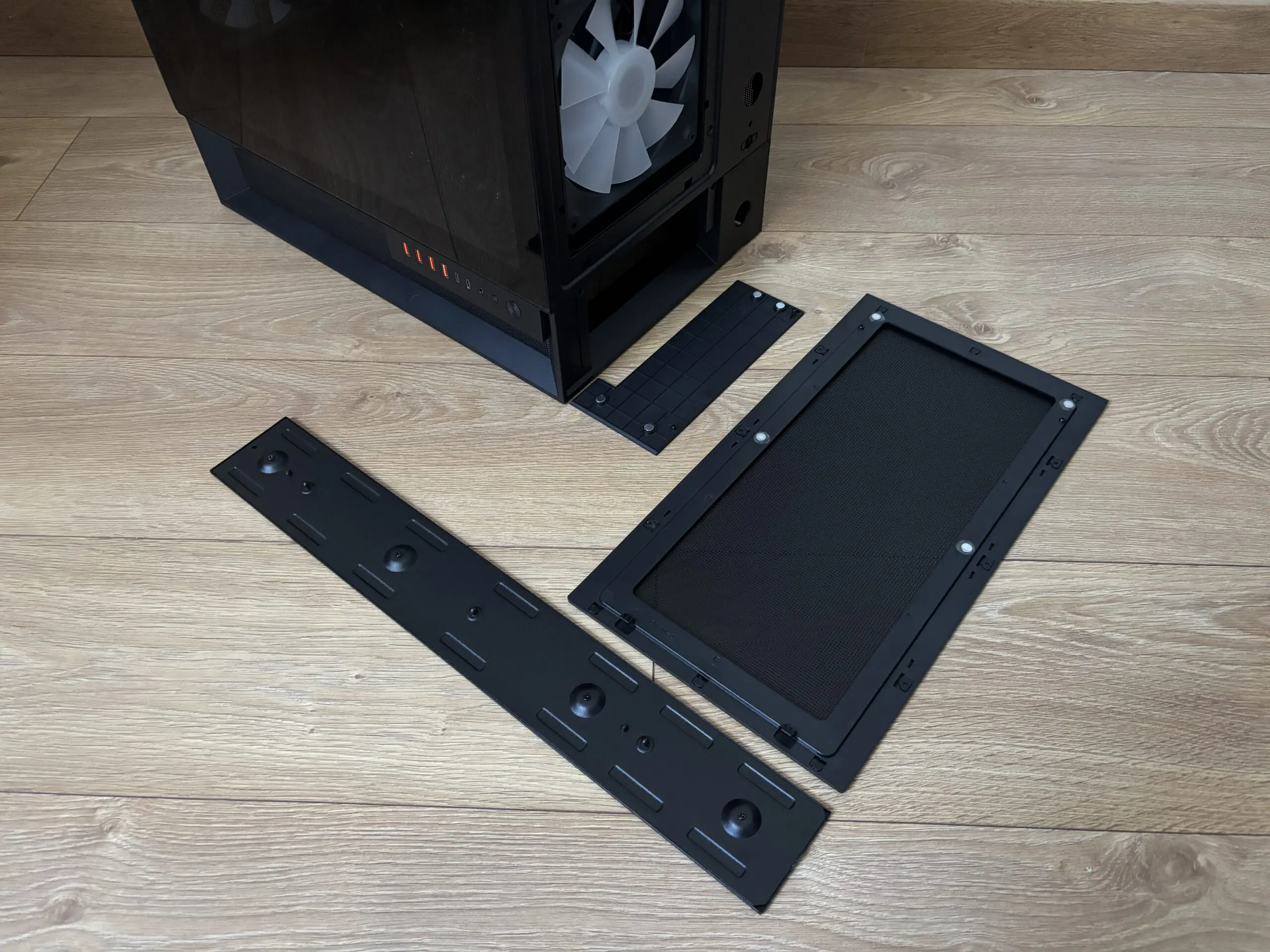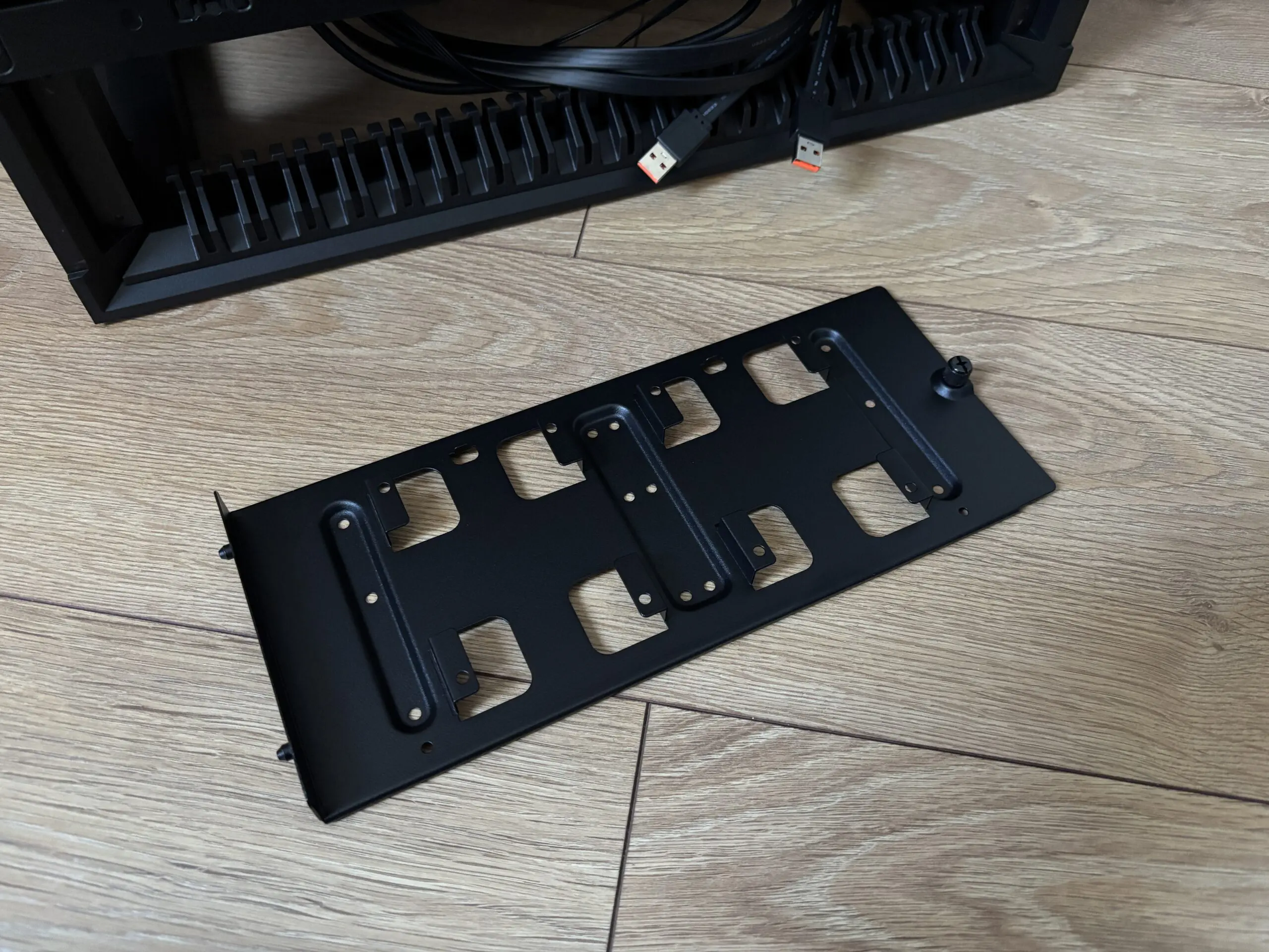 Inny sposób mocowania ma dolny plastik, idący w poprzek obudowy. Ten element jako jedyny otrzymał możliwość montażu magnetycznego. Jest to o tyle ważne, że klapka ta stanowi jedynie maskownicę kabli, które będą tamtędy puszczane na zewnątrz.