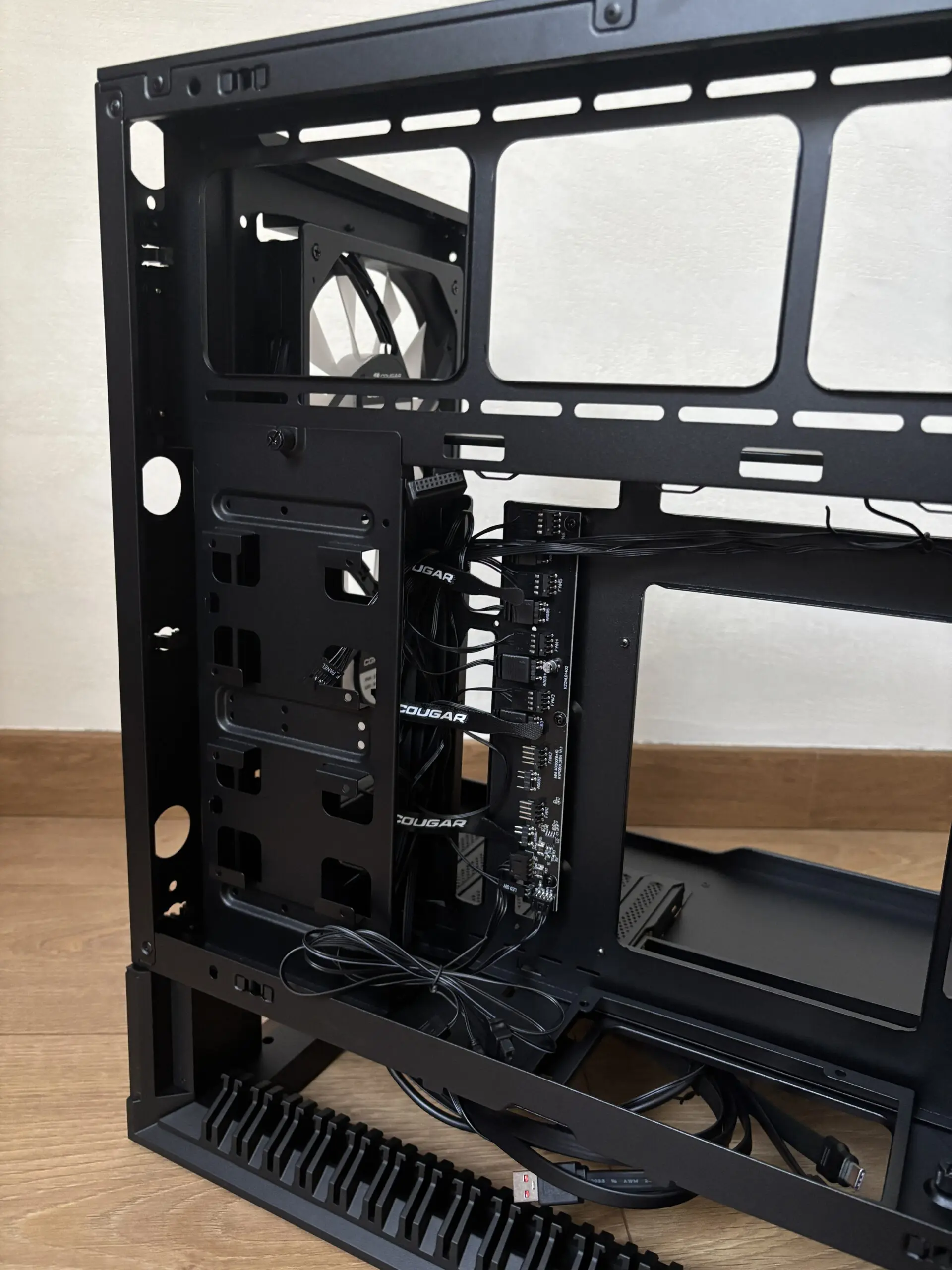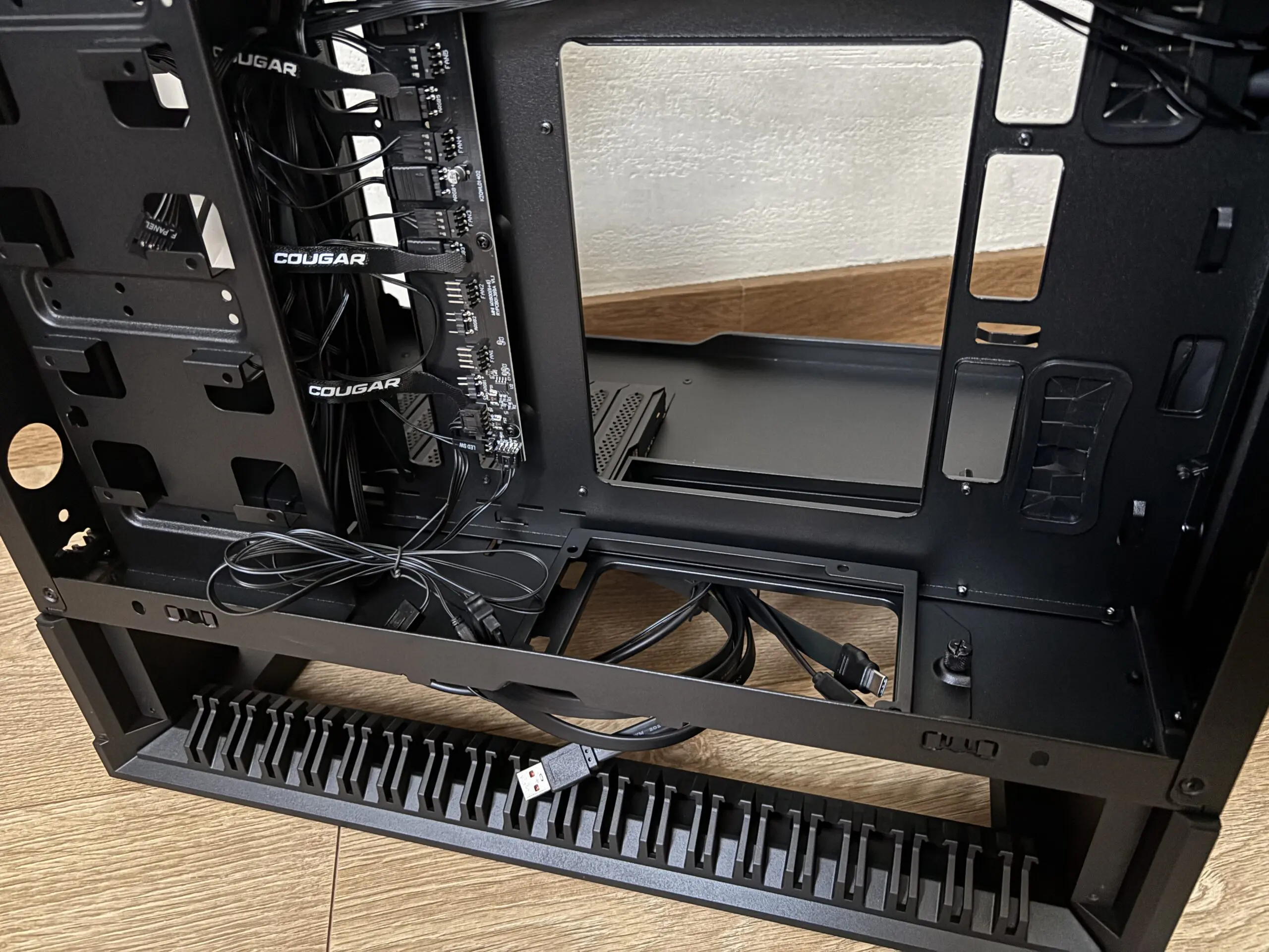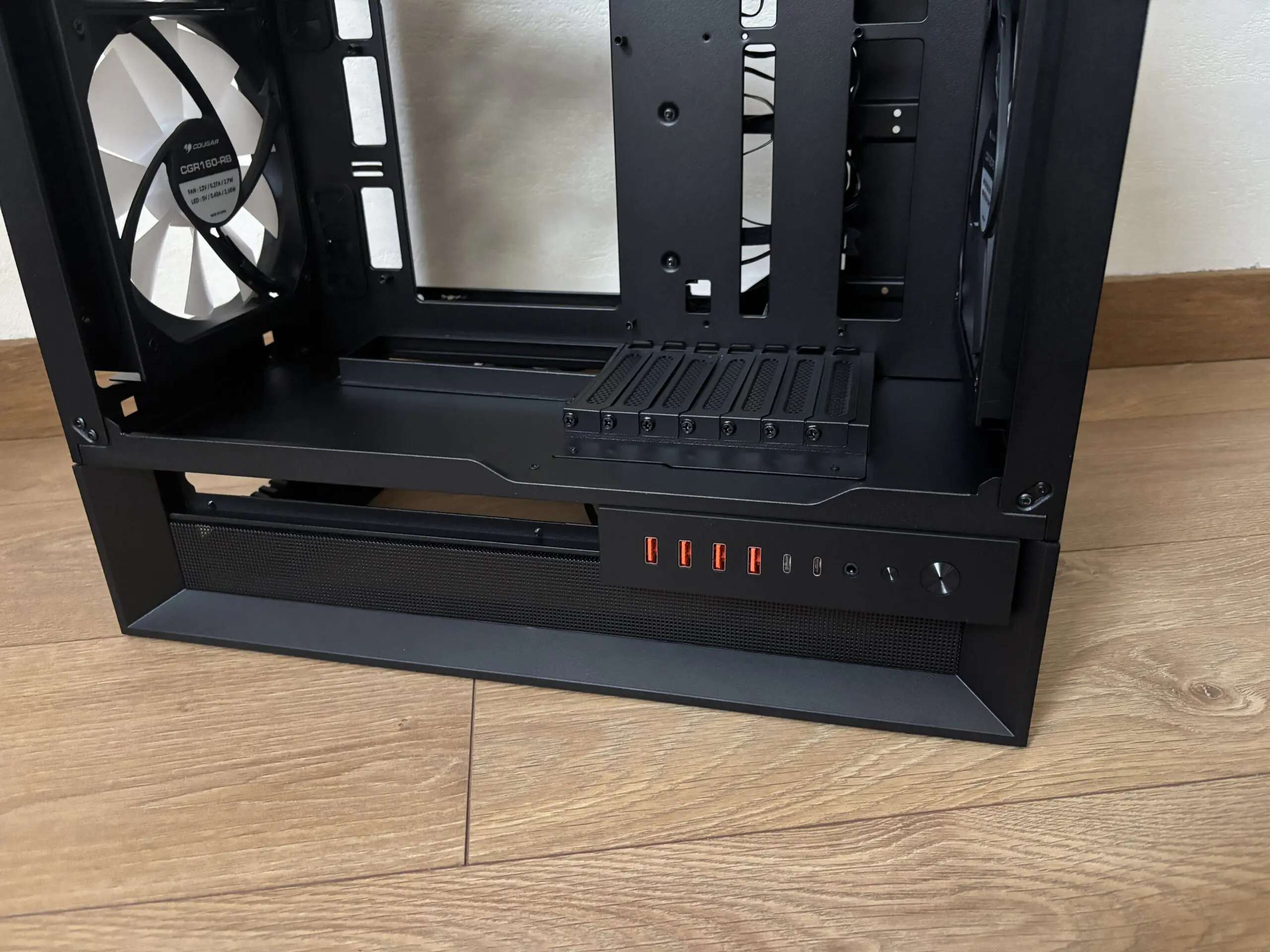 Panel sterowania ze złączami został umieszczony na tym samym boku, co przeszklenie. Jest to logiczne miejsce albowiem to właśnie tą stroną obudowa będzie zwrócona do użytkownika. Cougar przemyślał i ten element albowiem jest on przesuwany. W zależności, czy obudowa zostanie ustawiona po prawej czy po lewej stronie biurka panel ze złączami będzie można przesunąć tak aby był on dla nas w jak najlepszym i poręczniejszym miejscu. GE-NIAL-NE!