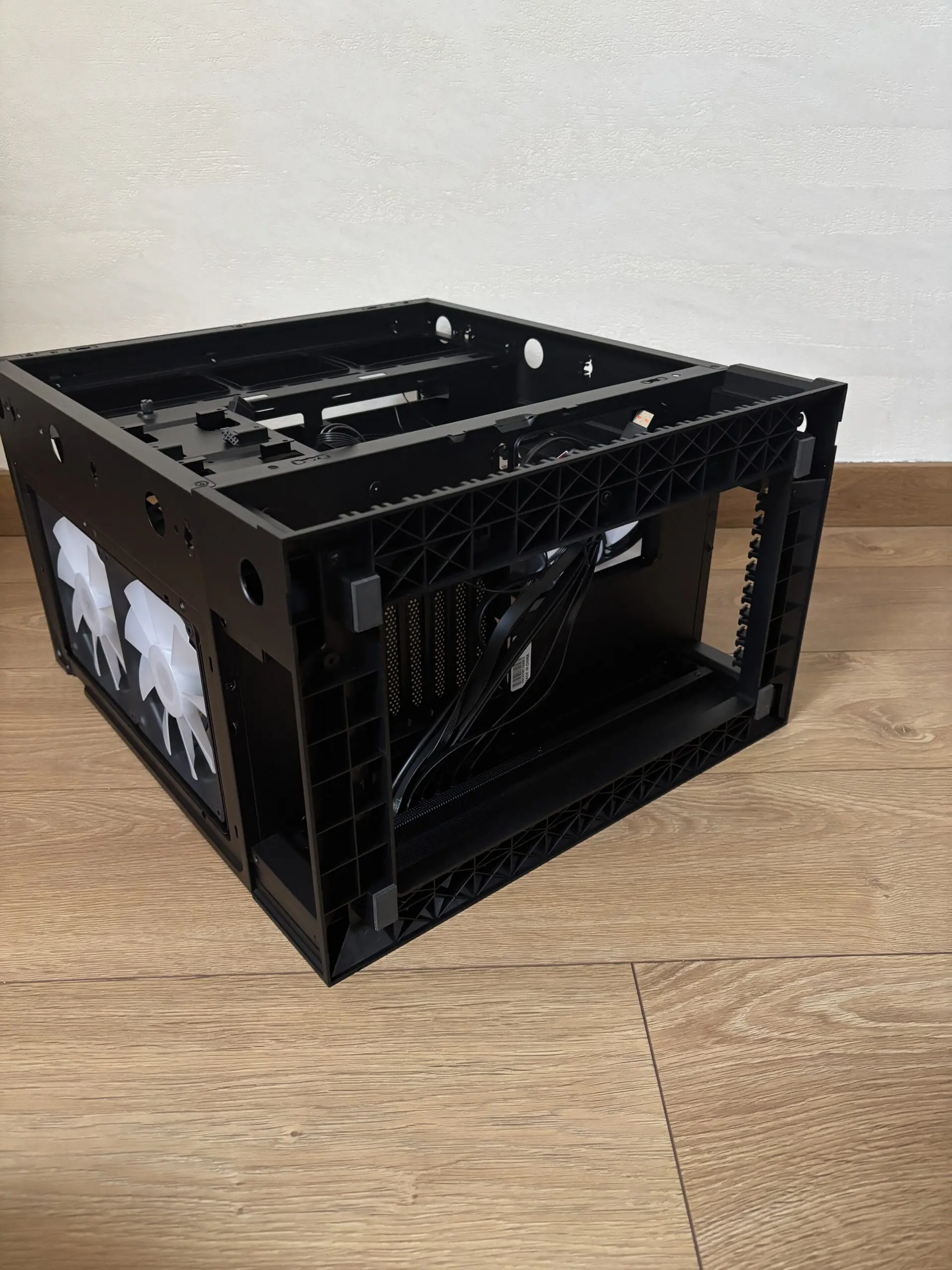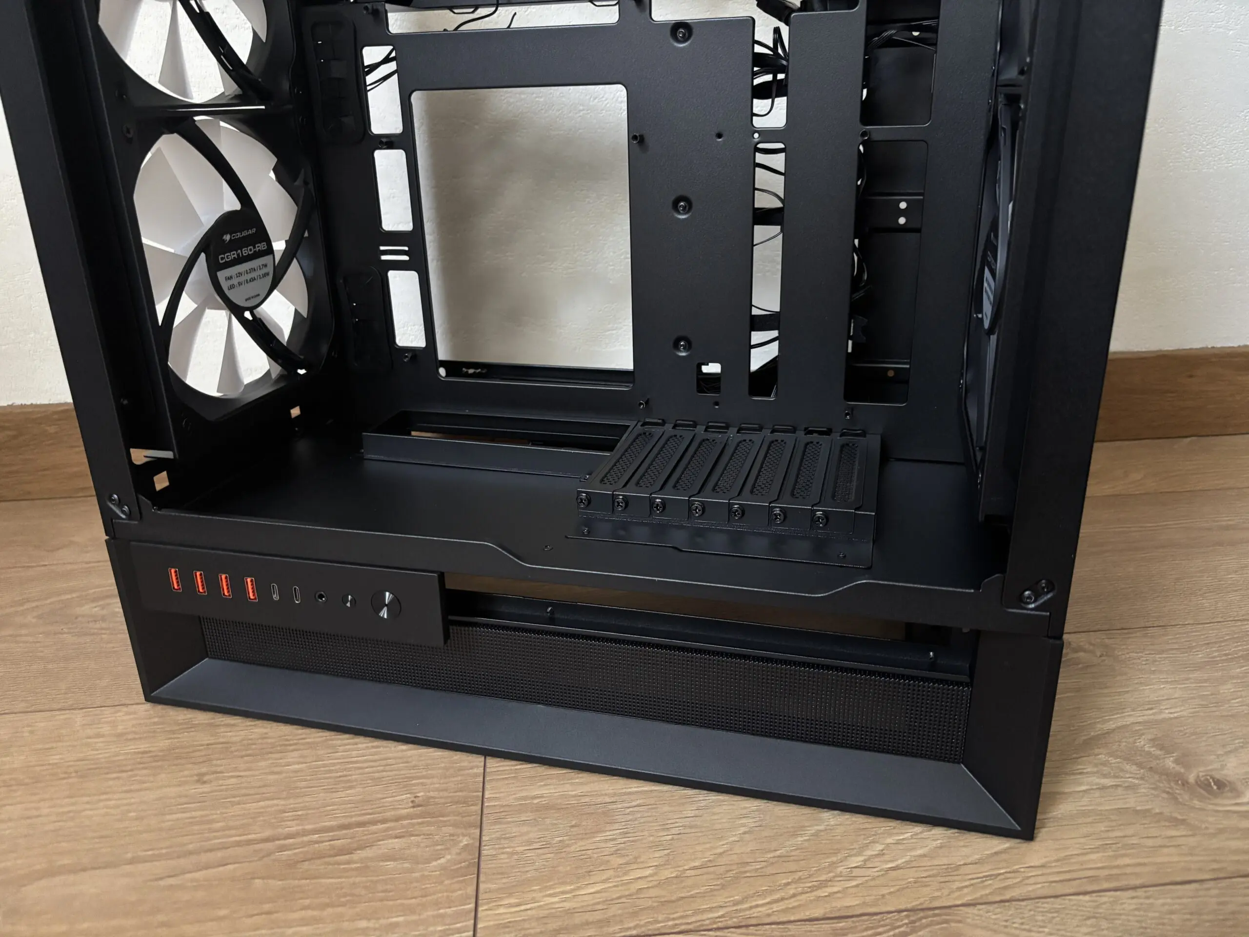 Obudowa daje bardzo dużo możliwości do konfiguracji i optymizacji ulokowania poszczególnych elementów. Oczywiście aby to wykorzystać potrzeba bardziej rozbudowanego setupu niż mój. Posiadacze chłodzenia wodnego będą w niebo wzięci, ponieważ ilość możliwości montażu chłodnicy jest aż nadto wystarczająca i każdy znajdzie pozycję odpowiednią dla swojego setupu. Karta graficzna również posiada możliwość montażu w dwóch położeniach – zarówno horyzontalnie jak i wertykalnie (jednak producent nie dodaje żadnych adapterów).