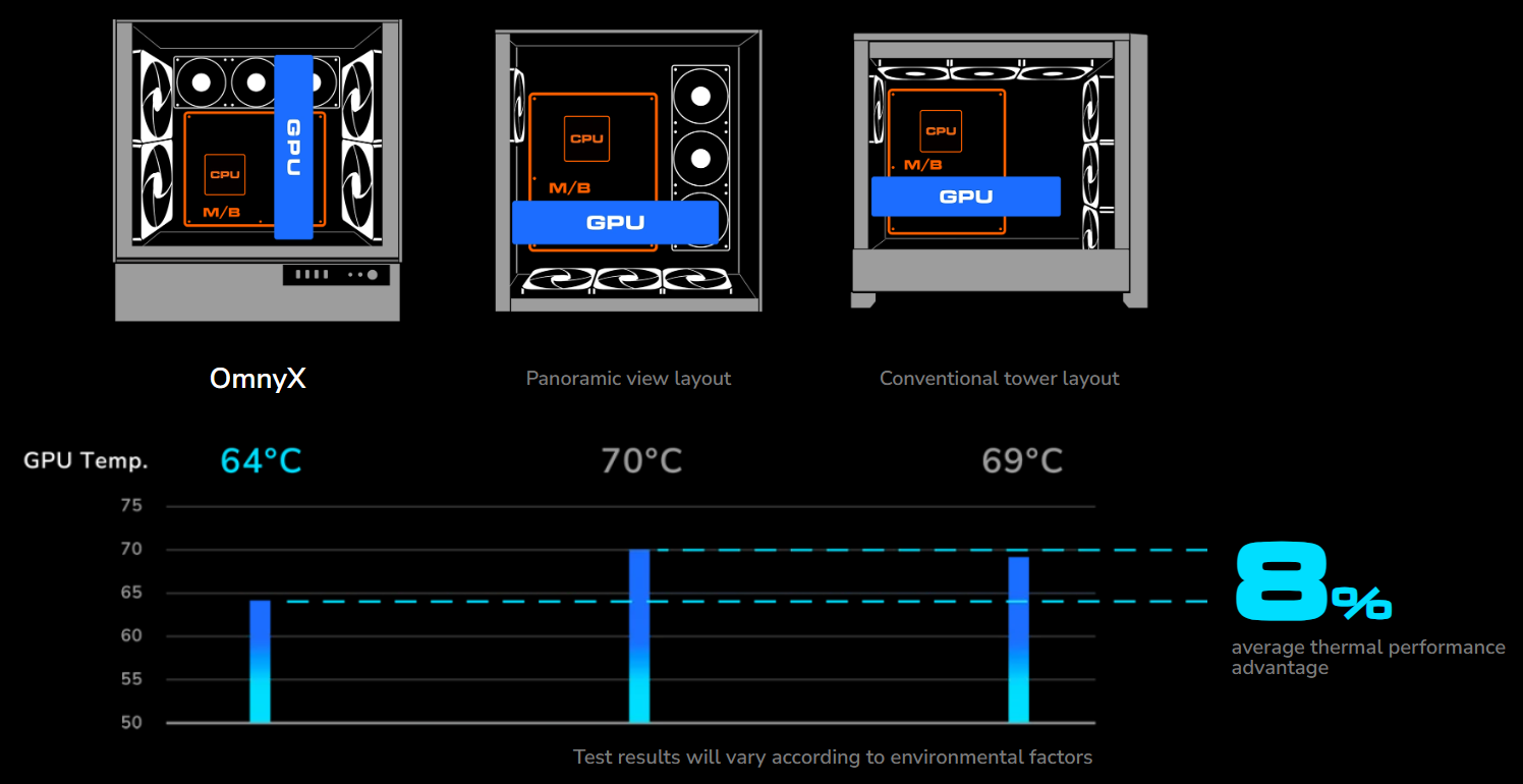 Według producenta, OmnyX w testach termicznych osiąga świetne wyniki: Cougar twierdzi, że model ten „crushed thermal tests” – w ich testach znalazł się na 1. miejscu spośród 129 obudów w kontekście temperatury GPU podczas stresu, oraz w top 3 w trybie gamingowym. Tak dobre wyniki można przypisać dużym wentylatorom 160 mm i elastyczności przepływu powietrza („omnidirect flow”) — możliwość lepszego dopasowania ról wentylatorów (wlot / wylot) w różnych orientacjach pomaga w utrzymaniu optymalnej temperatury. Jeśli chodzi o hałas, duże wentylatory mogą pracować na niższych obrotach przy zachowaniu dobrej wydajności powietrznej, co z reguły przekłada się na niższy poziom dźwięku. W praktyce jednak przy maksymalnym obciążeniu są słyszalne, zwłaszcza przy pełnym zestawie siedmiu wentylatorów lub wysokich obrotach PWM.