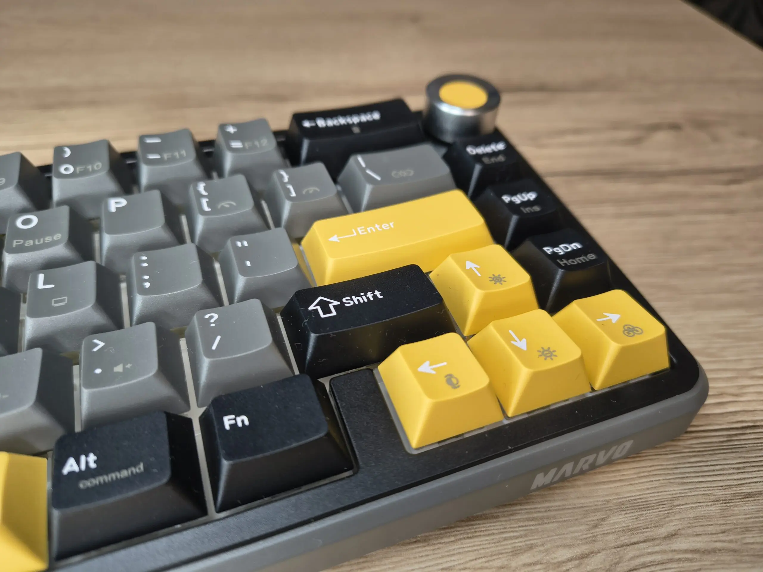 Od razu rzuca się w oczy jej stylistyka. Marvo postawiło na ciekawą paletę kolorów: część keycapów jest czarna, część szara, a klawisze funkcyjne (strzałki, Enter, spacja i ESC) wyróżniają się intensywną żółto-pomarańczową barwą. Dokładnie w tym samym kolorze wykonano pokrętło głośności umieszczone w prawym górnym rogu. I muszę przyznać, to świetny akcent. Małe klawiatury rzadko mają pokrętło, a tutaj nie tylko jest, ale też wygląda i działa naprawdę dobrze.