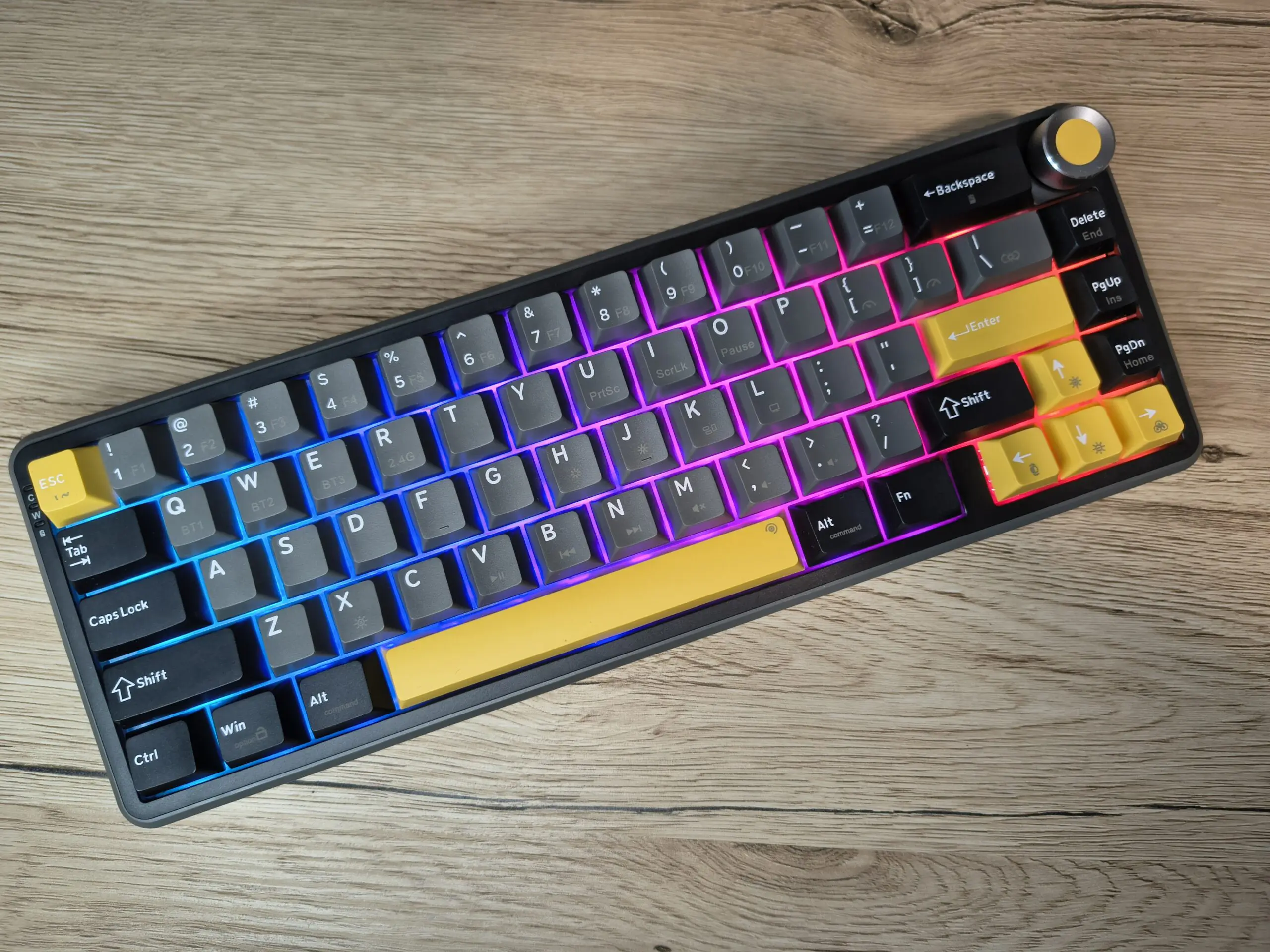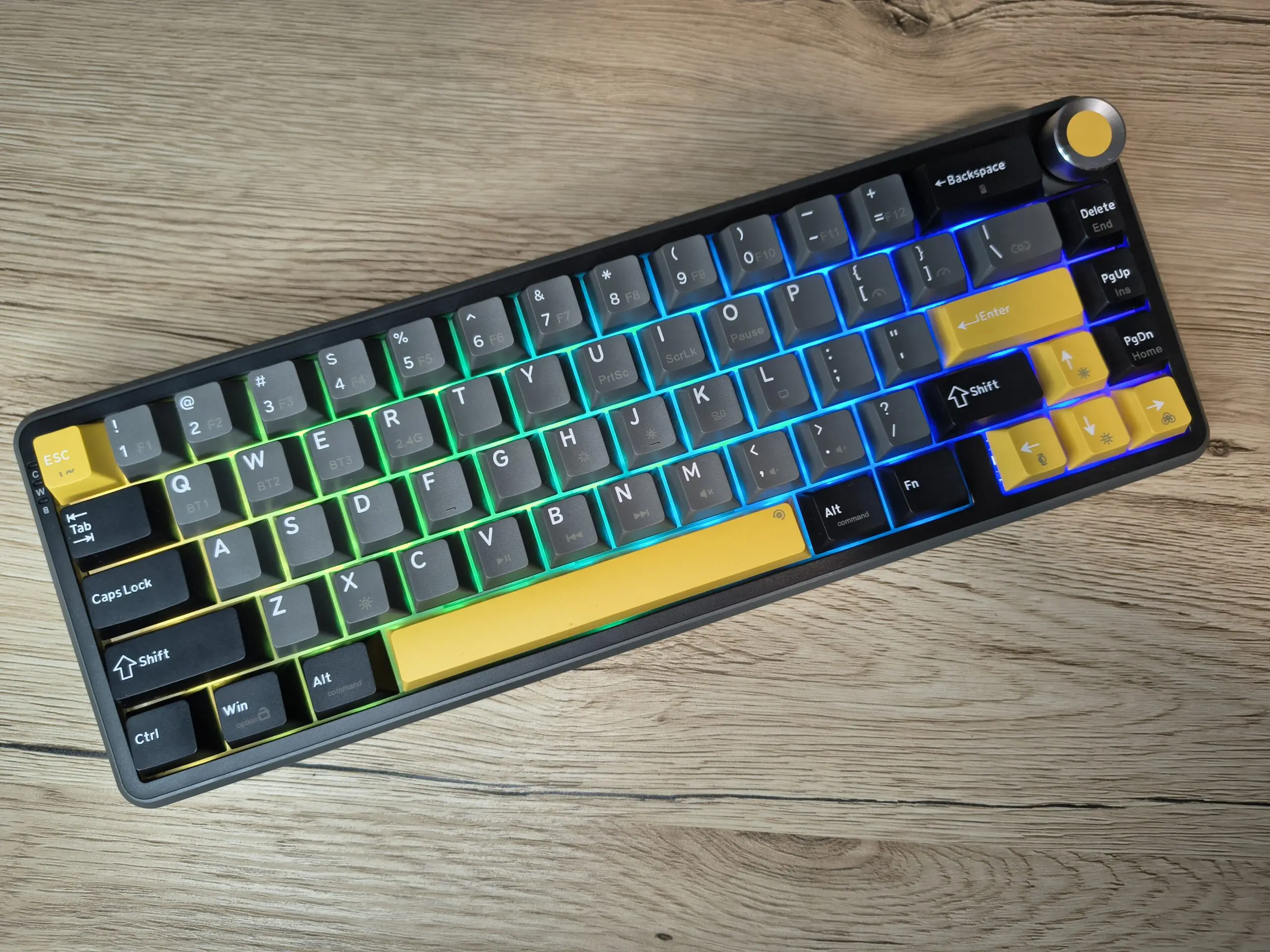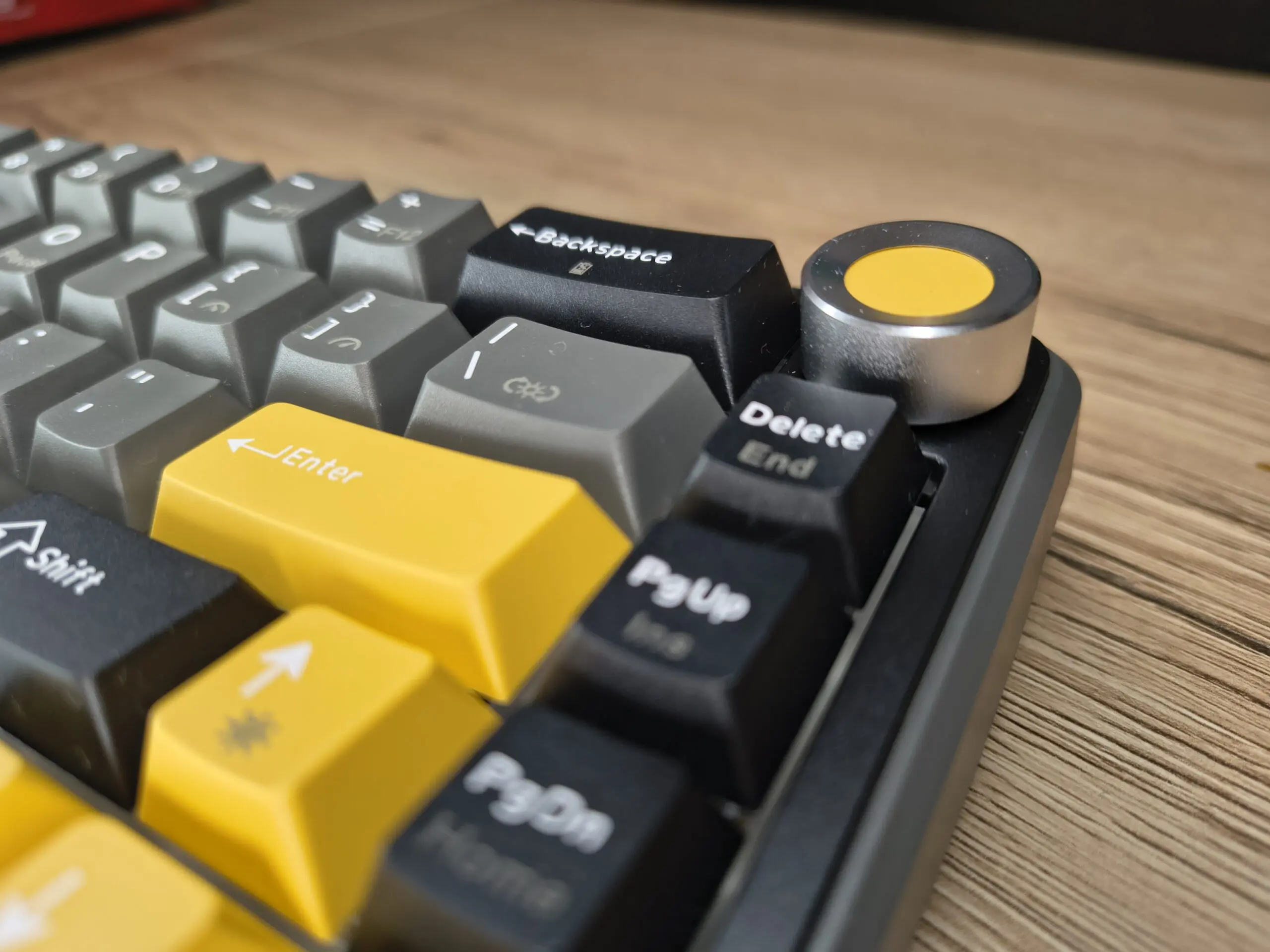 Na plus wypada też sam design. Trójkolorowe keycapy PBT (czarne, szare i żółto-pomarańczowe akcenty) nadają TITAN-owi charakteru, a metalowe pokrętło to funkcjonalny dodatek, którego w tym segmencie praktycznie się nie spotyka. Format 65% okazuje się natomiast świetnym kompromisem między kompaktowością a wygodą – idealny dla graczy, którzy lubią mieć dużo miejsca na mysz i preferują minimalistyczne układy.
