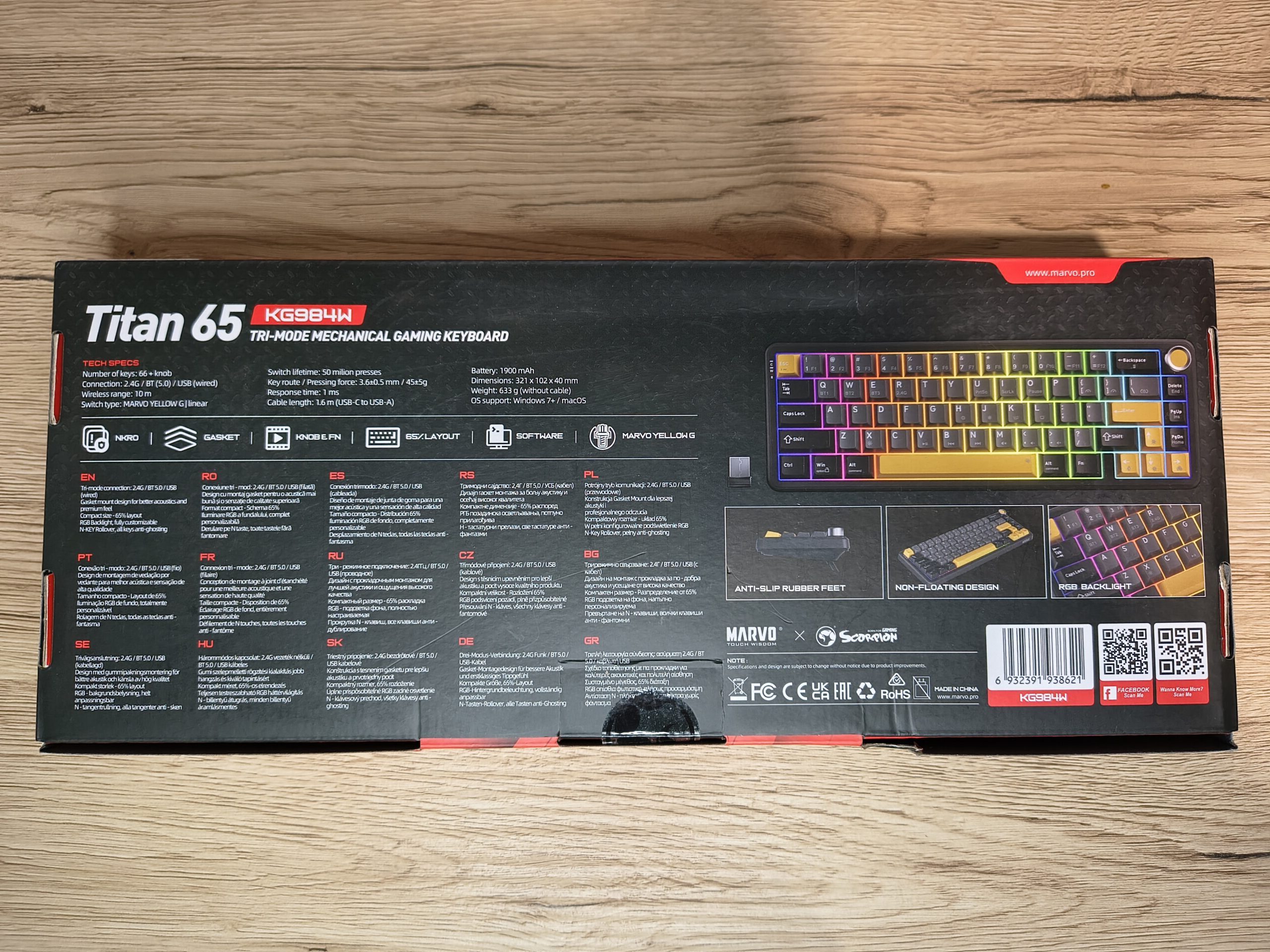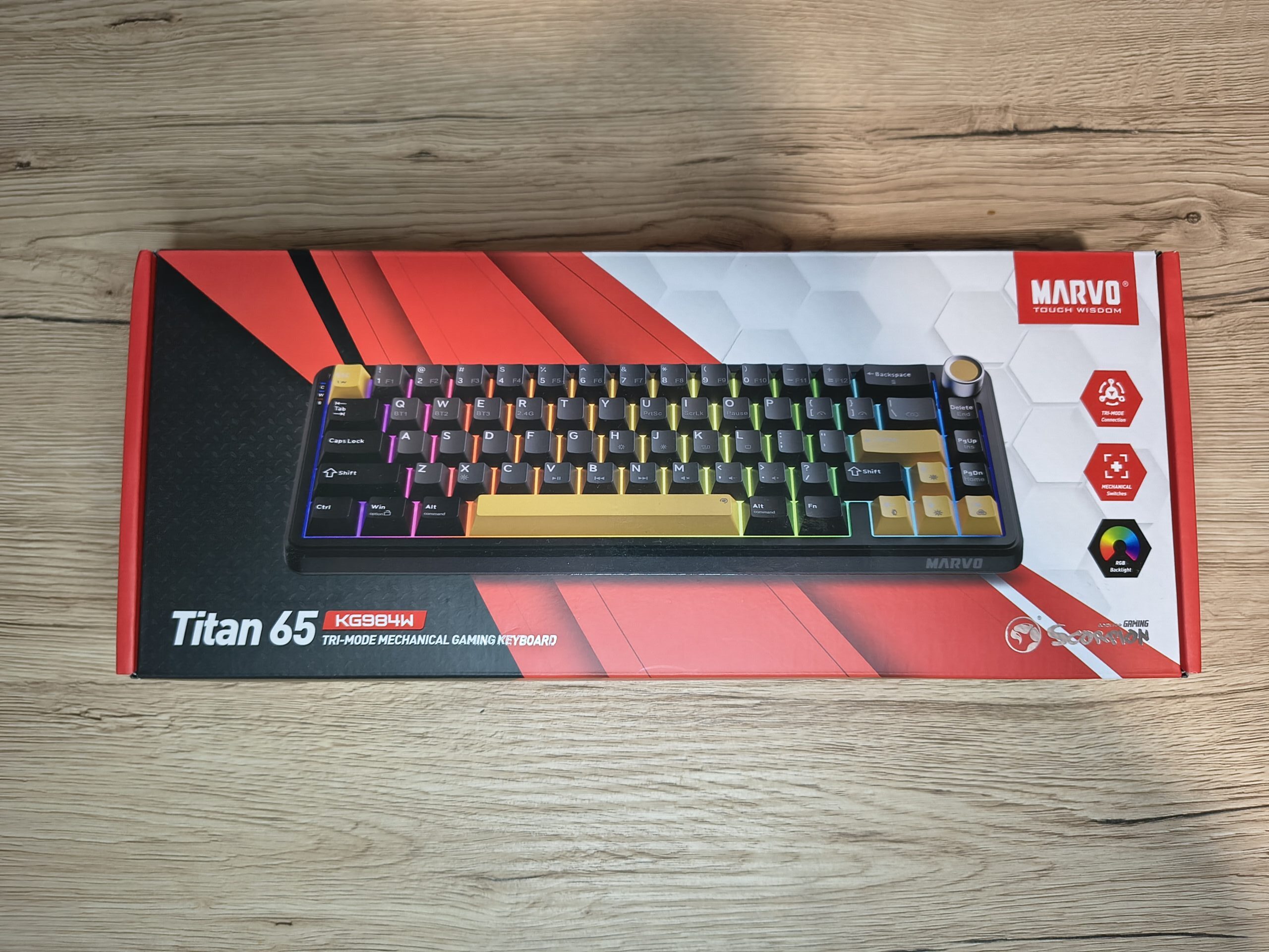 Marvo TITAN 65 trafia do nas w niewielkim, ale solidnym pudełku, które od razu zdradza charakter serii Titan. Dominuje czerwień przełamana czernią i bielą, a na froncie znajdziemy dużą grafikę klawiatury oraz najważniejsze informacje – mechaniczne przełączniki, trzy tryby połączenia i podświetlenie RGB.