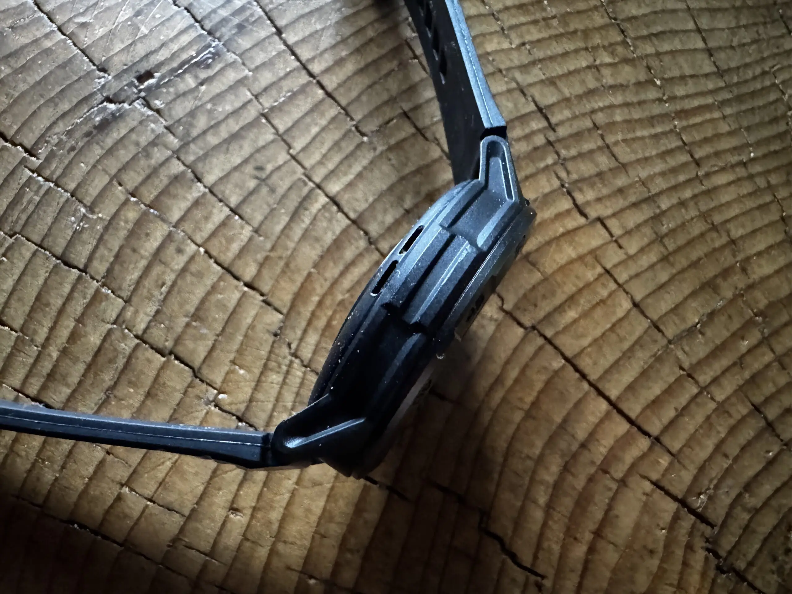 Obudowa: tworzywo + metalowe akcenty, ramka wyraźnie „rugged” – czyli wzmocniona, z wyraźnymi śrubkami wokół lunety i mocnym szkiełkiem na ekranie. Z tyłu czujniki wyglądają na dobrze zamocowane. Klasyczny styl outdoorowy – niekoniecznie minimalizm do garnituru. Na moim nadgarstku (ok. 17 cm obwodu) zegarek był zauważalny, ale nie przeszkadzał — choć jeśli ktoś woli bardzo subtelny zegarek, może być „odczuwalny”.