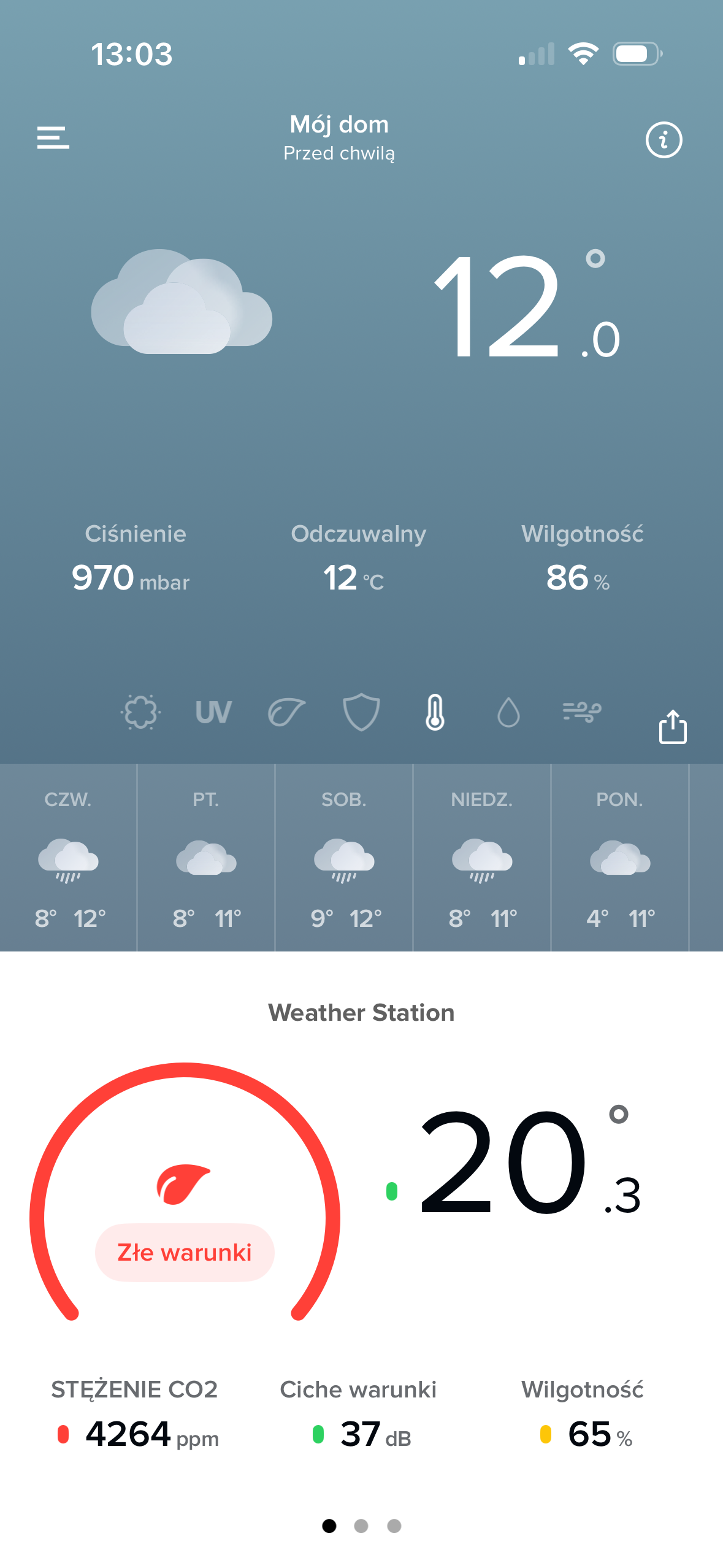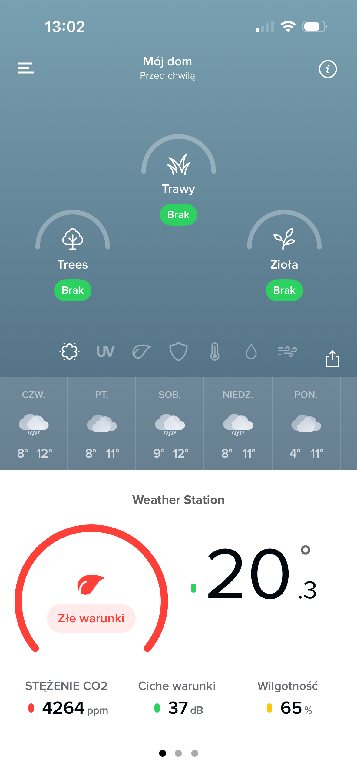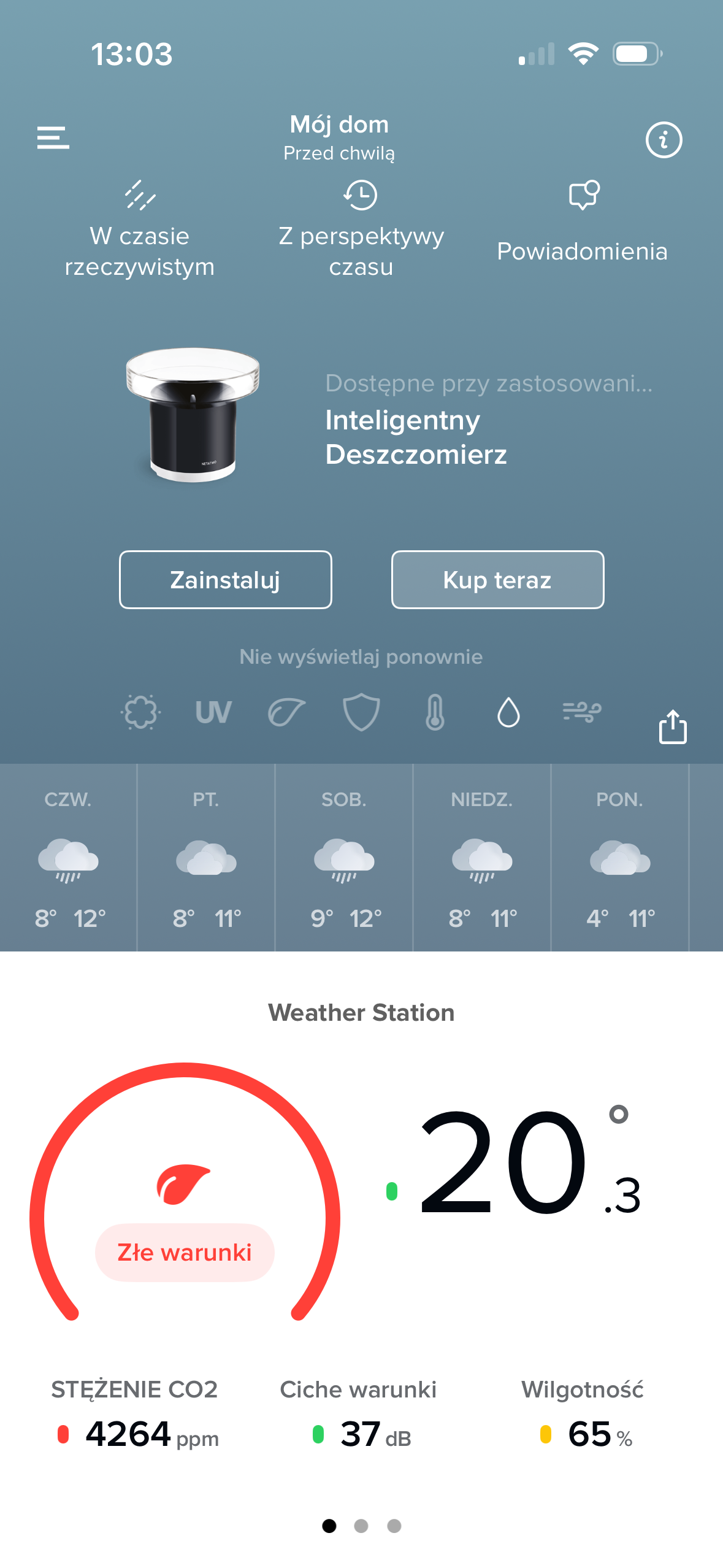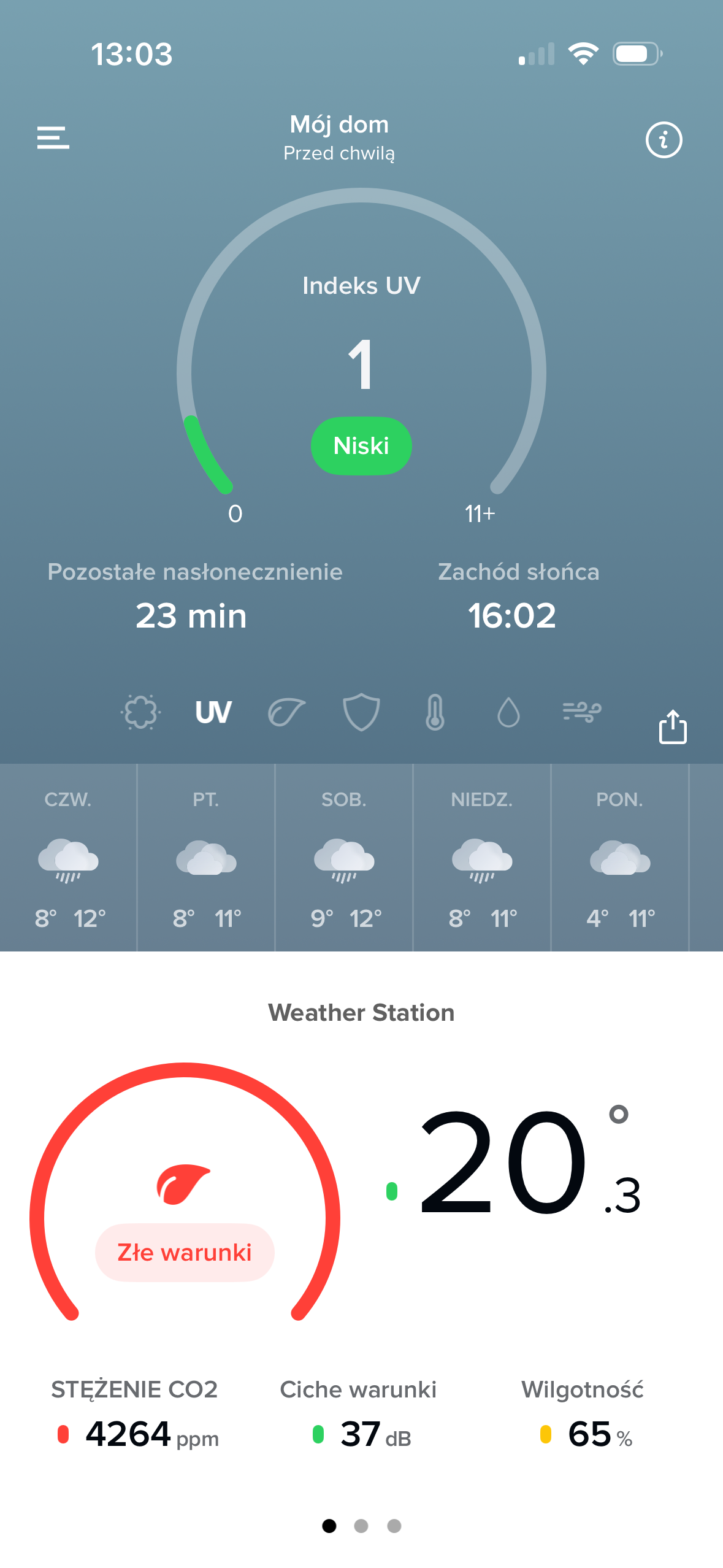 Dane te pochodzą z serwisów meteorologicznych (The Weather Company), ale są zintegrowane z lokalizacją użytkowanika i widoczne obok pomiarów z czujników Netatmo.