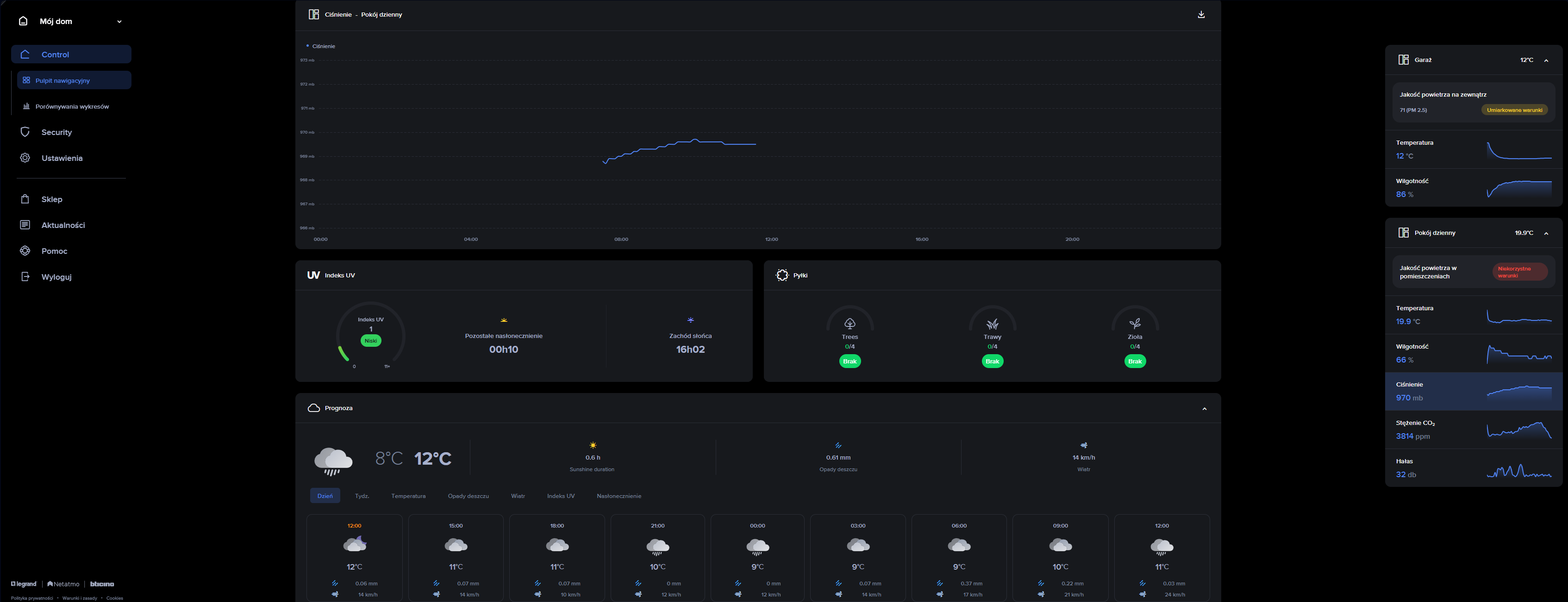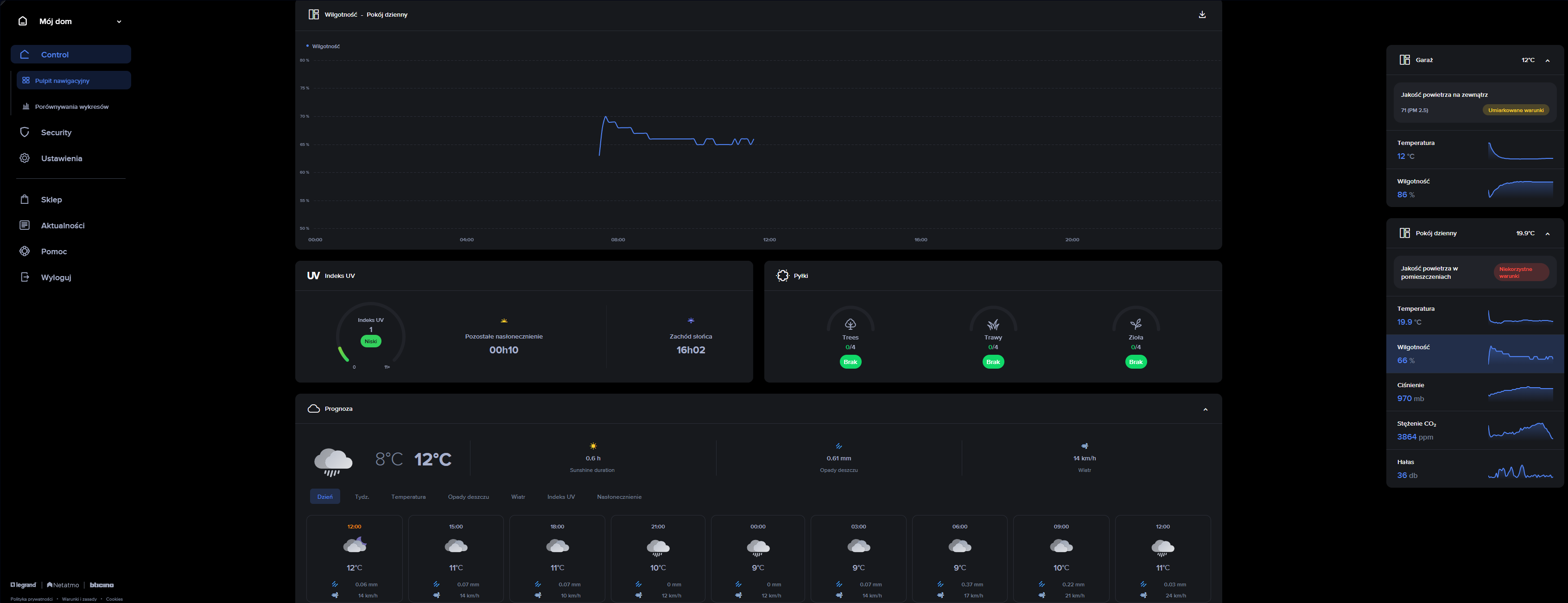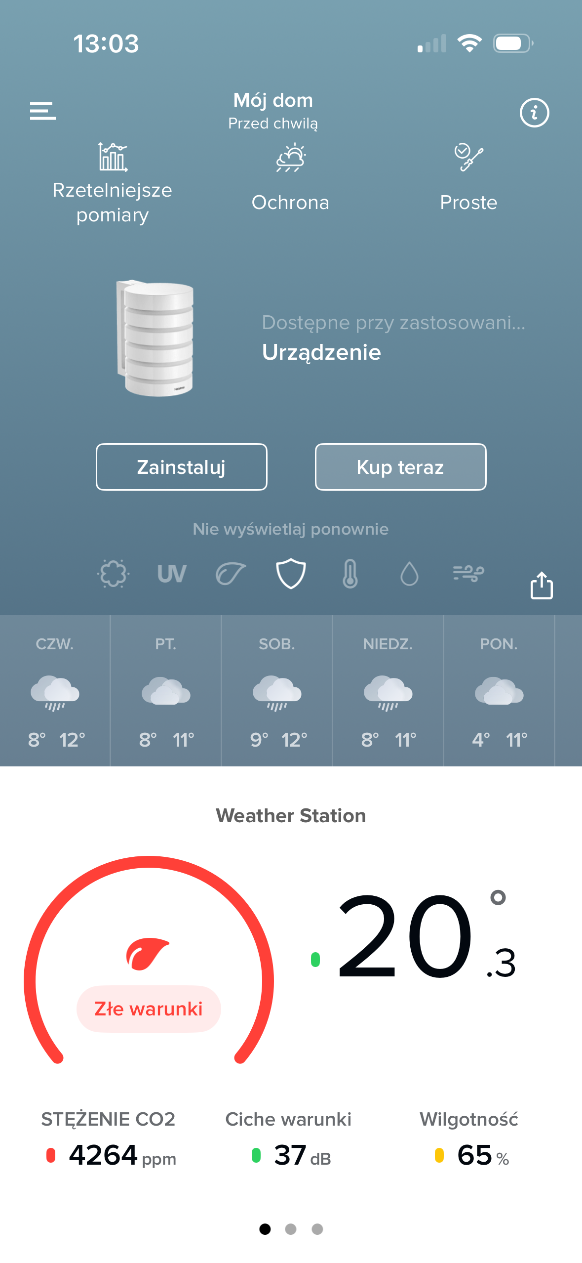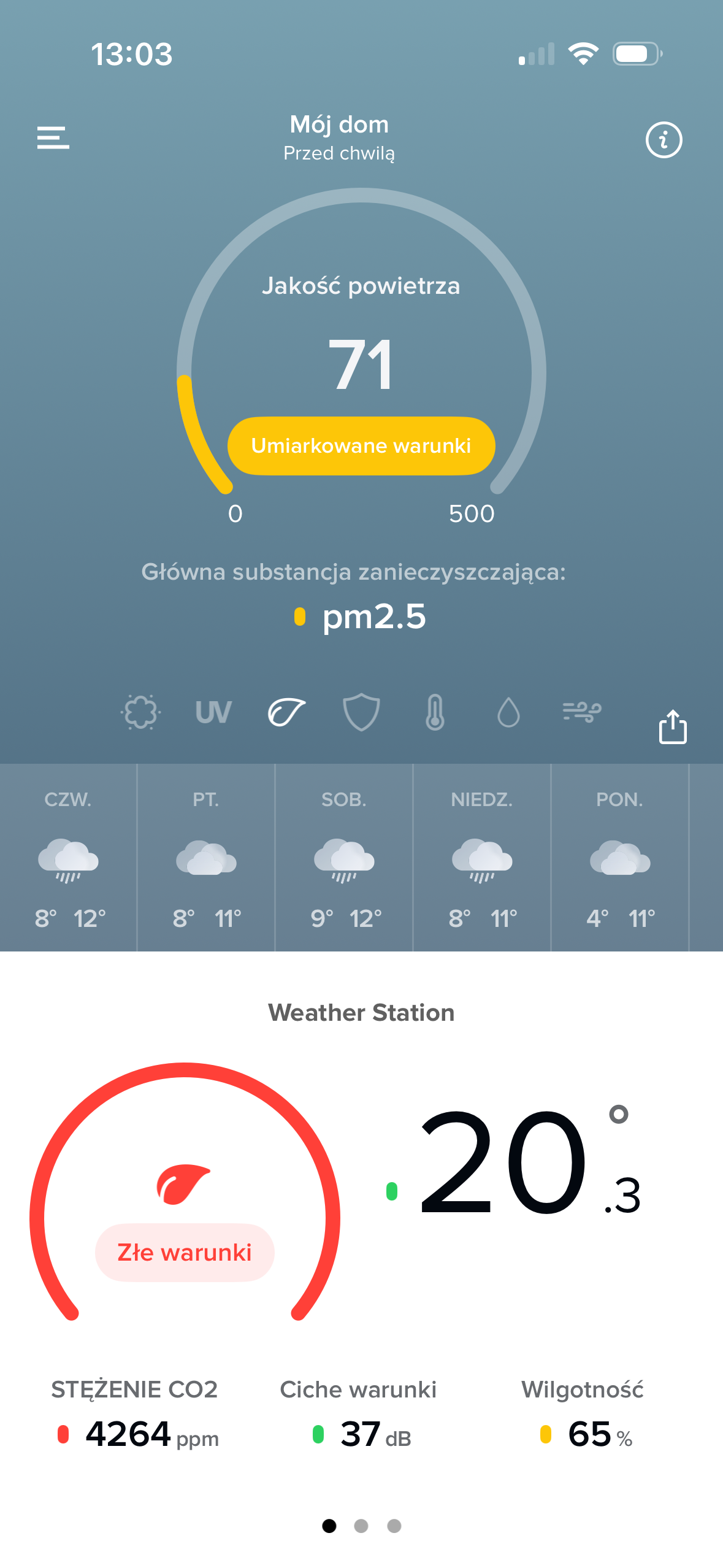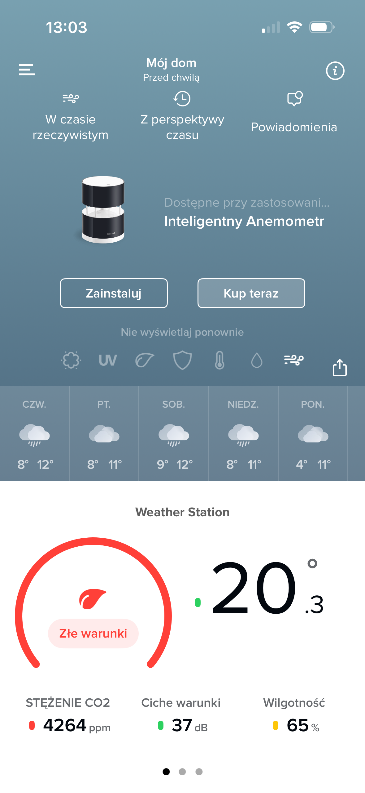 Dane te pochodzą z serwisów meteorologicznych (The Weather Company), ale są zintegrowane z lokalizacją użytkowanika i widoczne obok pomiarów z czujników Netatmo.