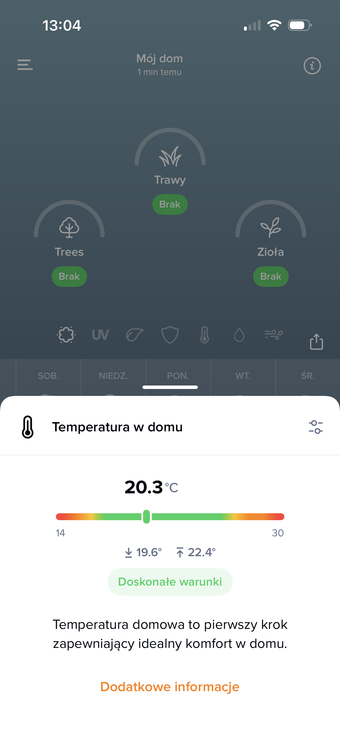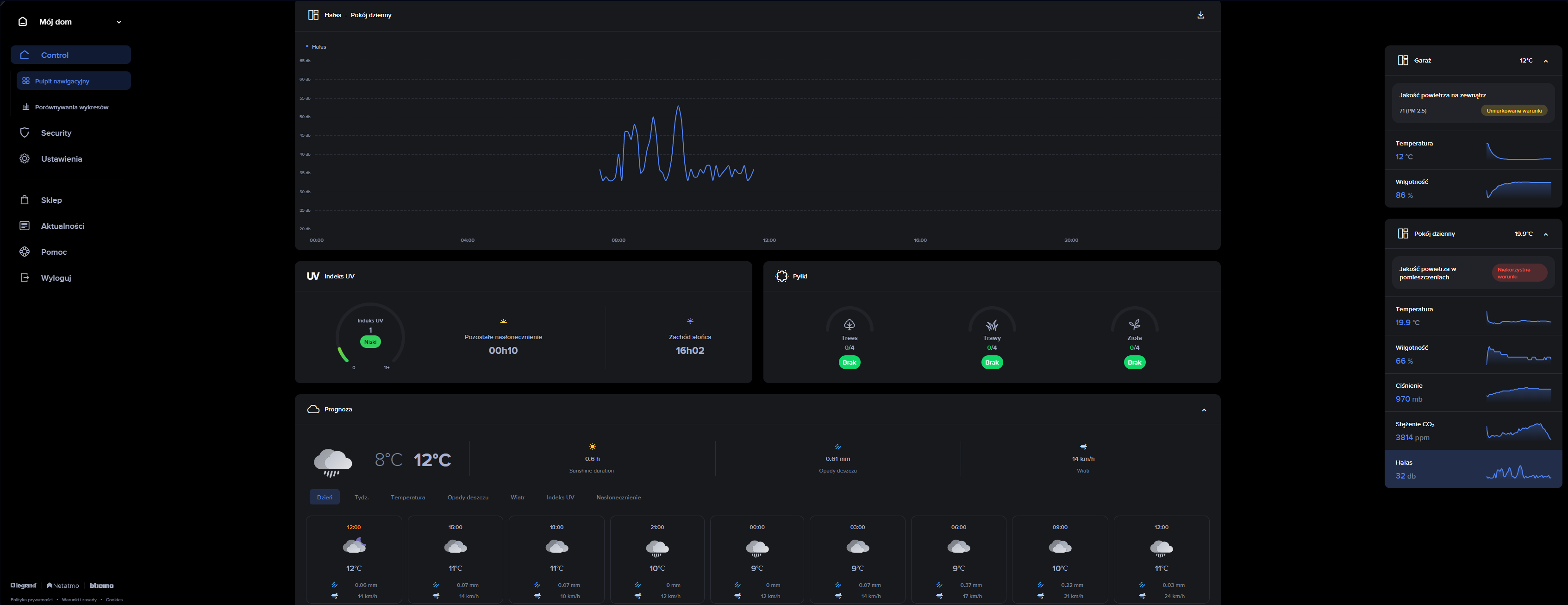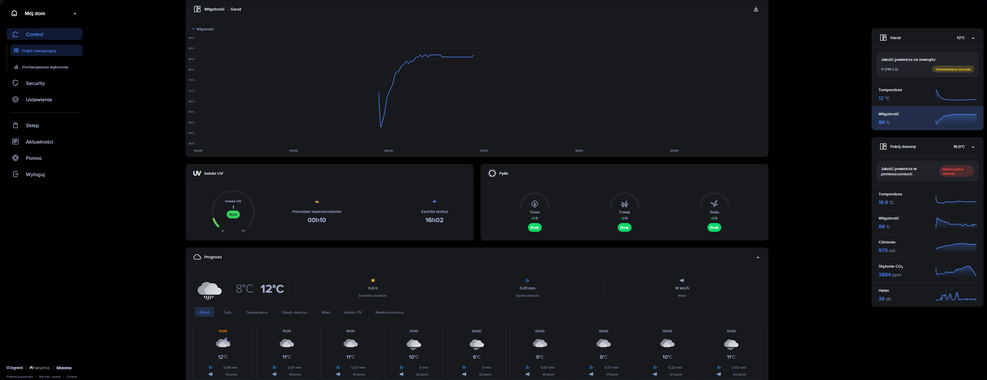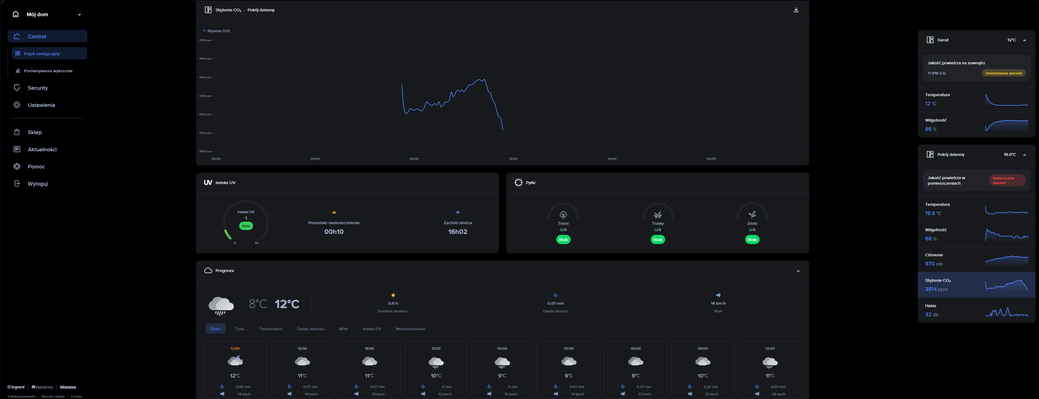Dane te pochodzą z serwisów meteorologicznych (The Weather Company), ale są zintegrowane z lokalizacją użytkowanika i widoczne obok pomiarów z czujników Netatmo.
