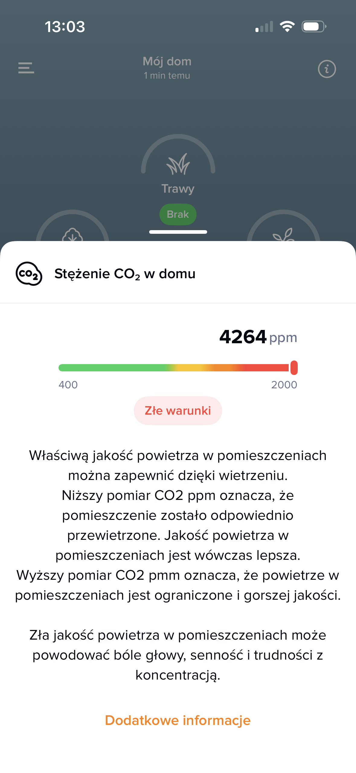 W moim przypadku stężenie dwutlenku węgla jest wysokie bo w pokoju, gdzie był umieszczony czujnik, paliła się mała świeczka zapachowa.