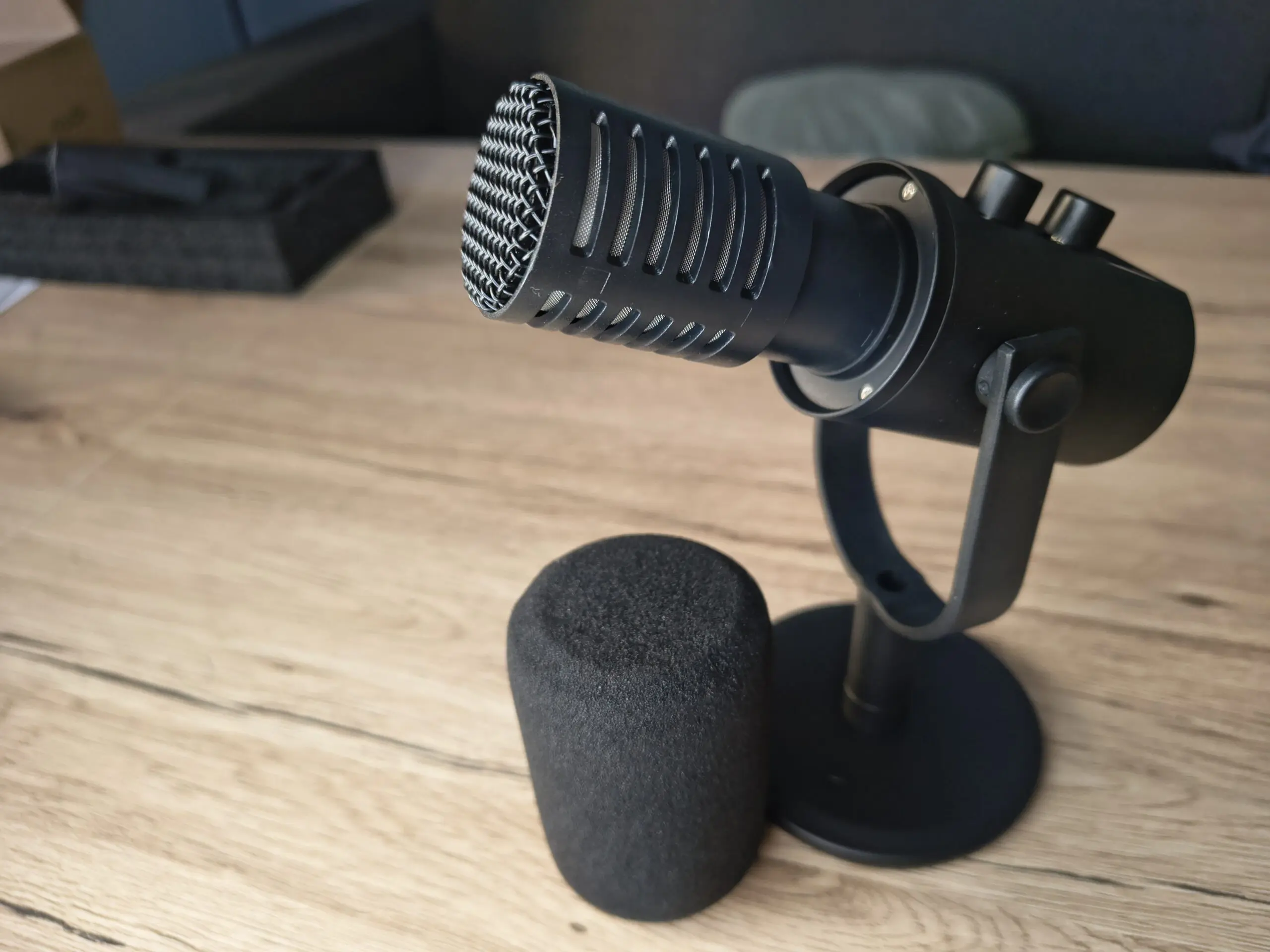 W środku wszystko jest zabezpieczone bardzo solidnie. Mikrofon nie lata luzem, a konstrukcja opakowania sprawia wrażenie przygotowanej raczej na trudny transport niż na efektowne unboxingi na YouTube. Tu priorytetem było bezpieczeństwo.