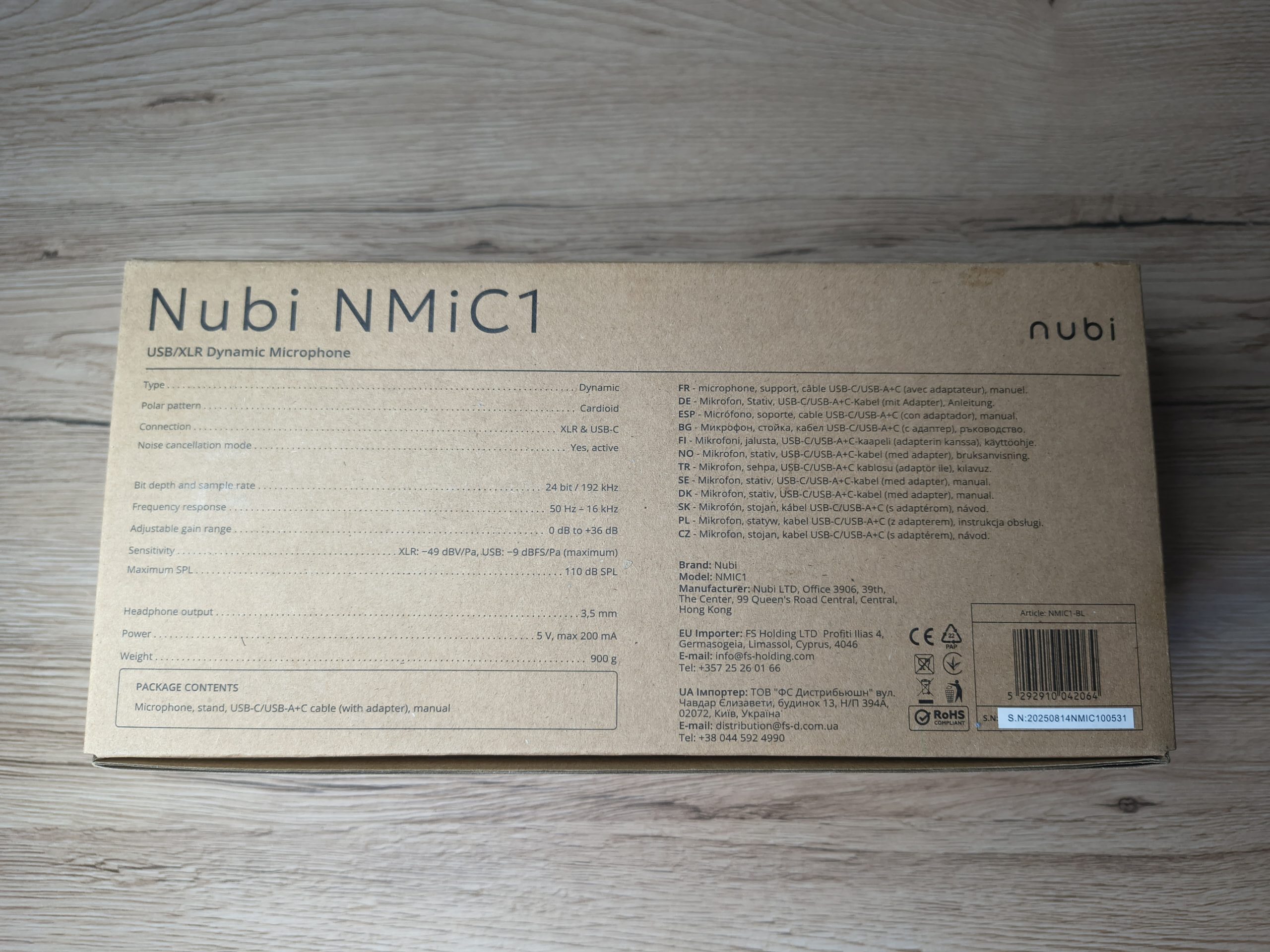 Już po wzięciu w ręce paczki widać, że Nubi NMIC1 nie próbuje nikogo uwodzić kolorowym pudełkiem. Opakowanie jest proste, ekologiczne i praktyczne. Bez dużych zdjęć, bez krzykliwych haseł w stylu „PRO STREAMING MIC”. Na froncie znajdziemy jedynie nazwę producenta, model oraz krótką informację o urządzeniu i specyfikację. Minimalizm w czystej postaci.