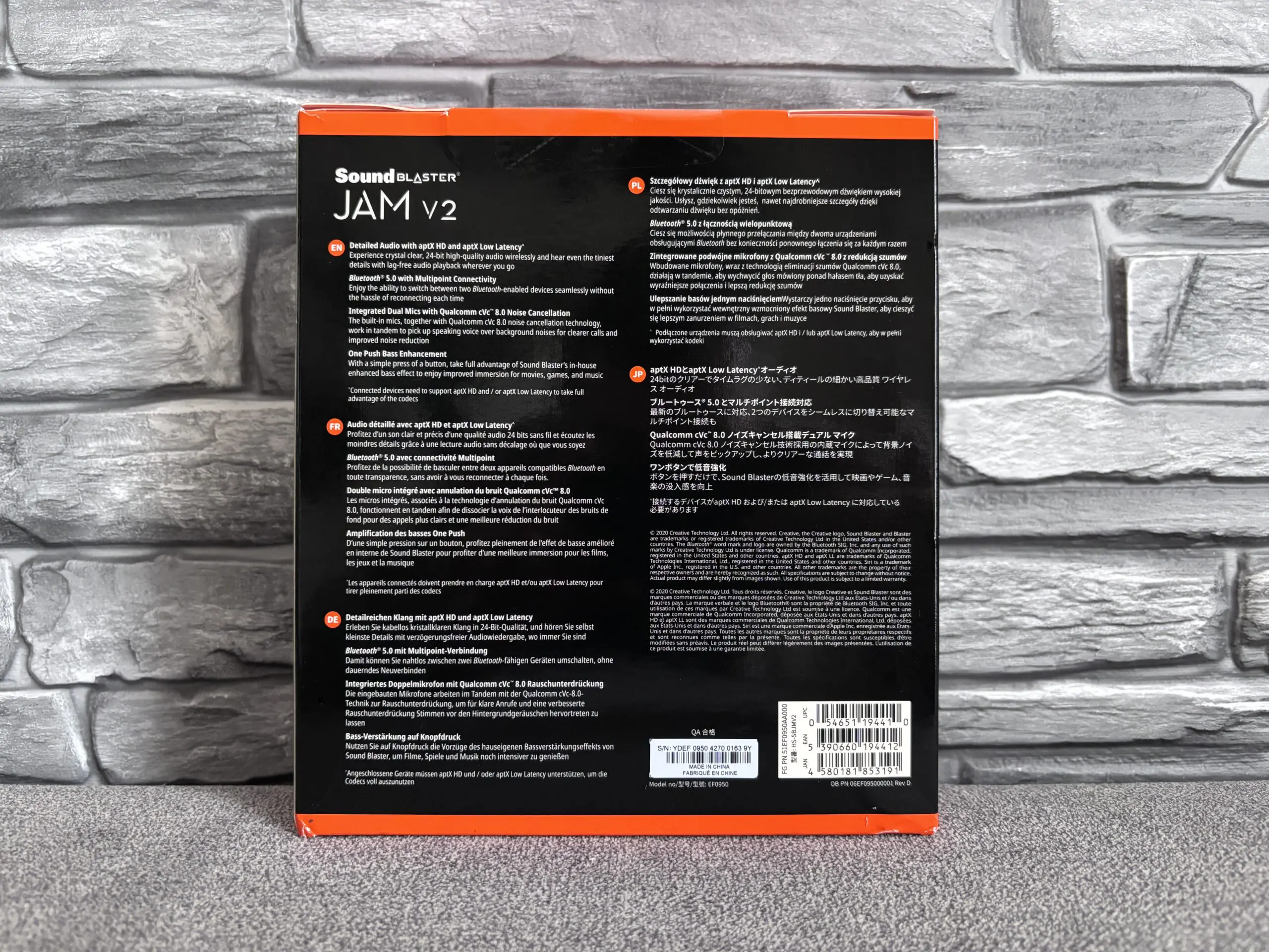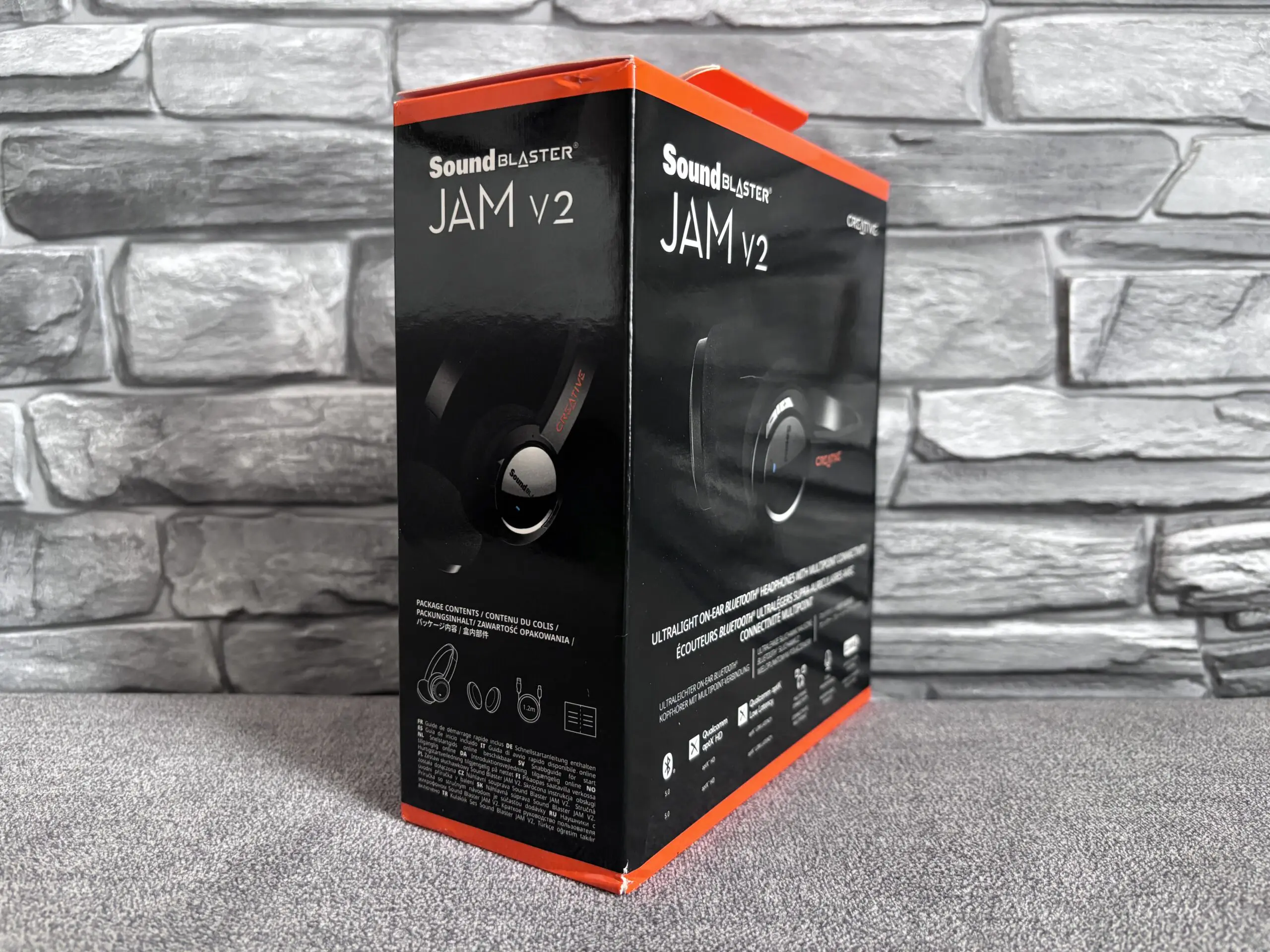 Creative Sound Blaster JAM V2 zapakowane są czarno-pomarańczone opakowanie, którego szata graficzna przepełniona jest wszelakiego typu informacjami. Głównie jest to specyfikacja techniczna połączona z opisem najważniejszych funkcji oferowanych przez testowane słuchawki. Oprócz tekstu producent umieścił dwa zdjęcia produktu dzięki czemu o jego wyglądzie można się dowiedzieć bez zaglądania do środka.