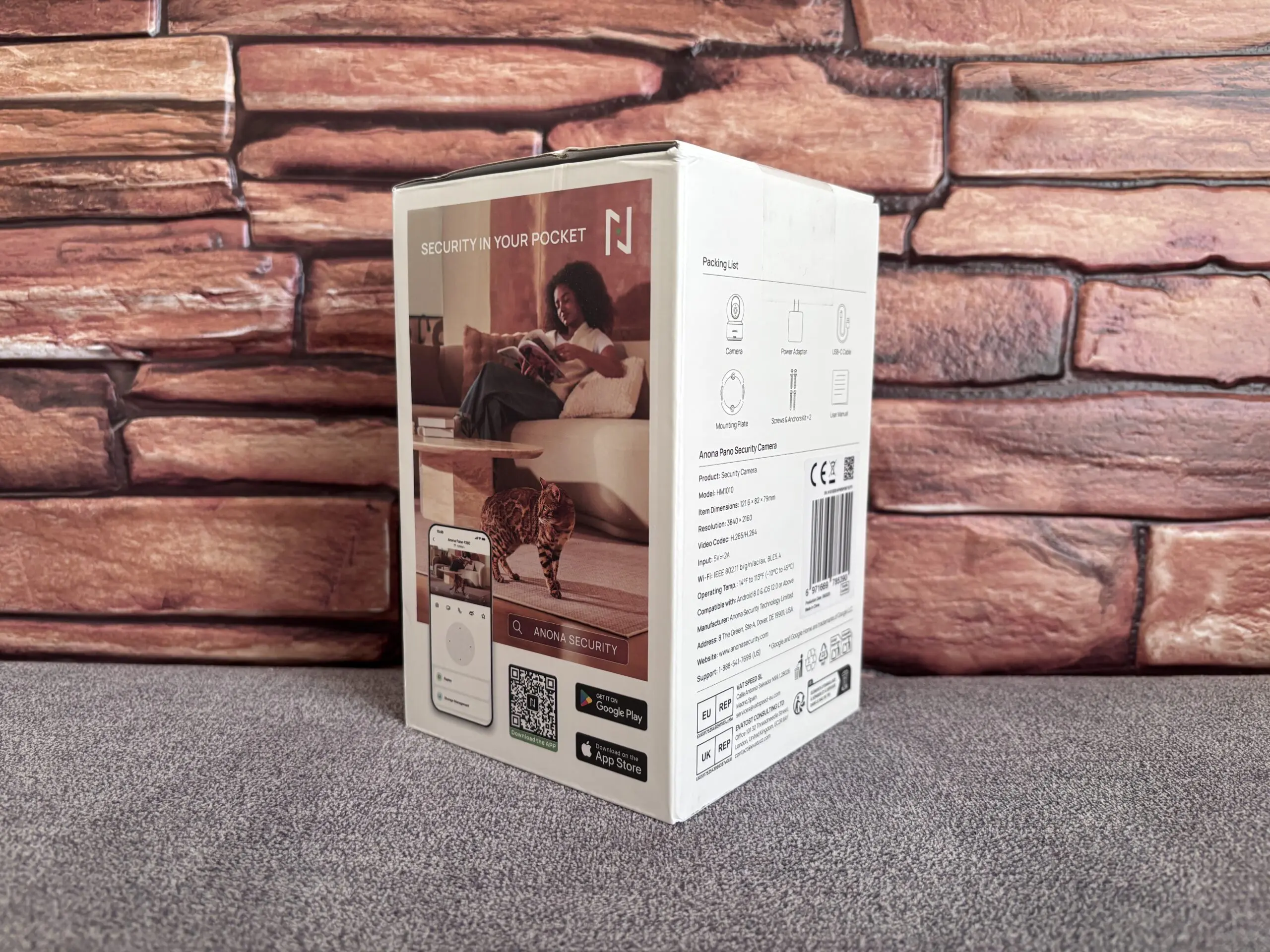 Kamera Anona Pano dostarczana jest w estetycznym, kartonowym opakowaniu utrzymanym w nowoczesnej, minimalistycznej stylistyce. Dominują jasne kolory z czytelną grafiką przedstawiającą samą kamerę oraz kluczowe informacje marketingowe, takie jak rozdzielczość 4K, funkcja obrotu 360°, obsługa AI czy auto-tracking. Na froncie pudełka umieszczono zdjęcie urządzenia oraz nazwę modelu, natomiast na bokach i tyle znajdują się piktogramy i krótkie opisy najważniejszych funkcji. Tył opakowania zawiera również podstawową specyfikację techniczną, informacje o kompatybilności z aplikacją mobilną oraz wymagania dotyczące sieci Wi-Fi.