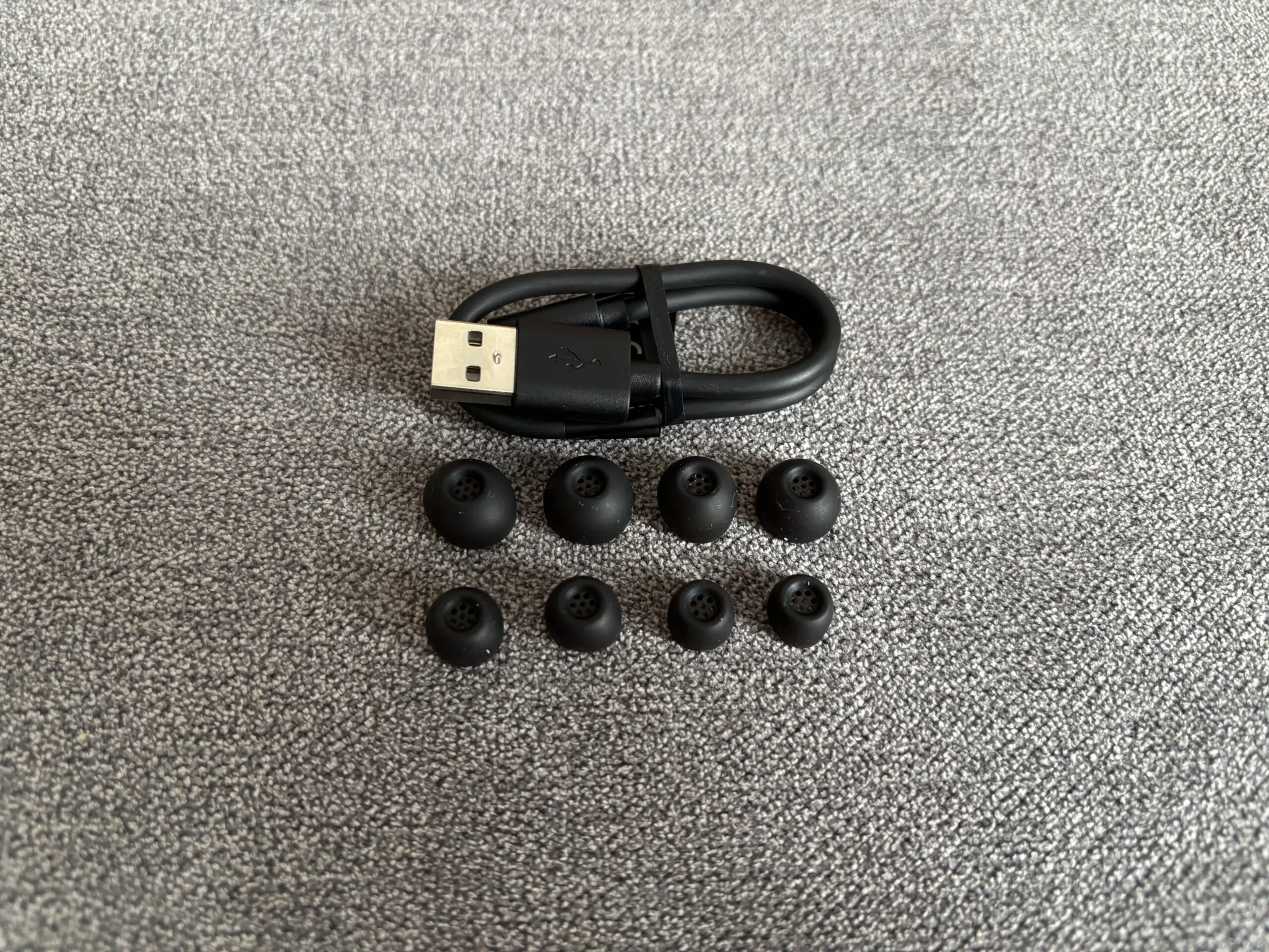 Wewnątrz opakowania wita nas czarna gąbka zabezpieczająca. Pod nią znajdują się słuchawki a jeszcze niżej – dołączane akcesoria. Tych za wiele nie ma i ograniczają się do krótkiego kabelka do ładowania, dwóch książeczek oraz 4 par dodatkowych gumek.