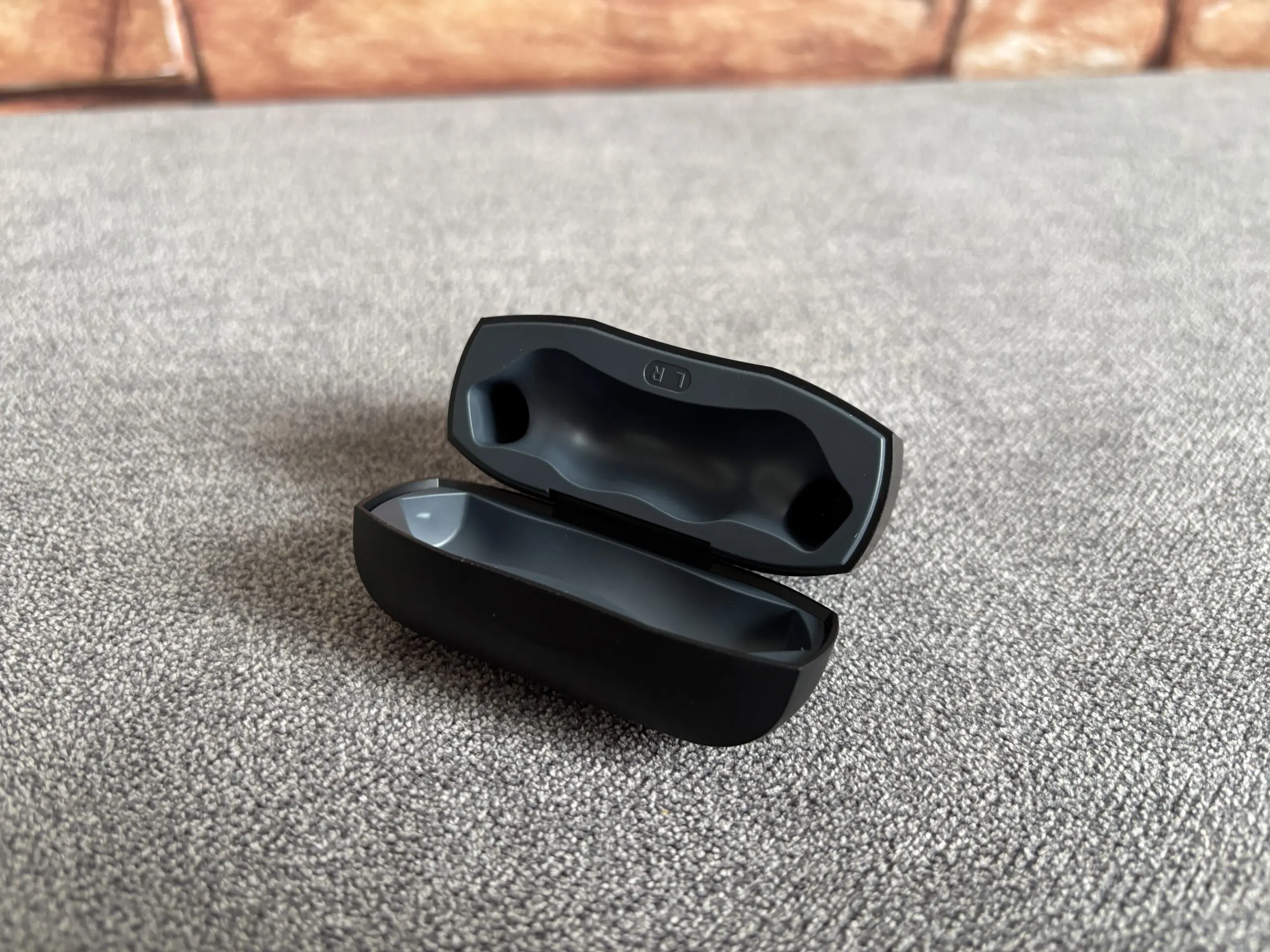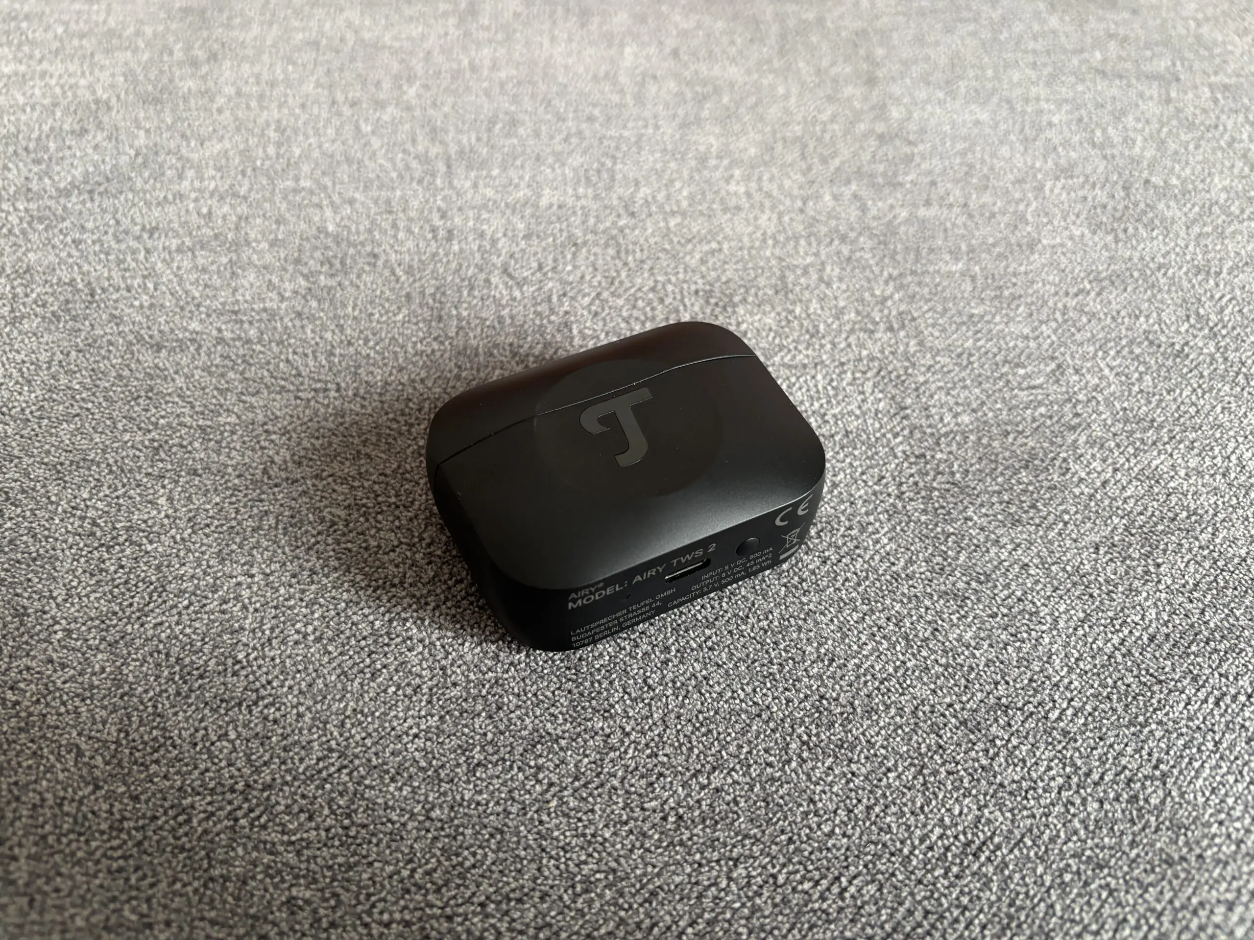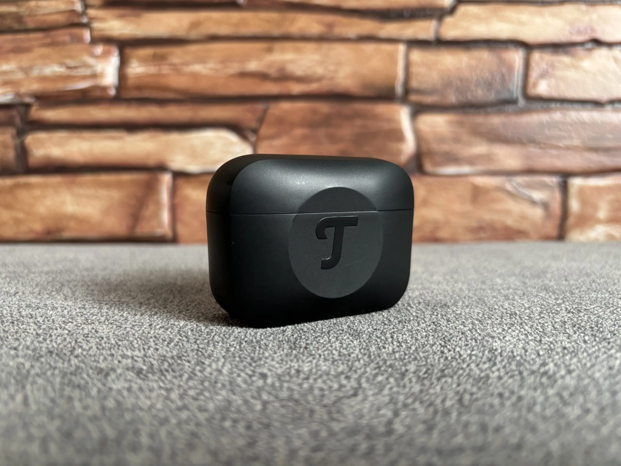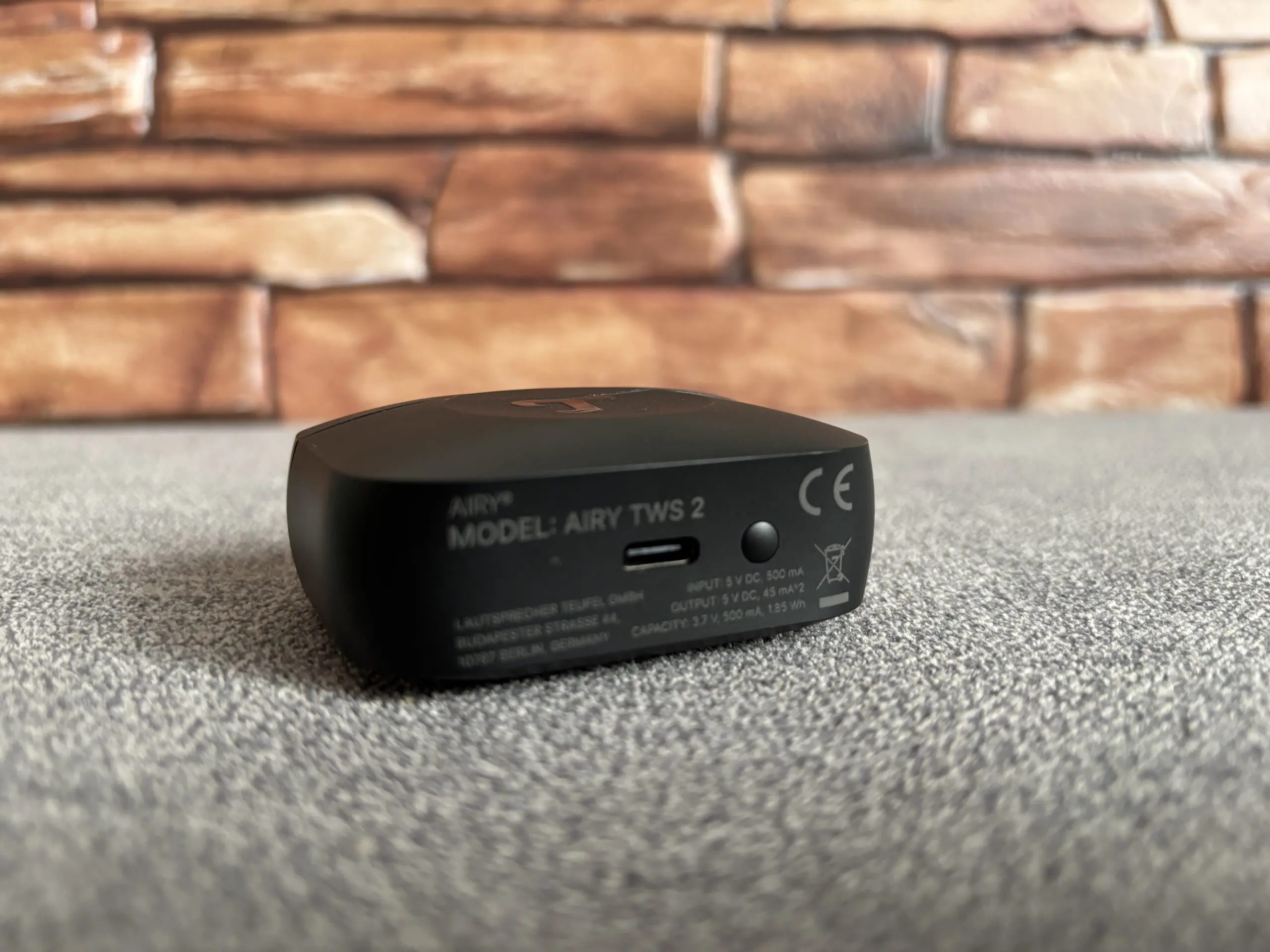 Jedną z największych różnic między generacjami jest wygląd etui. Zostało ono całkowicie przemodelowane i teraz jest szersze oraz cięższe. Przód etui ozdabia wytłoczone logo Teufel. Z frontu zniknął diodowy pasek led, który sygnalizował poziom naładowania akumulatora. Pojedyncza dioda została przeniesiona na spód i znajduje się po lewej stronie złącza USB-C. Po prawej stronie producent umieścił przycisk sterujący, którym można m.in. parować słuchawki z innym urządzeniem. Ze spodu etui można odczytać kilka technicznych informacji: