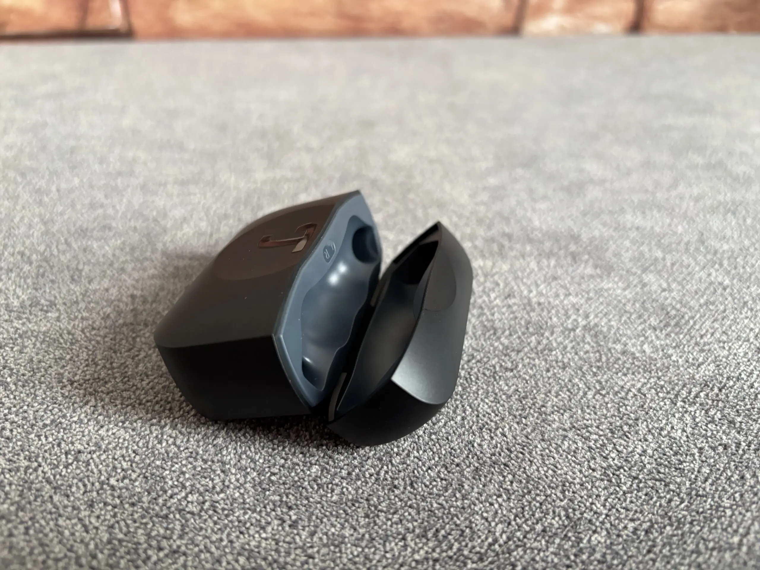 Na pleckach znajduje się zawias klapki. Co ciekawe, w drugiej generacji Airy TWS producent poprawił domykanie klapki, które w starszej wersji miało tendencję haczenia o wewnętrzną część. Wystarczyło delikatnie zaokrąglić wewnętrzną (szarą część) etui i problem znikł. W jedynce każdy z tych elementów był zaprojektowany na „ostro”. Wystarczył delikatny luz bądź zgięcie etui by klapka haczyła.