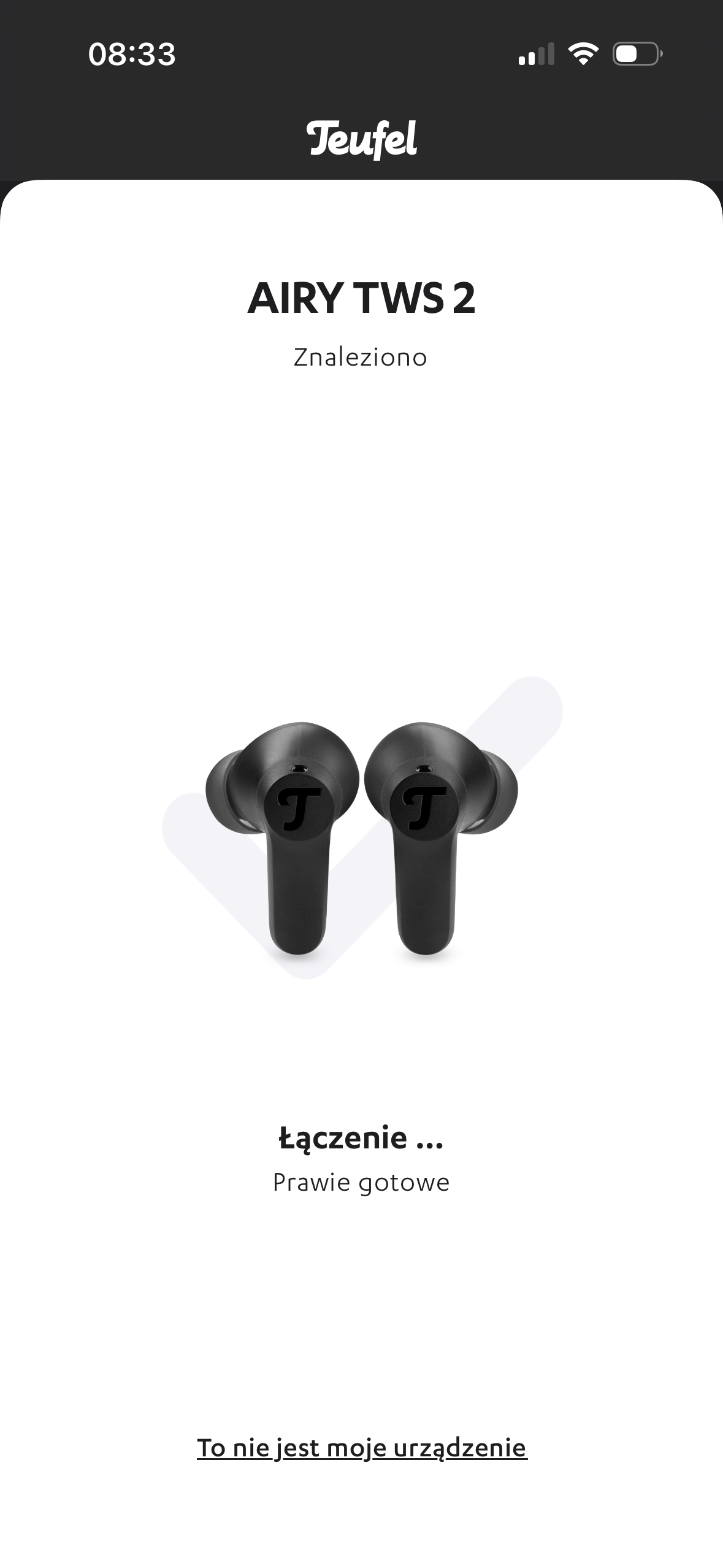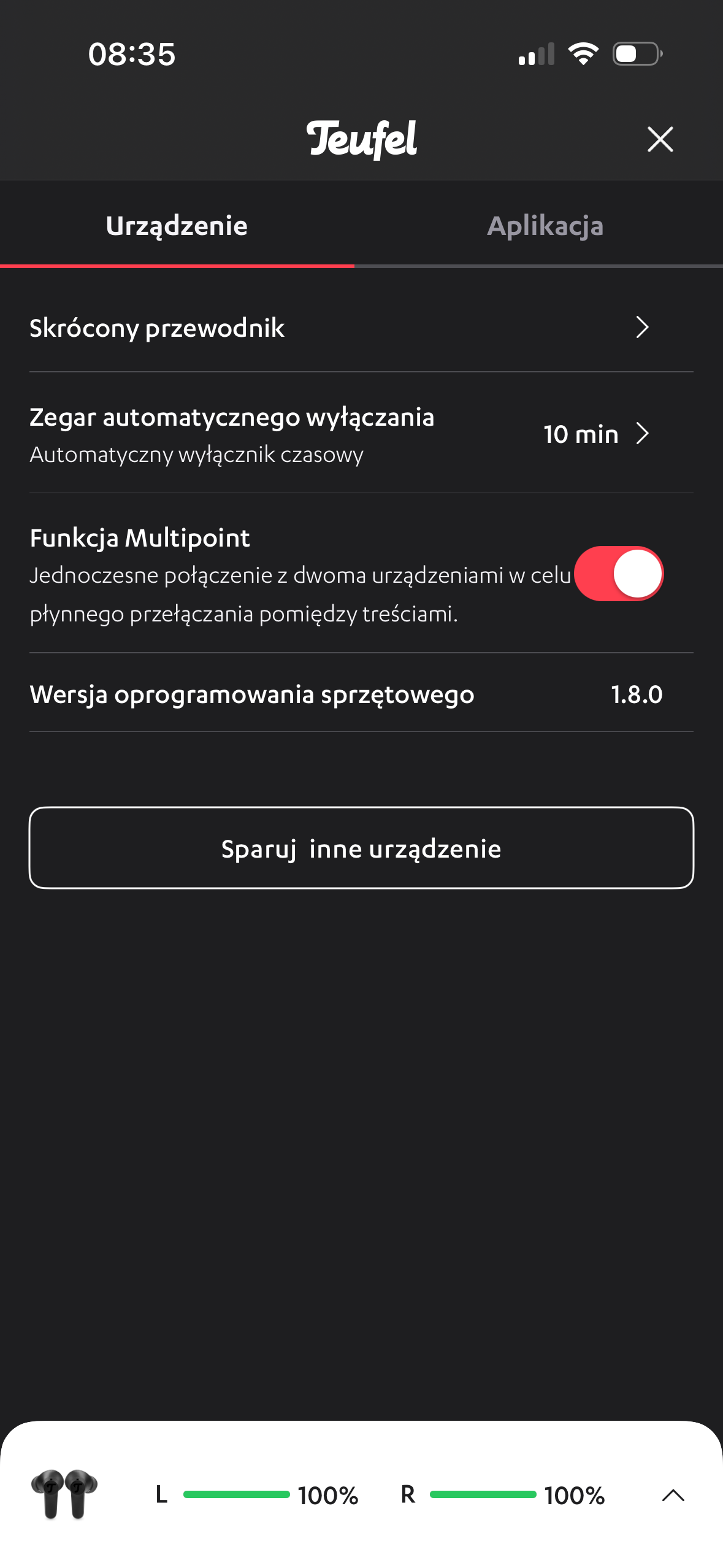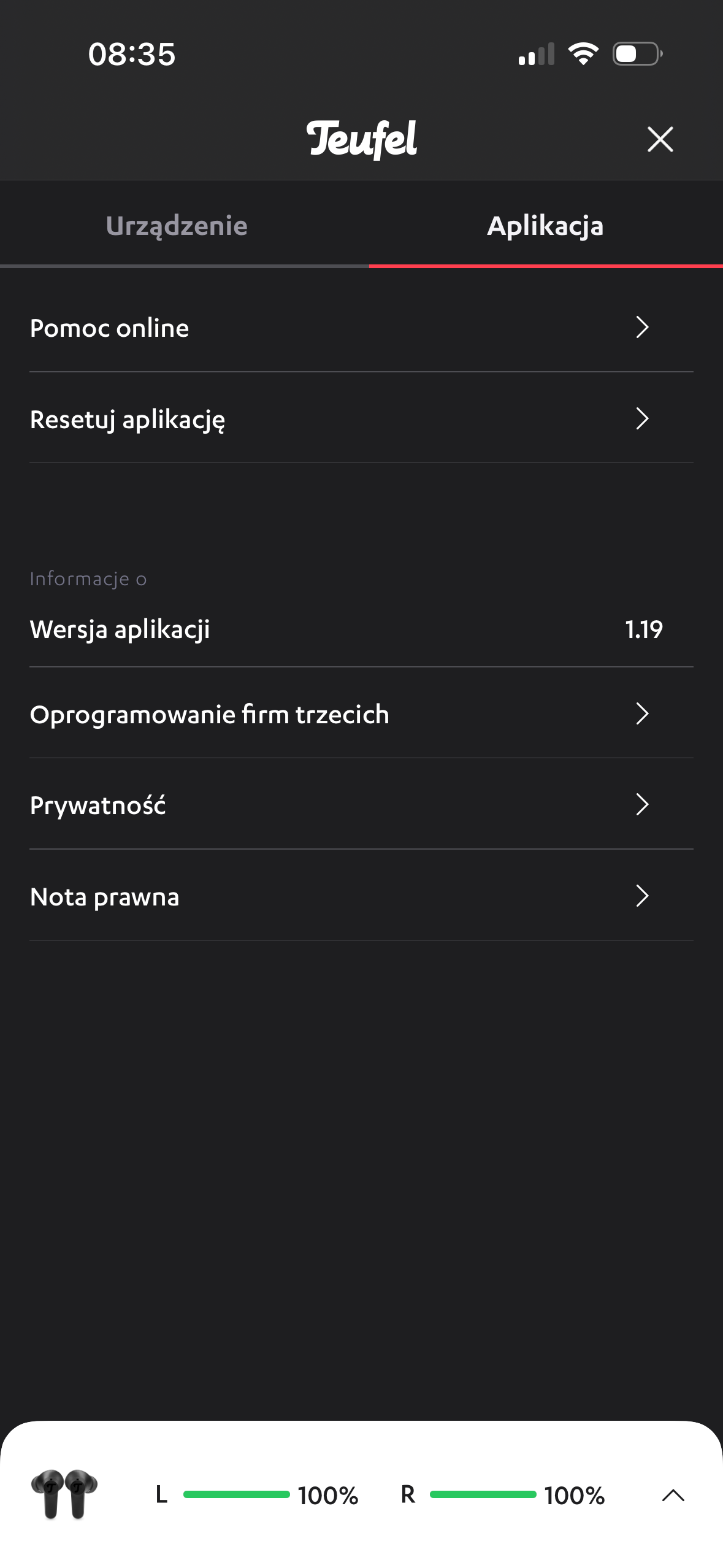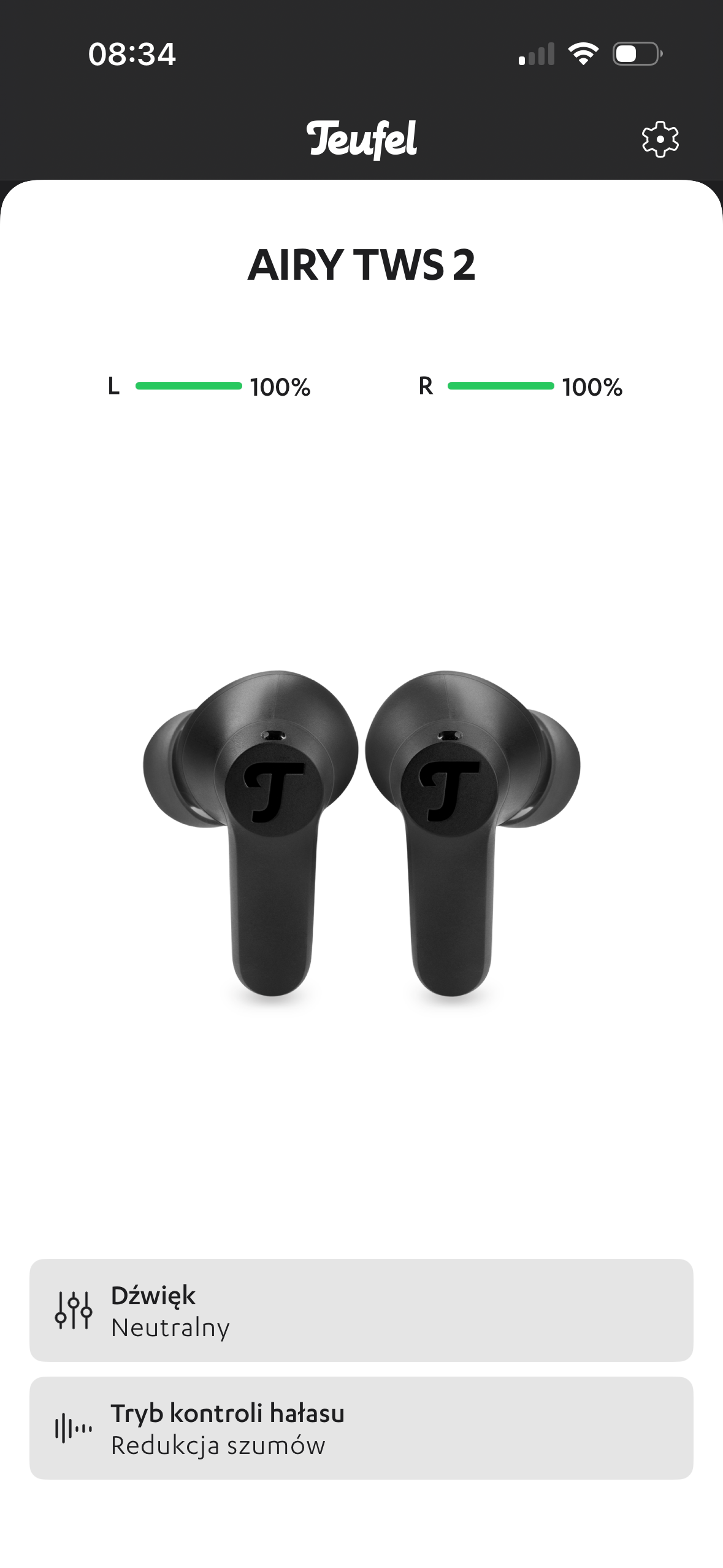 Dla drugiej generacji Airy TWS producent przygotował aplikację na telefon – Teufel Go. Aplikacja jest prosta i czytelna. Umożliwia podgląd naładowania akumulatorów, zmianę EQ czy włączenie ANC.