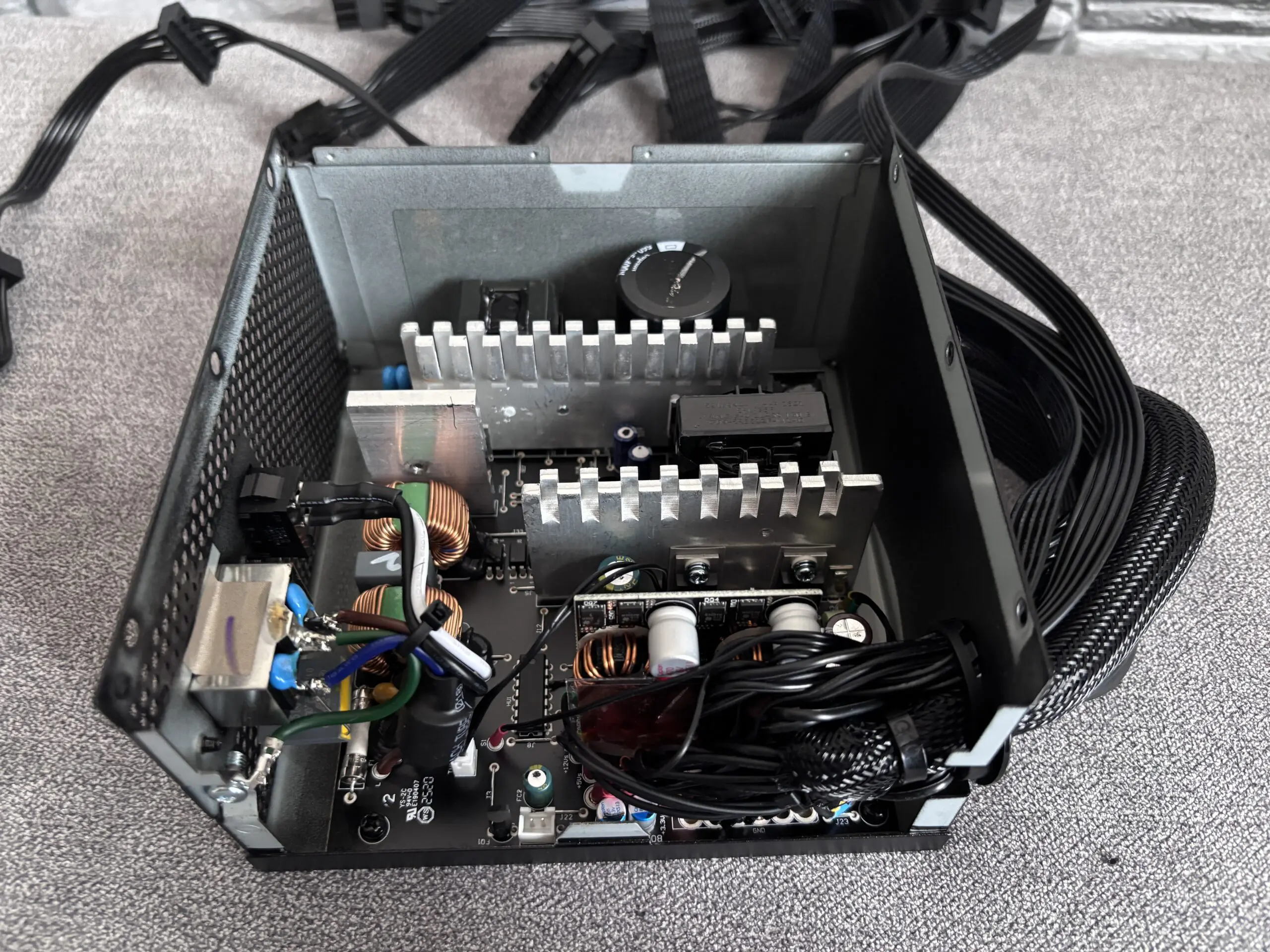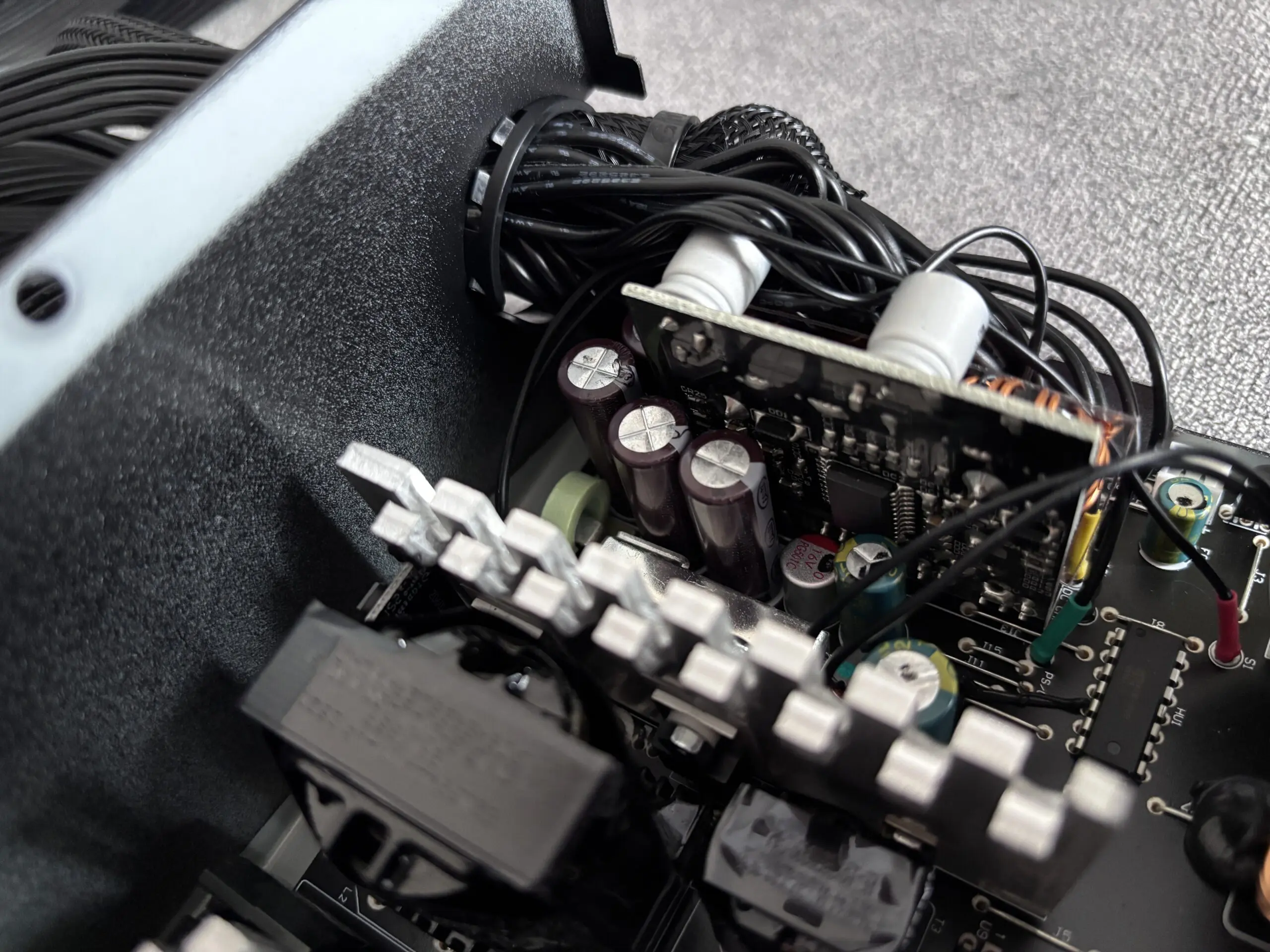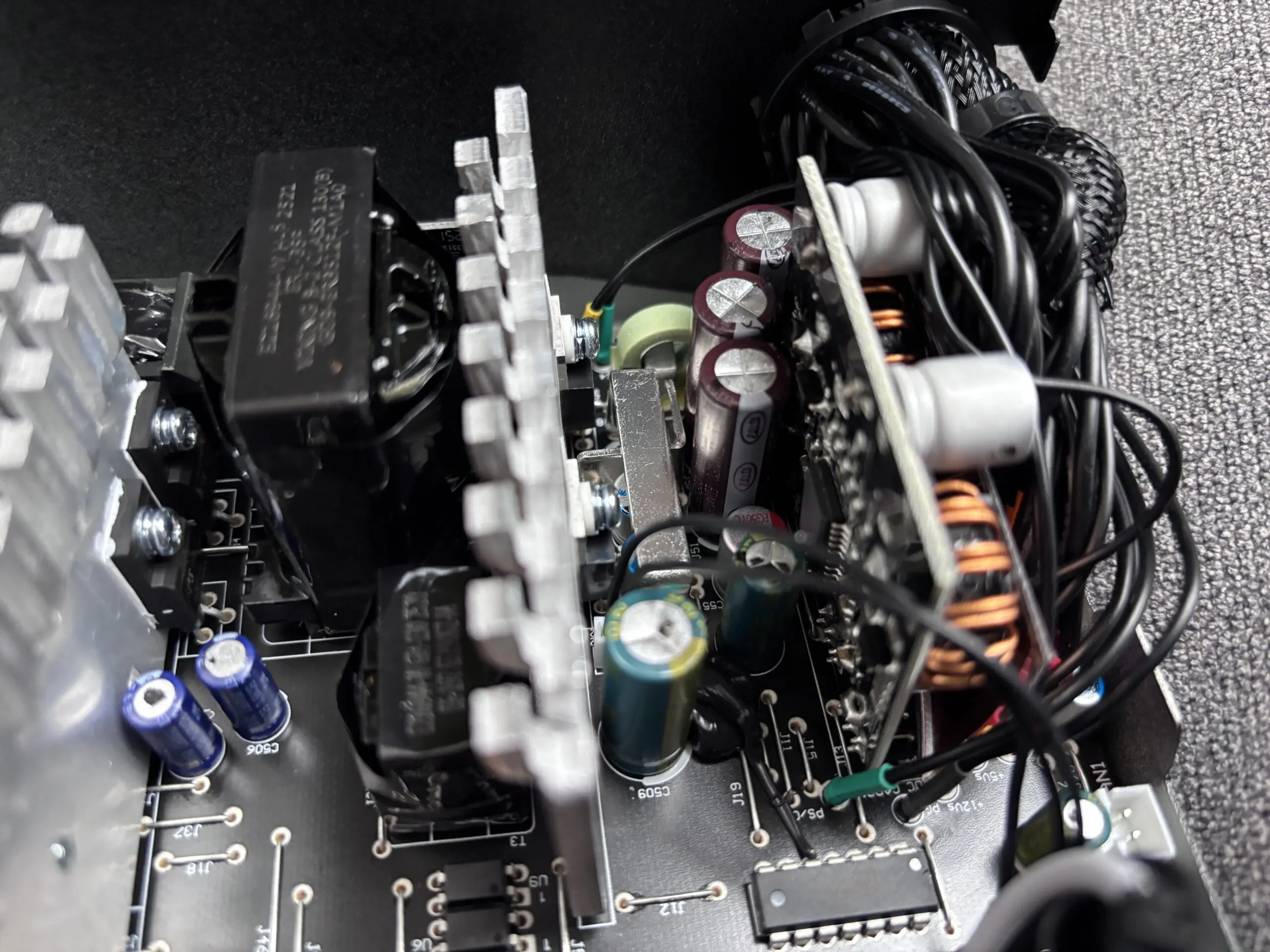 Pod transformatorem umieszczono sekcję prostowania linii 12 V z całkiem pokaźnym radiatorem. Tuż obok miejsca lutowania przewodów znajduje się przetwornica DC-DC oraz kilka kondensatorów polimerowych Capscona. Z kolei po stronie wtórnej producent zastosował mieszankę kondensatorów elektrolitycznych Elite i Jun Fu. Nie zabrakło też kolejnych polimerów Capscona. Wszystkie zastosowane kondensatory są przystosowane do pracy w temperaturze do 105 stopni Celsjusza.