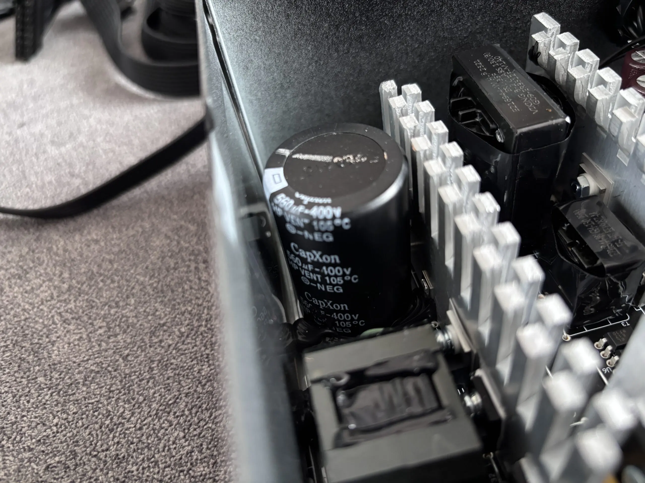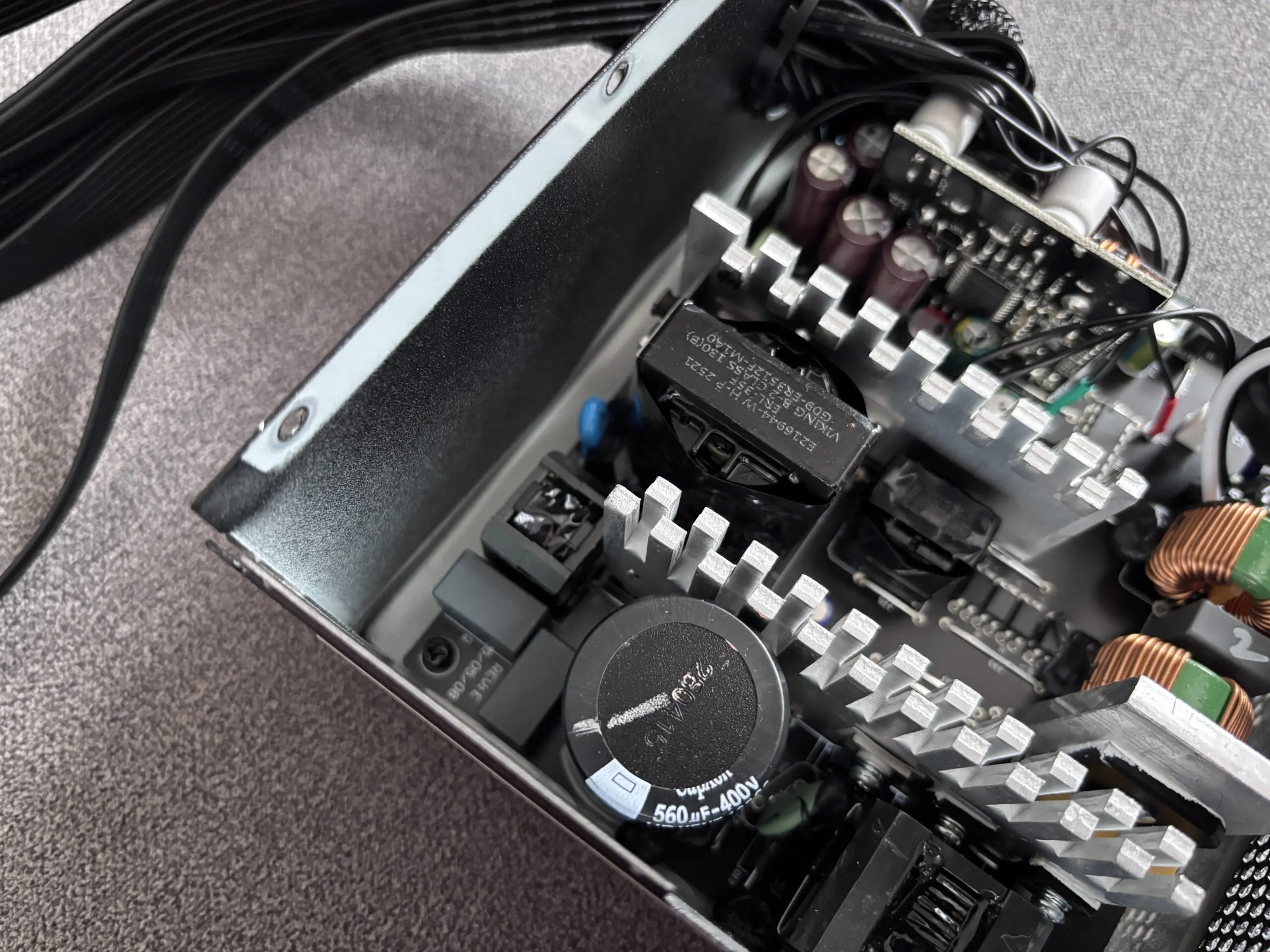 Wyżej producent umieścił radiatory mostka prostowniczego oraz sekcji APFC. W tej części znalazł się także główny kondensator Capscon 400 V o pojemności 560 uF, przystosowany do pracy w temperaturze do 105 stopni Celsjusza.