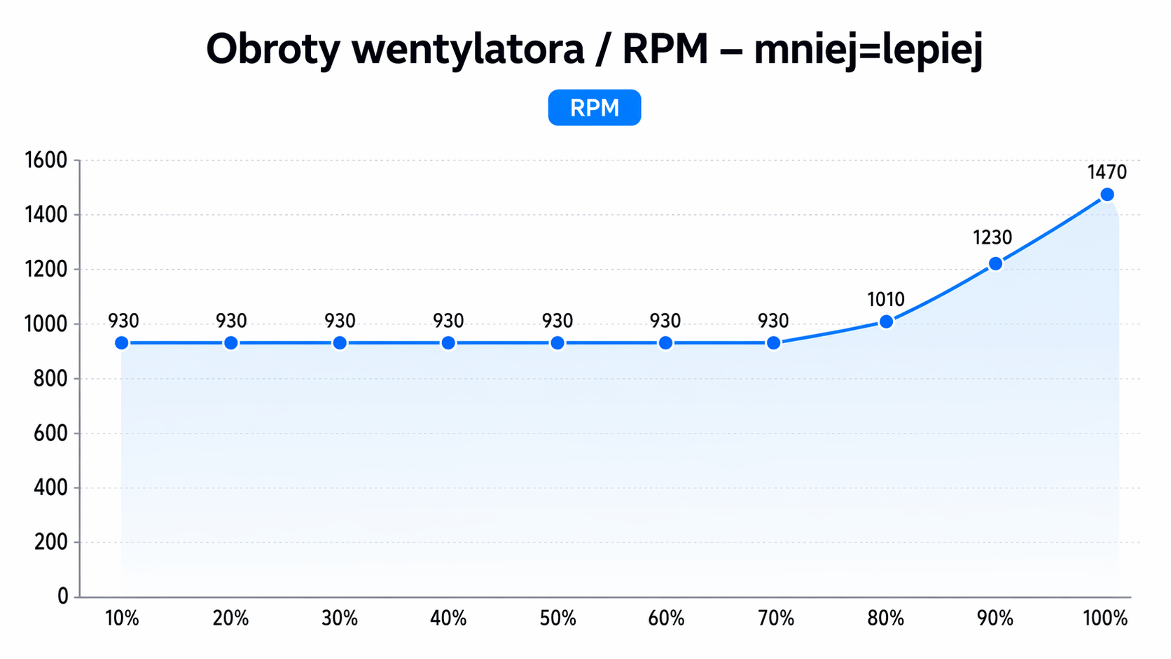 Sam fakt zastosowania 135 mm śmigła również działa na plus. To rozmiar, który pozwala połączyć przyzwoite chłodzenie z szansą na rozsądną kulturę pracy, o ile tylko krzywa sterowania nie została ustawiona zbyt agresywnie.