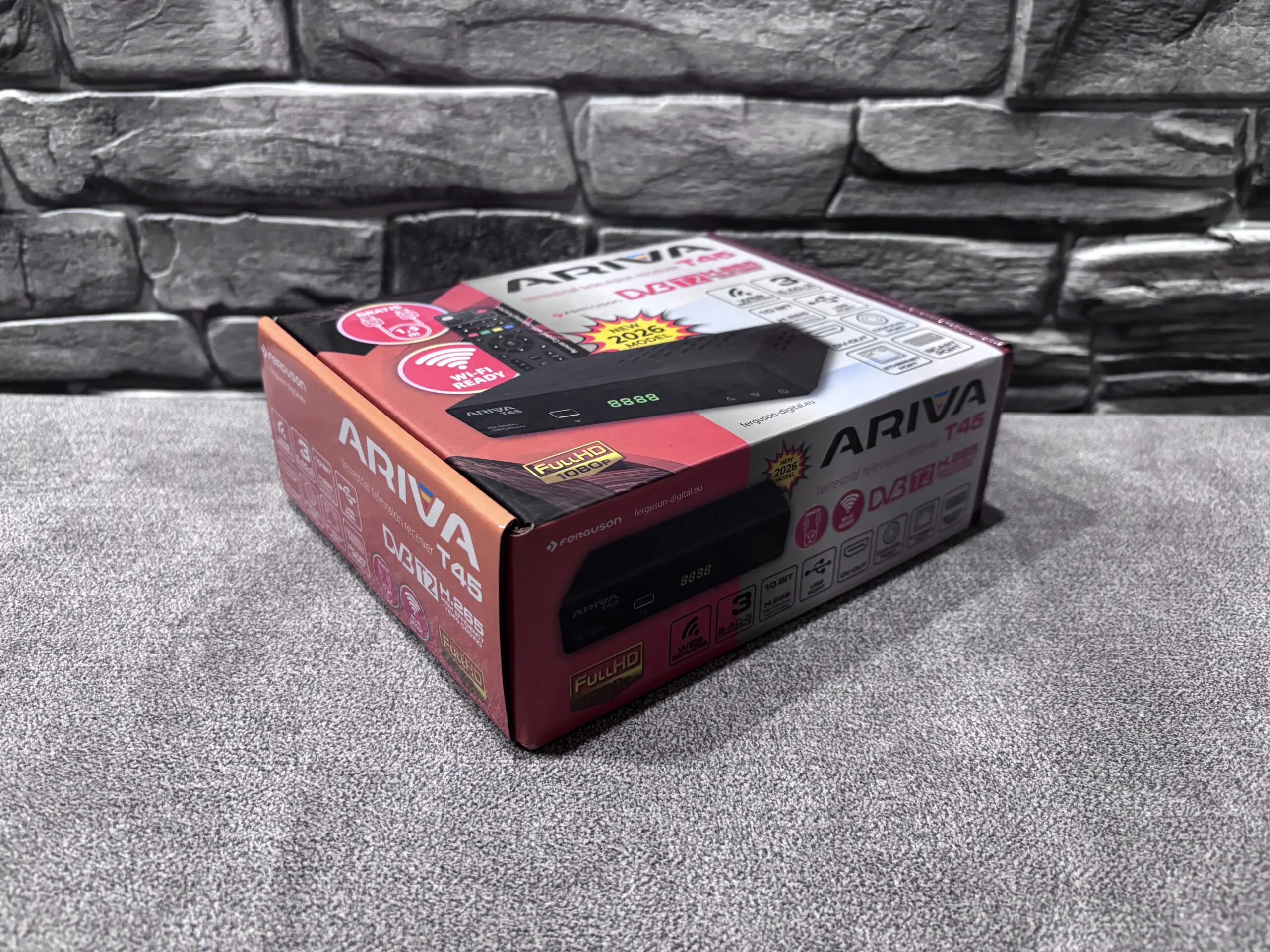 Ferguson Ariva T45 zapakowany jest w niewielkich rozmiarów kartonowe opakowanie, które utrzymane jest w szaro-pomarańczowej tonacji. Motywami przewodnimi są zdjęcia kupowanego tunera (występuje on na każdym boku) oraz wyszczególnione wszystkie najważniejsze funkcje, które ten tuner oferuje. Ilość wszelakiej informacji zapisanej na opakowaniu jest naprawdę duża dzięki czemu możemy się dokładnie zapoznać z możliwościami, które są oferowane przez „te czterdziestkę piątke”.